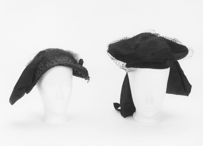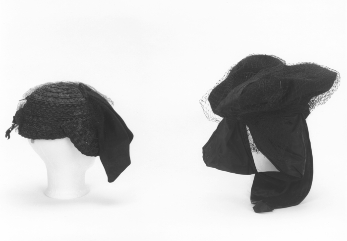 HATT Svart stråhatt med ripsbandsdekor. Svart fågel med huvud och vinge av fjäder. Märkt "Kungsmode Stockholm Humlegårdsgatan 6 tel 62 22 74". Har tillhört Ellen Roosval, f. von Hallwyl Gåva 1952 från professor Johnny Roosval (se protokoll 82 º5)