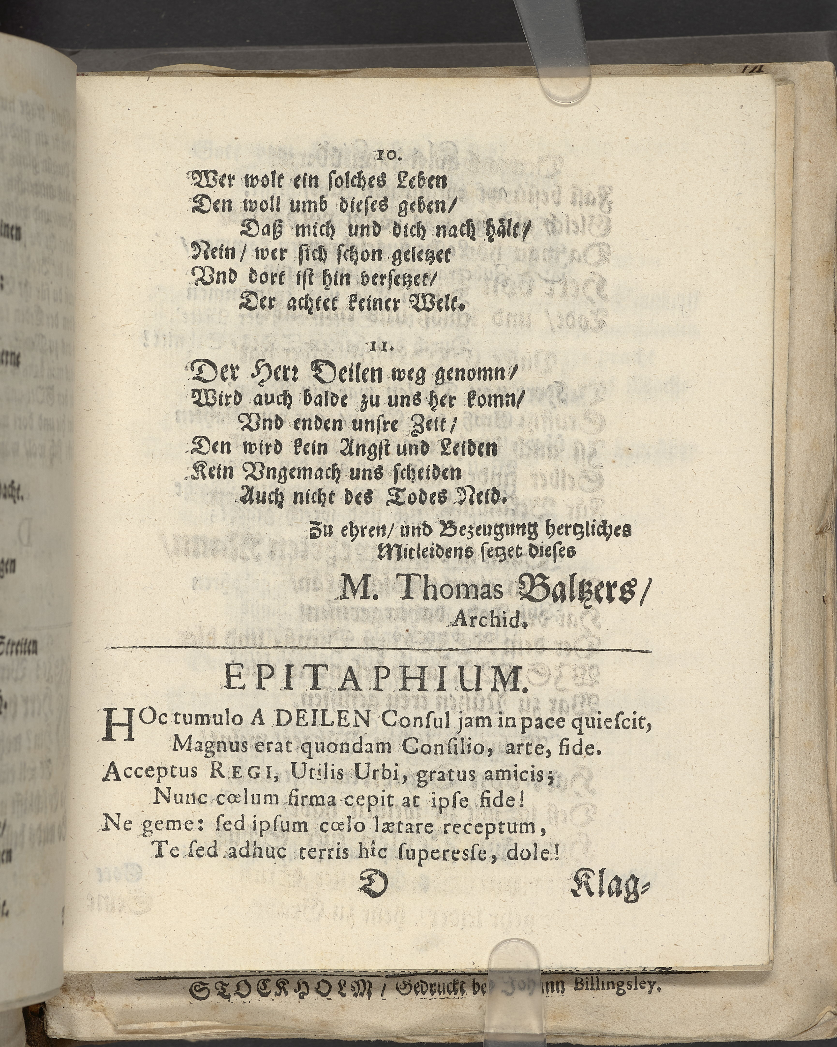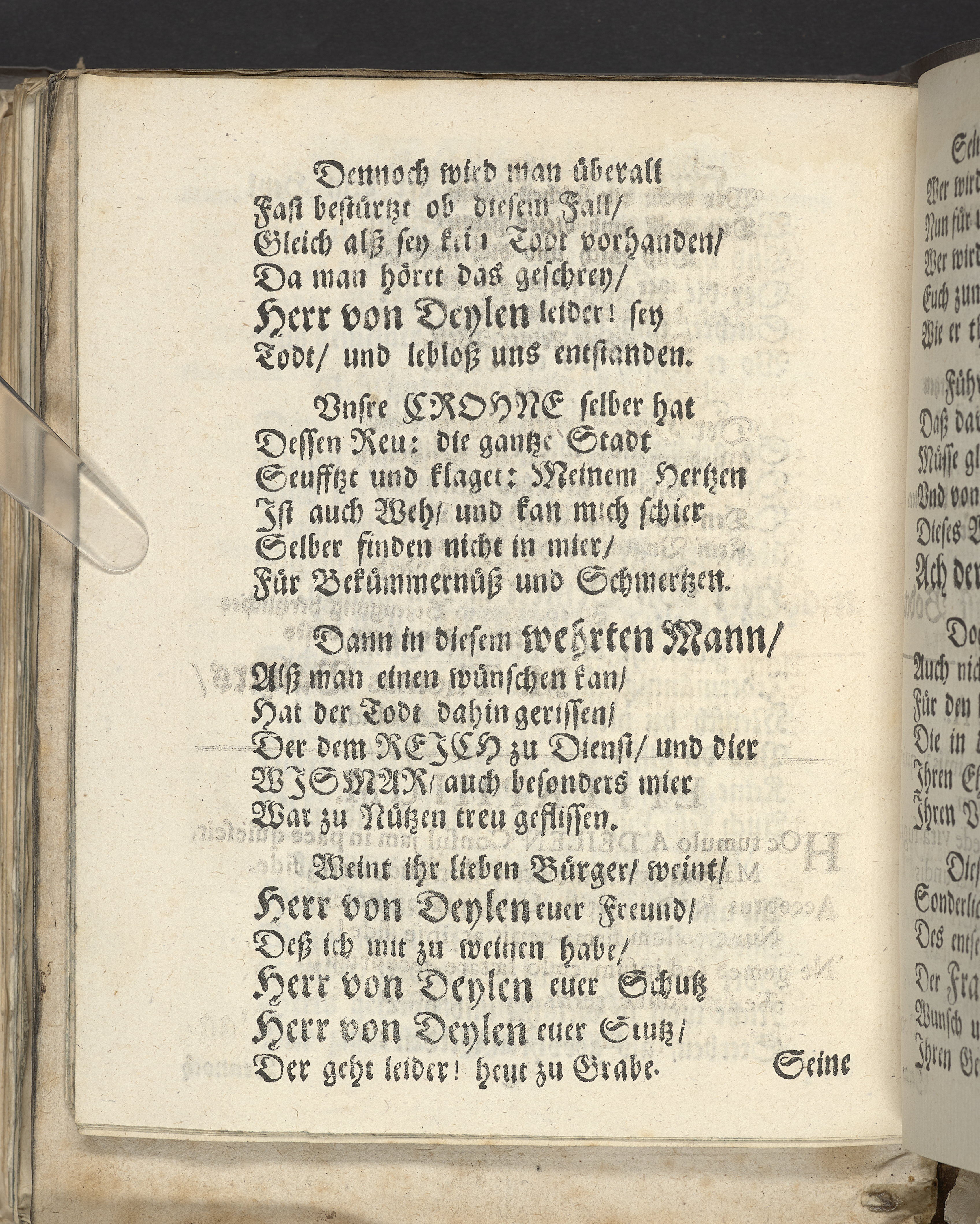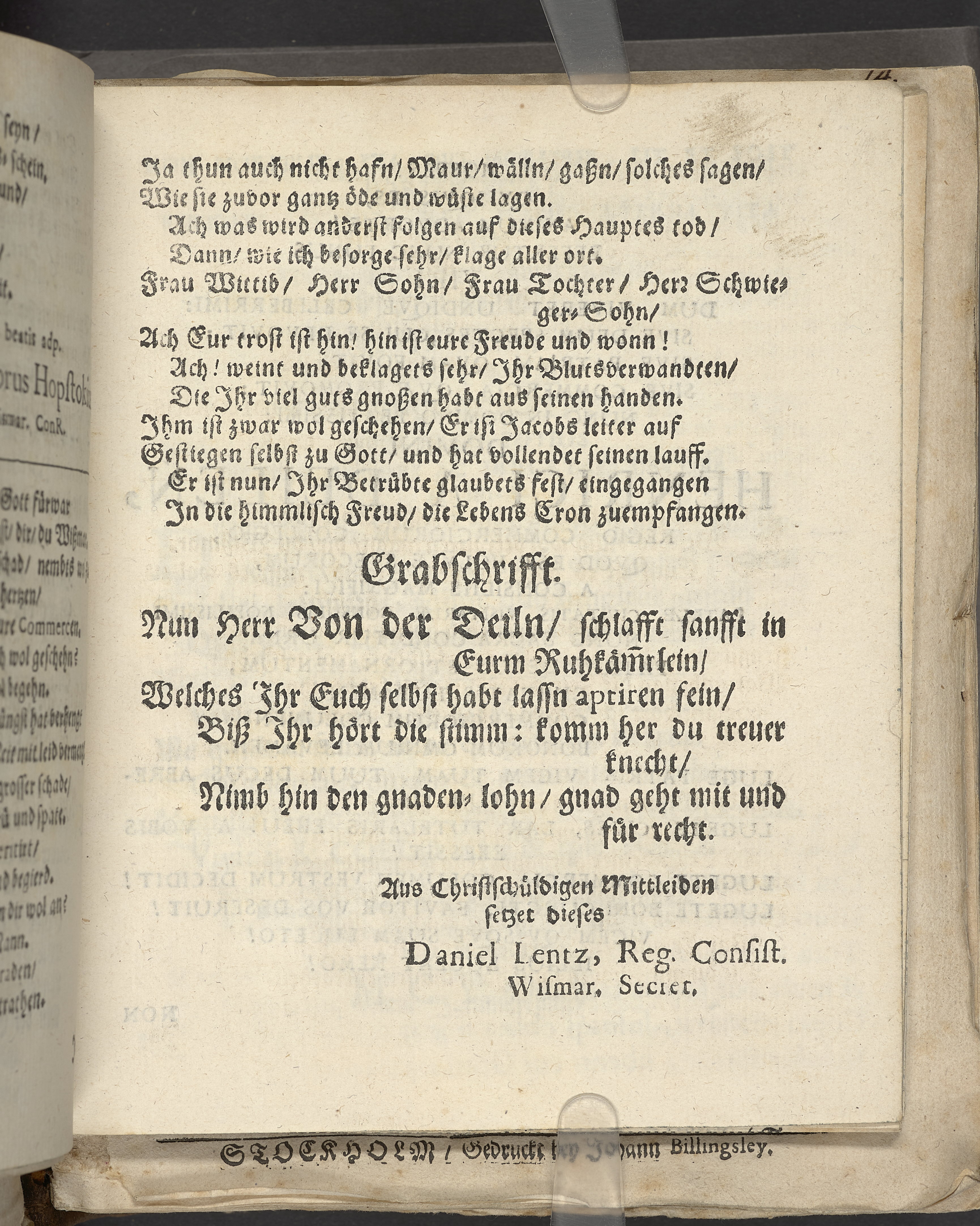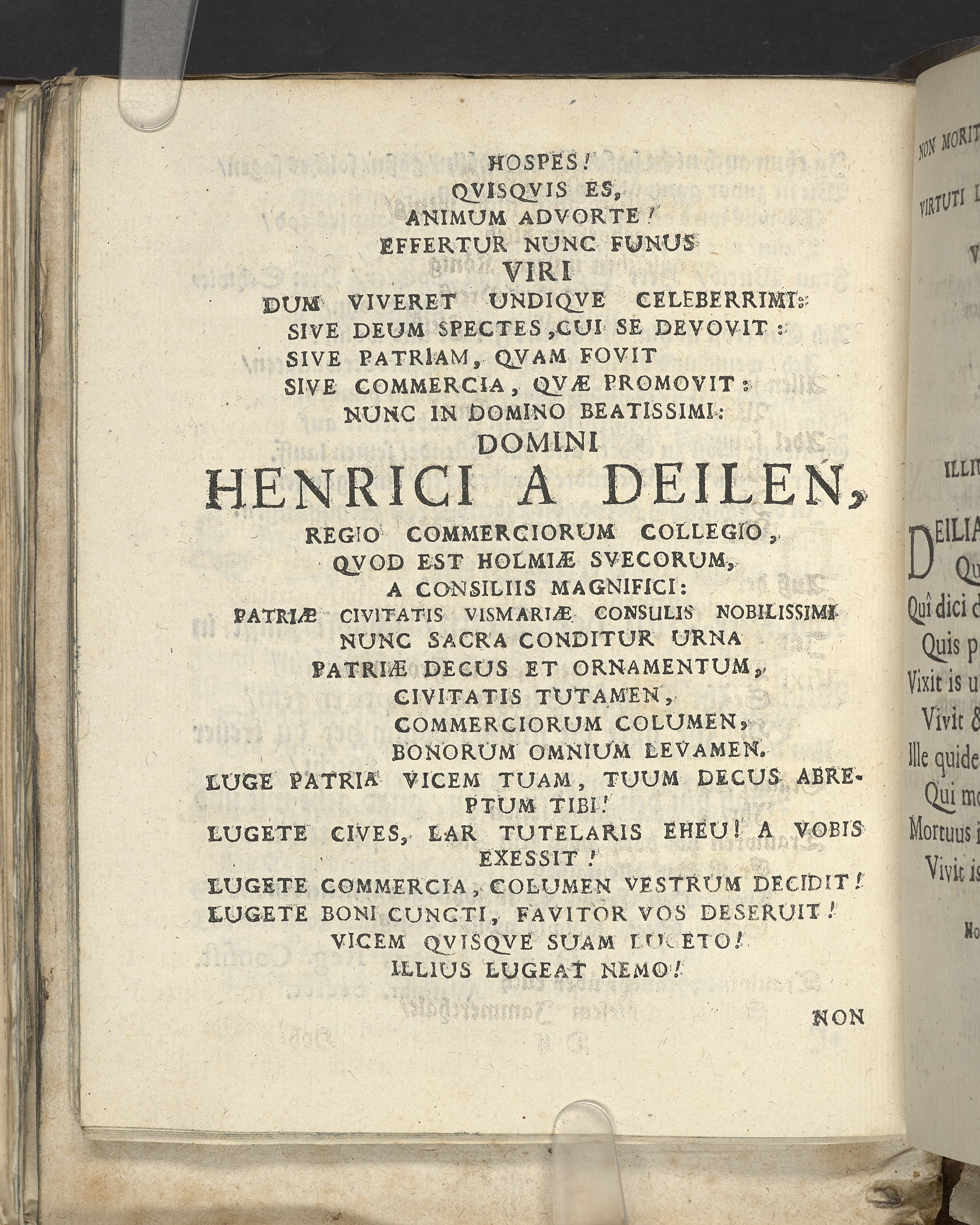 Bittere Traur-Klagen, und hertzliches mittleiden über ... Herrn Heinrich von der Deilen, Ihrer königl. Maytt. zu Schweden gewesenen Commercien-Rahts ... als derselbe am 21. Januarii, des 1666. Jahrs ... eingeschlaffen, und folgends den 25. April selbigen Jahrs mit adelichen Ceremonien in sein herrliches Erbbegräbnüsz, in der Pfarr-Kirchen zu St. Nicolai, beygesetzet wurde ... geführet von geehrten Herren, guten Freunden und Bekanten. Wiszmar, gedruckt bey Joachim-Georg Rheten.