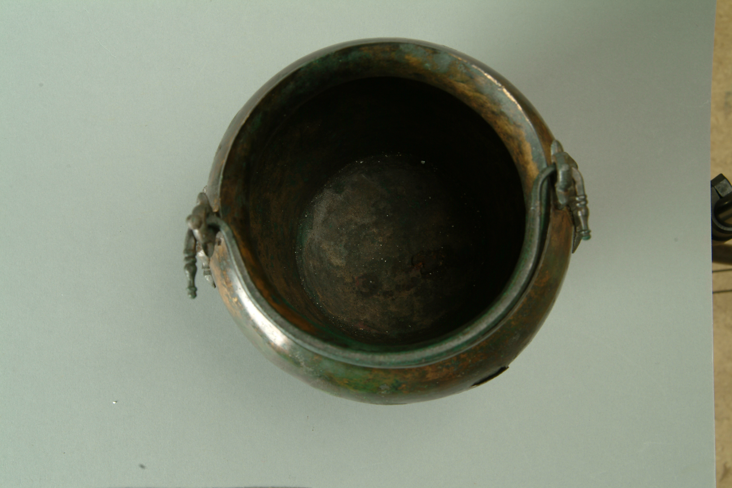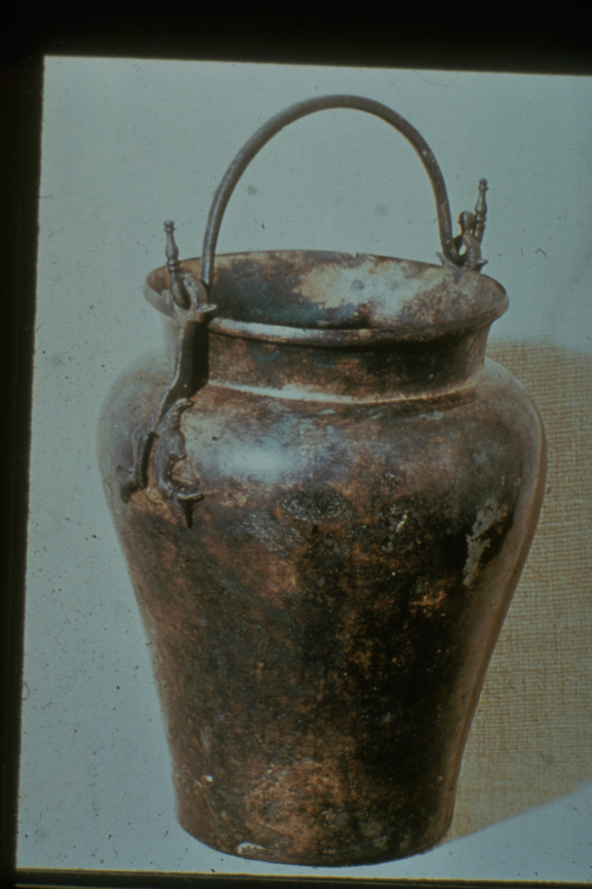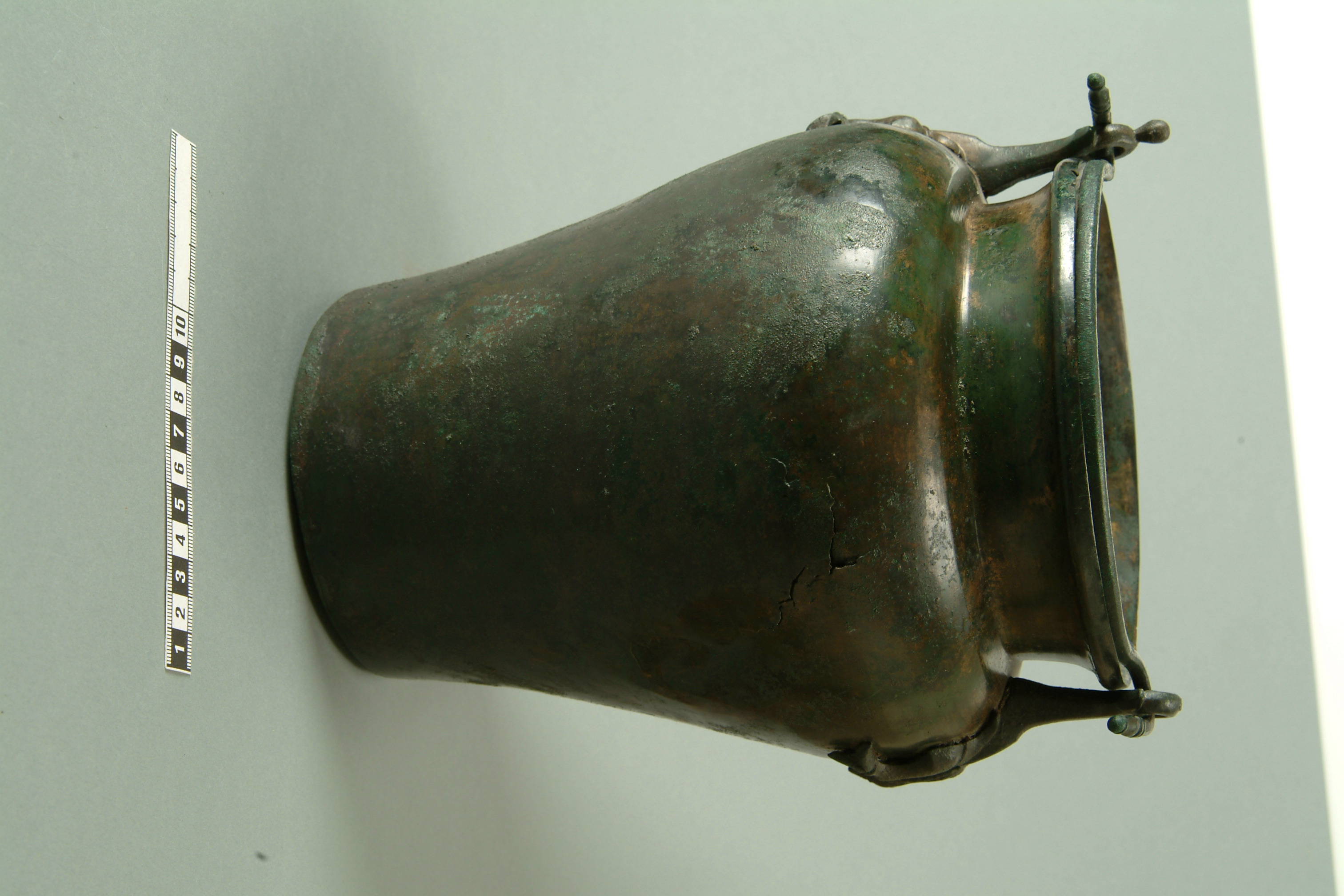 Situla av brons med delfinattacher. Slank med högt skulderparti och kraftigt indragen hals. Romerskt arbete. Lägg märke till att handtaget avslutas med en profilering som är identisk med de som finns på inhemska remändebeslag.