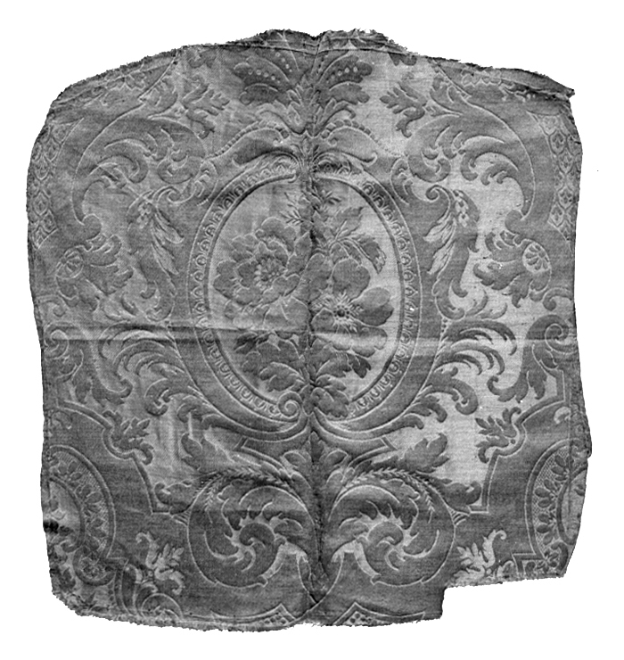 Stolklädsel, rygg. Av karminröd damastliknande halvsiden. Inköpt av Wilhelmina von Hallwyl i april 1894 hos antikhandlare Alessandro Scavini, Intra, för 20 lire.