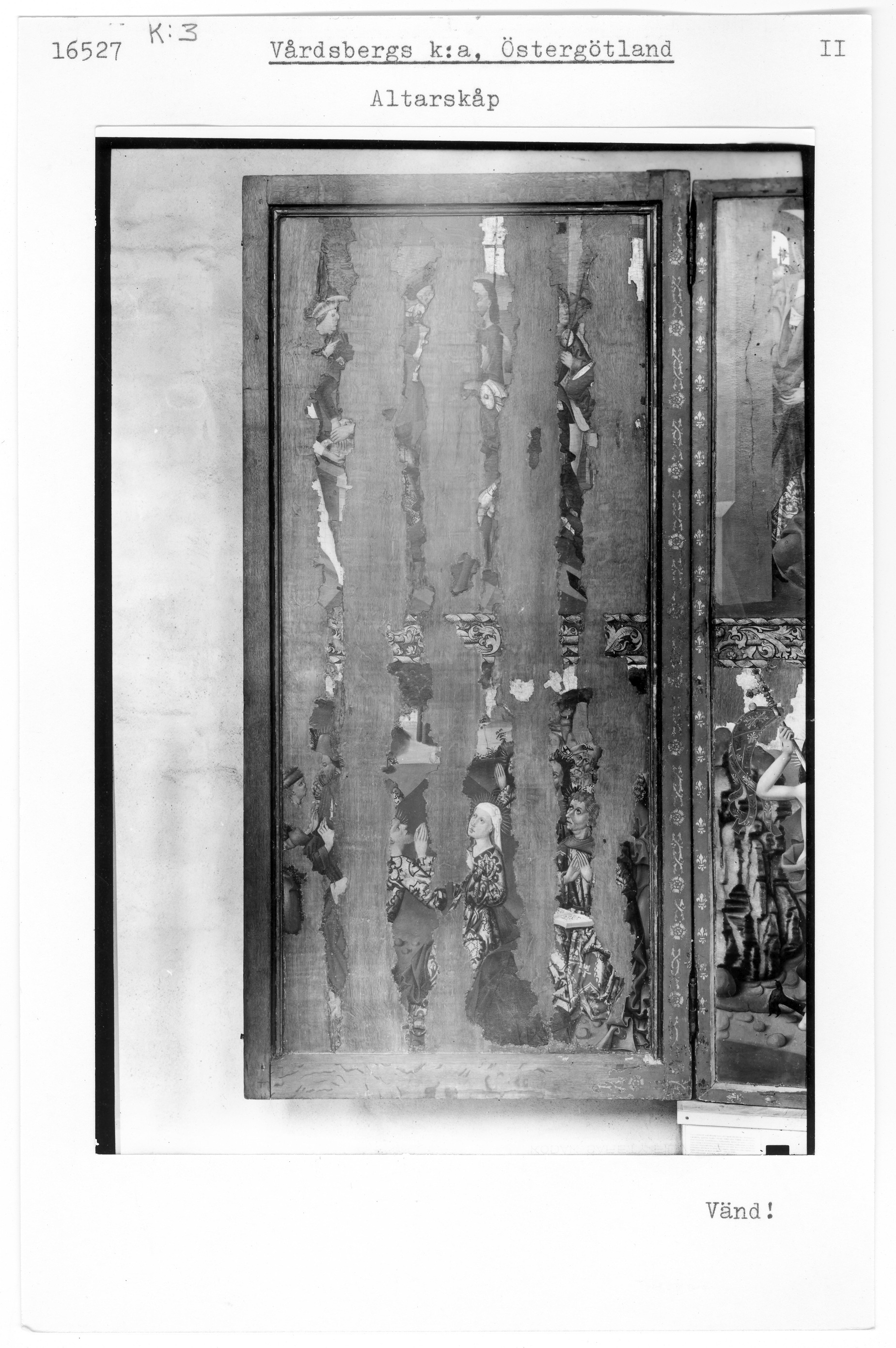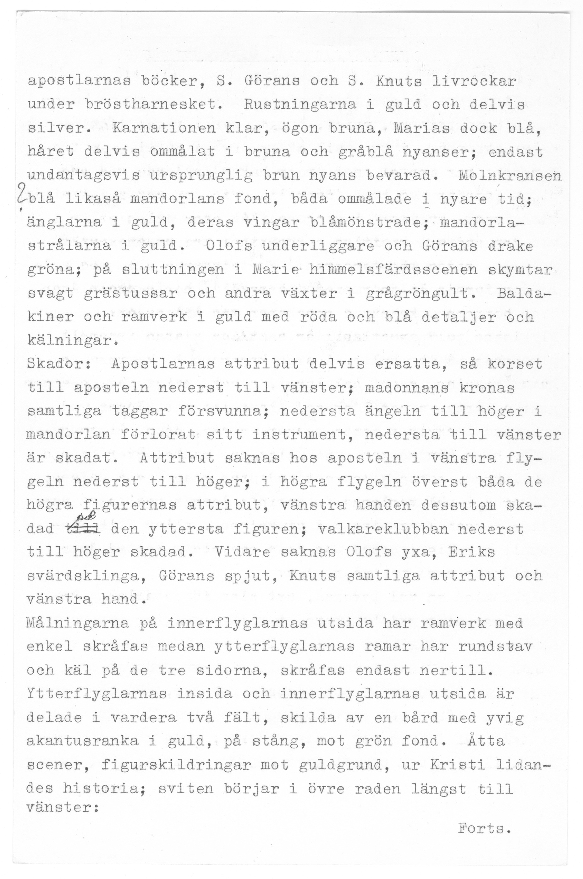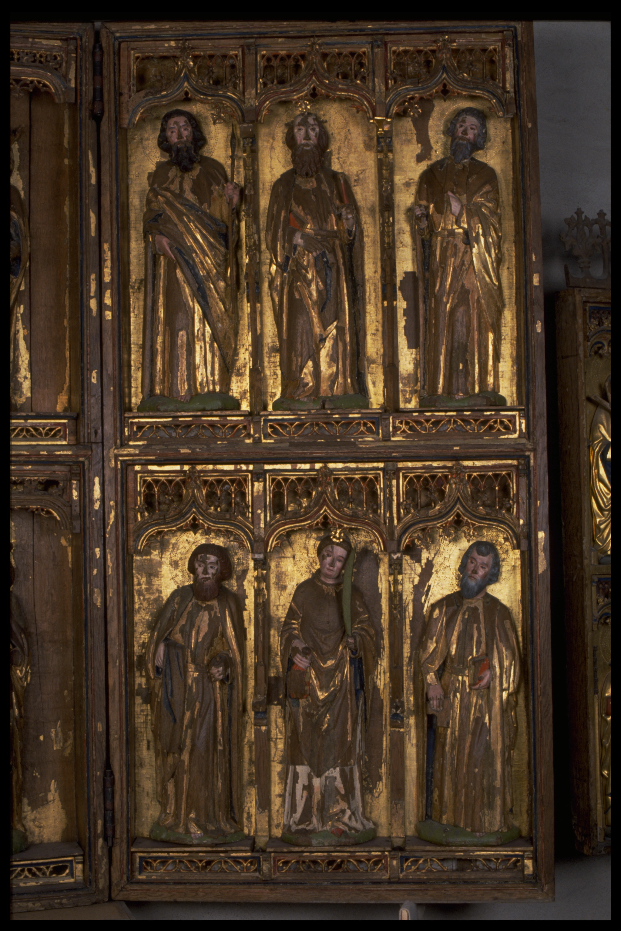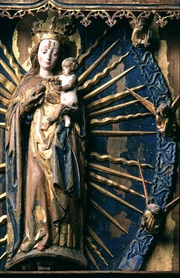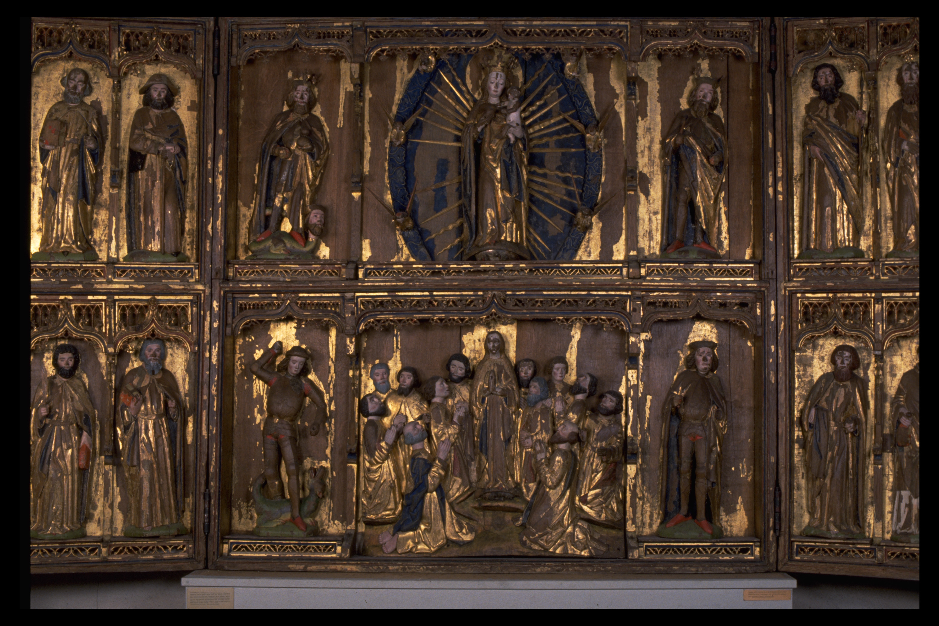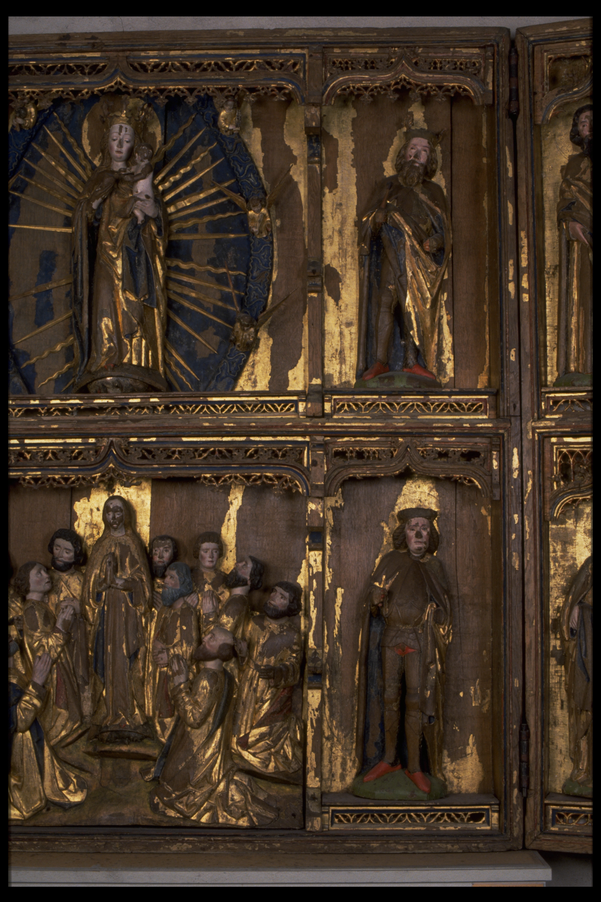 Kondition: flera attribut och några händer förlorade, Marias krona skadad och hennes mandorla starkt fragmentarisk. Färg: betydande fragment av skulpturens färg bevarade; huvudparten av målningarna ovanligt välbevarade, medan andra är nästan helt utplånad