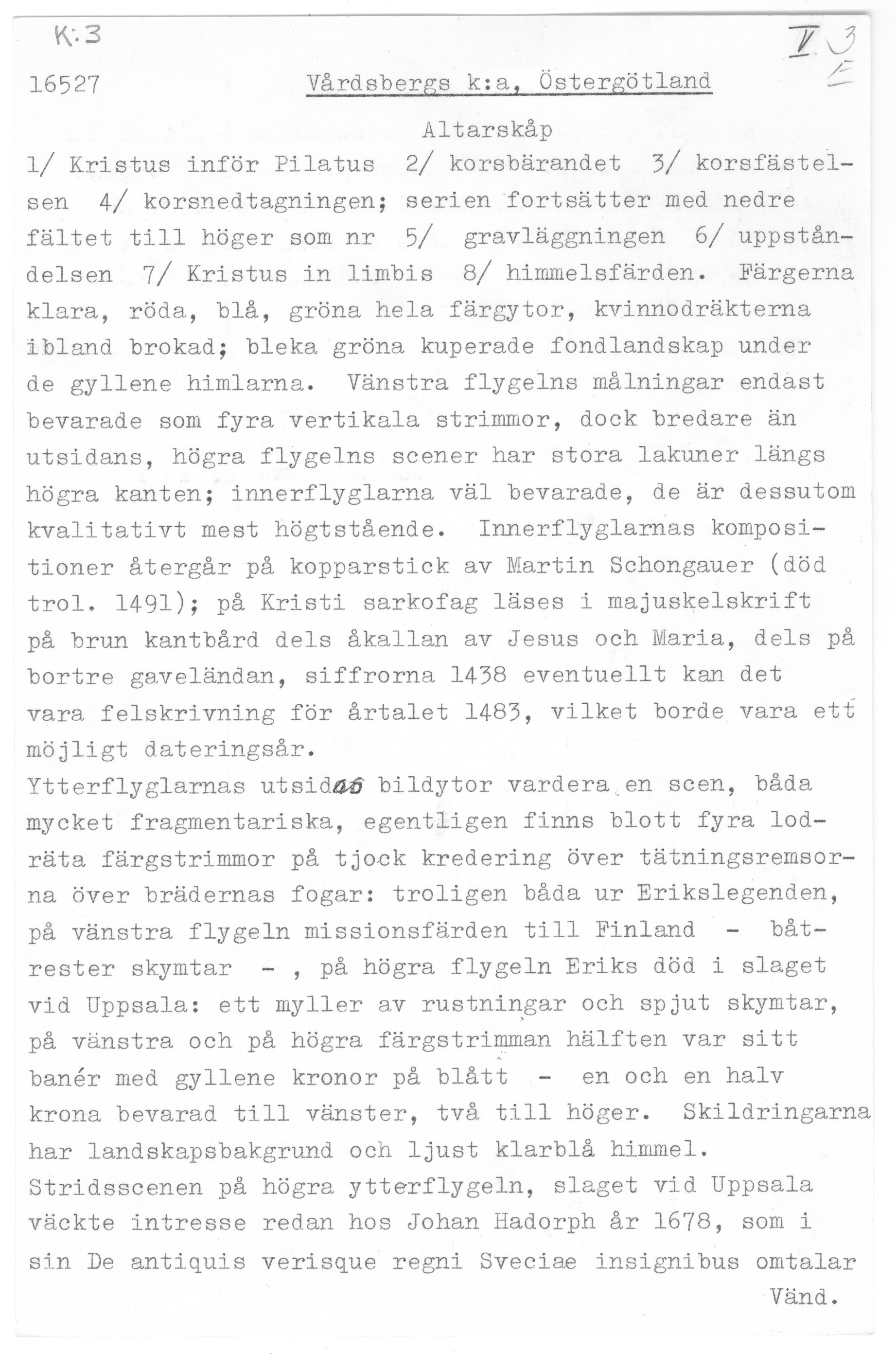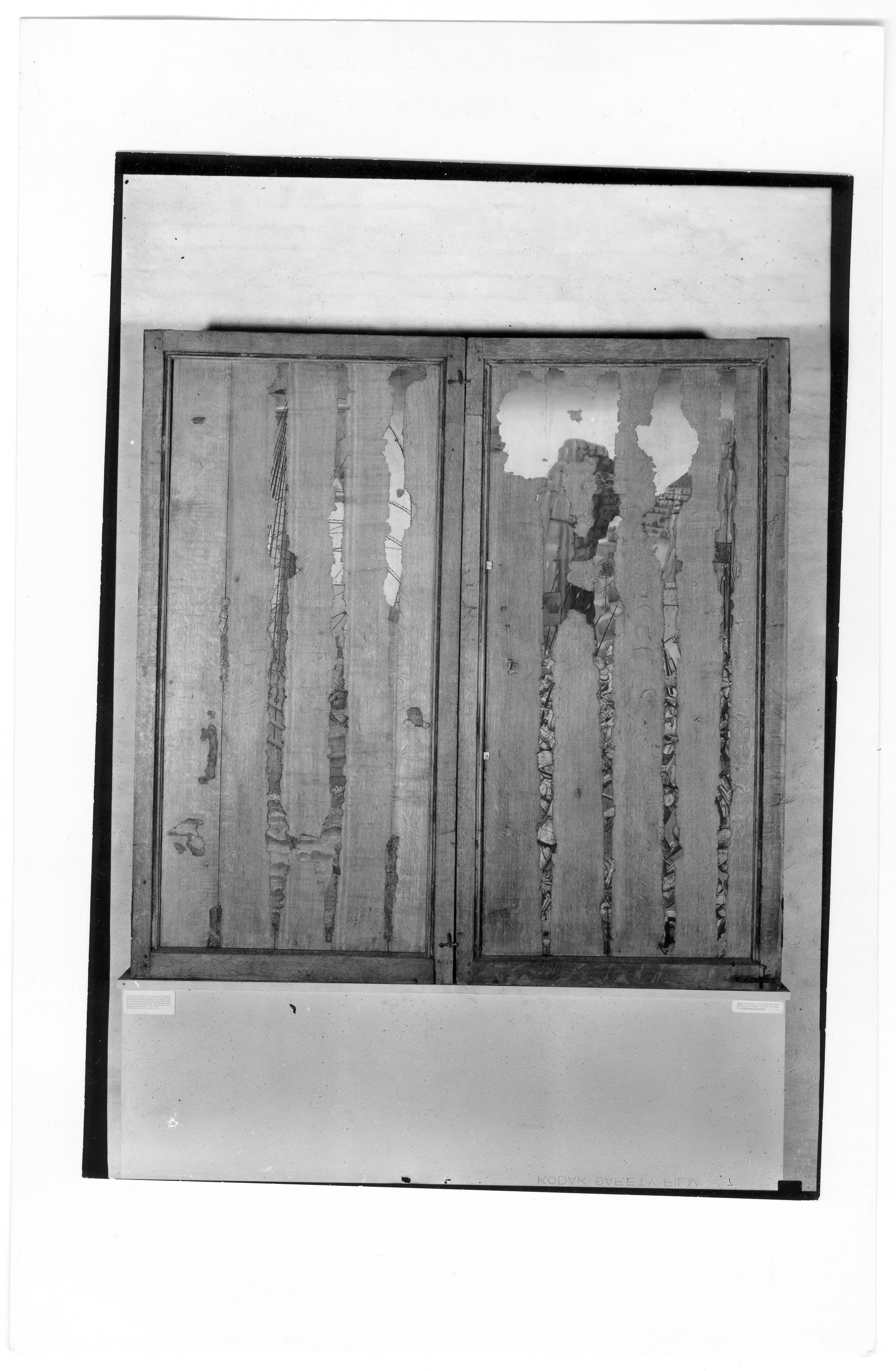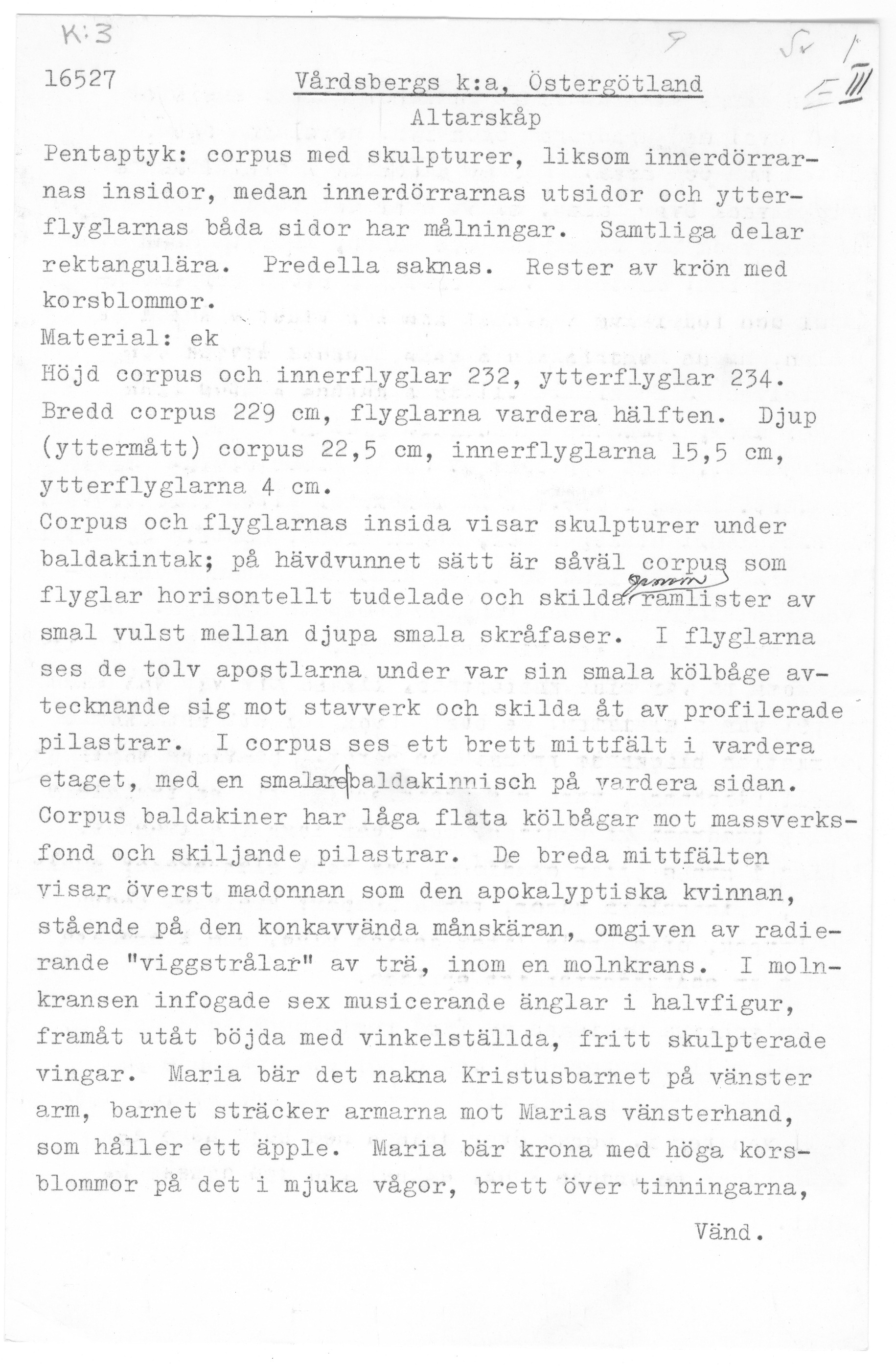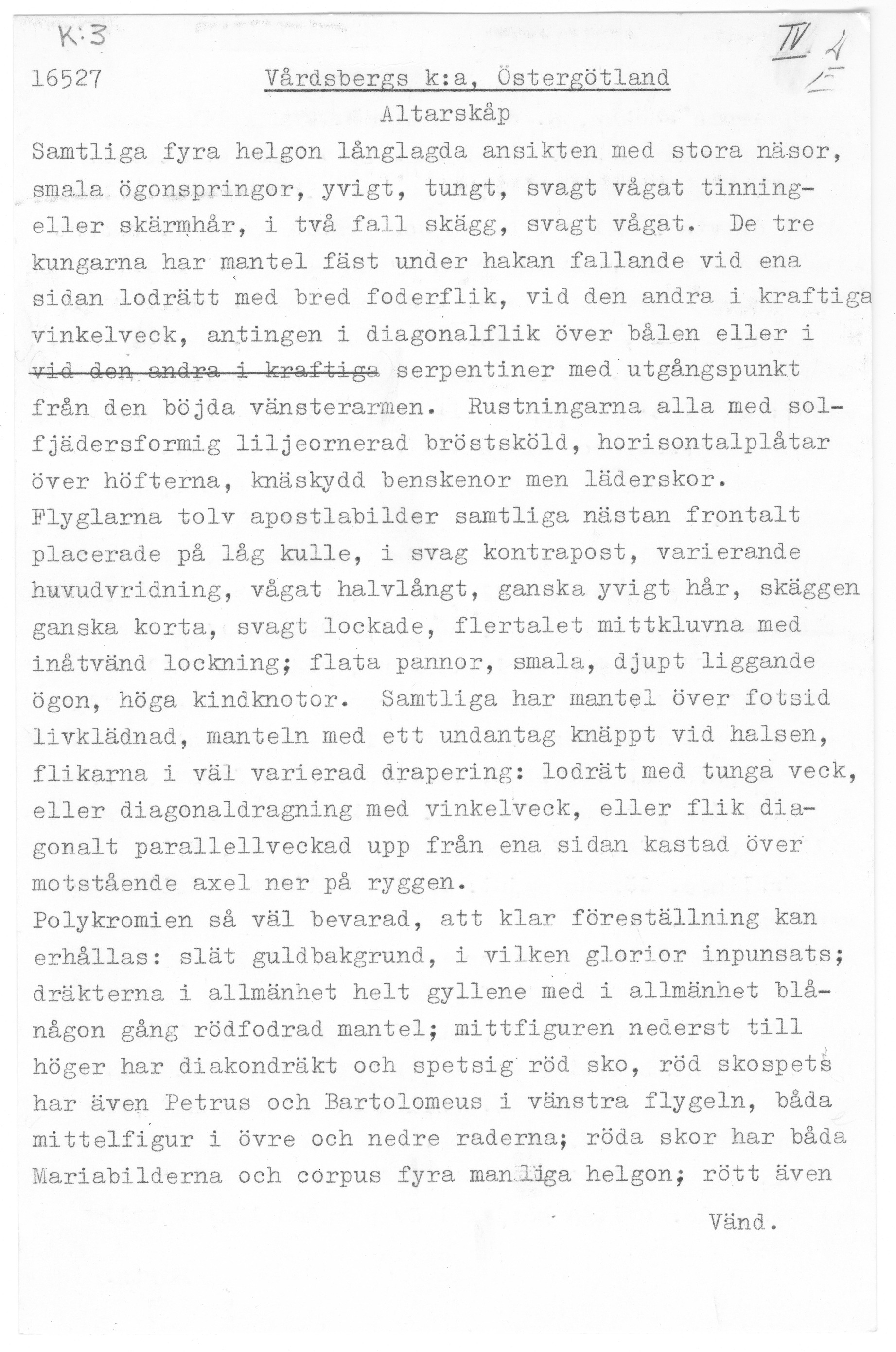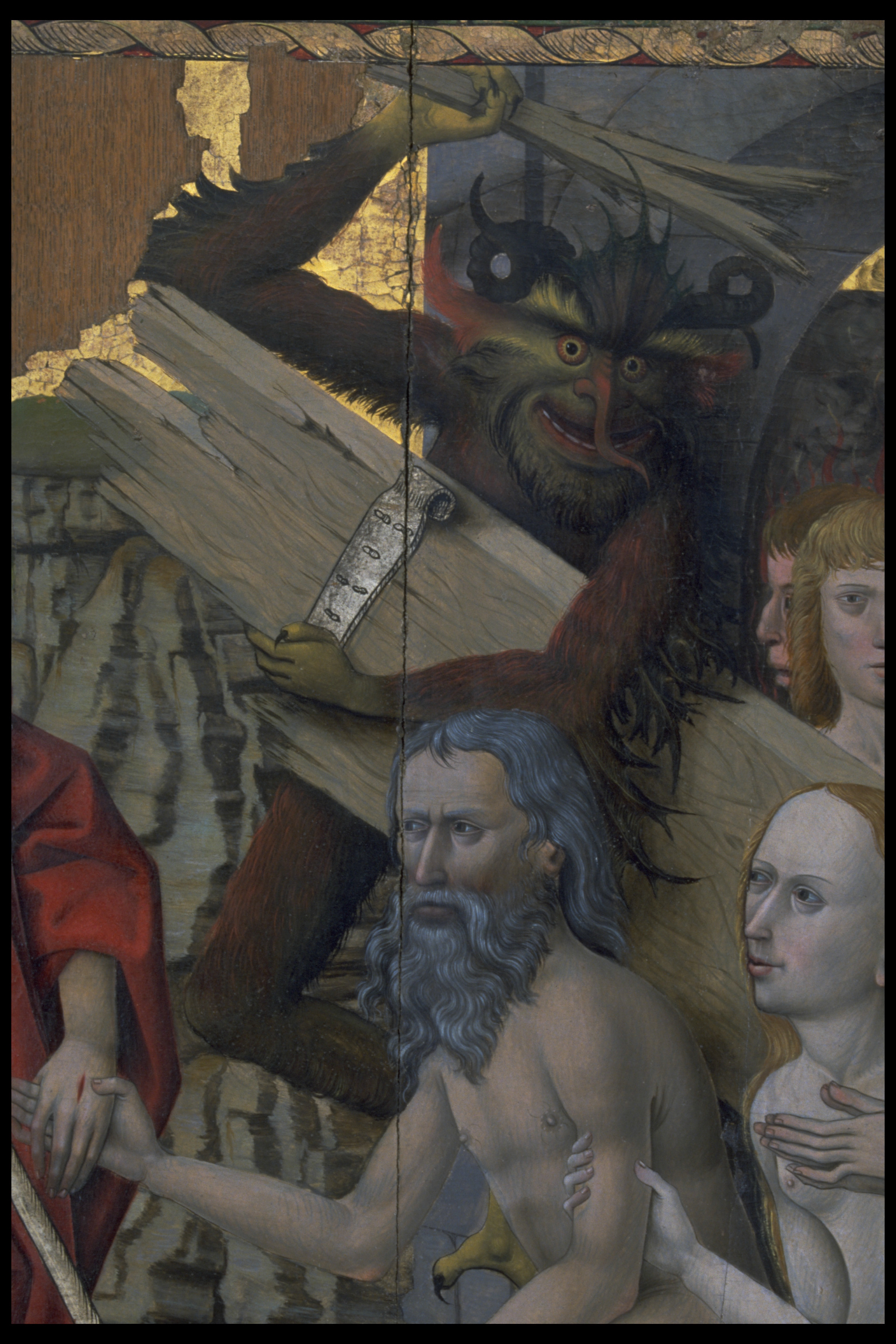 Kondition: flera attribut och några händer förlorade, Marias krona skadad och hennes mandorla starkt fragmentarisk. Färg: betydande fragment av skulpturens färg bevarade; huvudparten av målningarna ovanligt välbevarade, medan andra är nästan helt utplånad