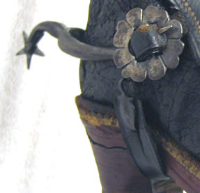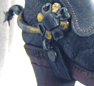 Av stål och läder. Monterade på stövlar nnr 24646. U-formad bygel med baktill utåt och nedåt böjd arm med i änden femuddig trissa. Under stöveln löpande läderrem, b 13 mm, fäst i bygelns ändar via beslag av stålplåt. Över stöveln ett rektangulärt läderstycke med konkava sidor och och tydlig kantsöm, i ändarna hålslagna remmar. Remmarna fäster i bygeln med söljor. Runt söljan en konturerad och graverad blomformig plåt, dekorerad av åttaflikiga ornament vartannat svart med genombruten sköld och förgylld rundell. Vänster plåt saknar förgyllning är inte genombruten.