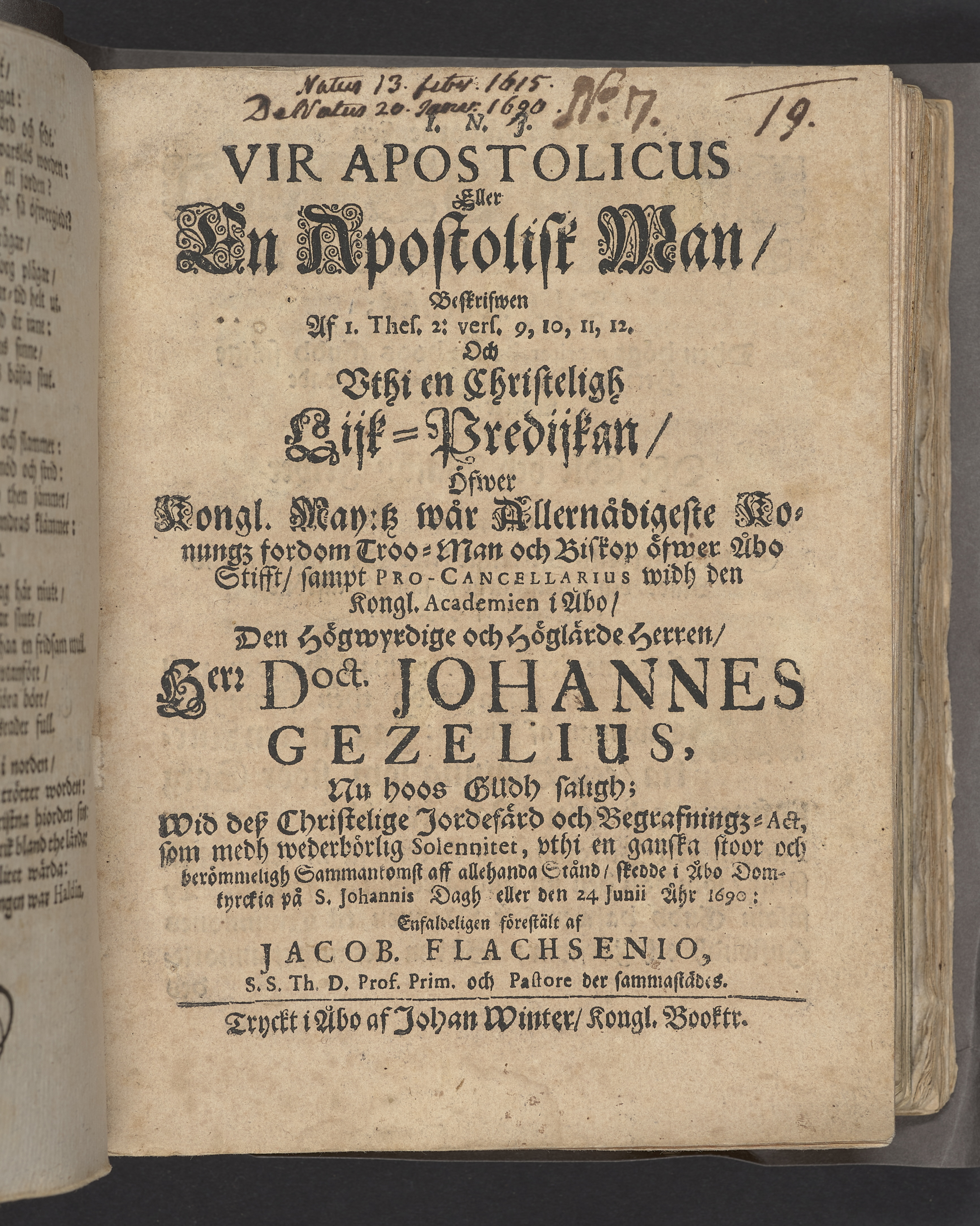 Vir apostolicus eller en apostolisk man, beskrifwen ... vthi en christeligh lijk-predijkan, öfwer ... Doct. Johannes Gezelius ... i Åbo domkyrckia på St. Johannis daagh eller den 24. junii åhr 1690 ... förestält af Jacob. Flachsenio ... Tryckt i Åbo af Johan Winter.