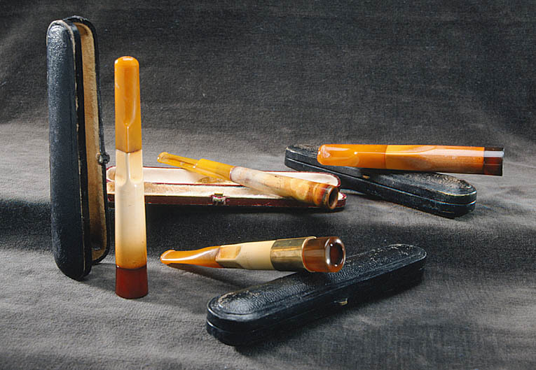 Etui till cigarettmunstycke av trä med rundade ändar samt rundad över- och undersida.Utvändigt klätt med svart slitet skinn, fjäderlås och två gångjärn av gulmetall. Locket är invändigt klätt med gulnat vitt siden och har ett delvis utplånat firmamärke tryckt med guldfärg, där det står i spetsoval: "CHR.ROSENSTIEL«BERLIN«CHARLOTTENSTR. 44"(?).