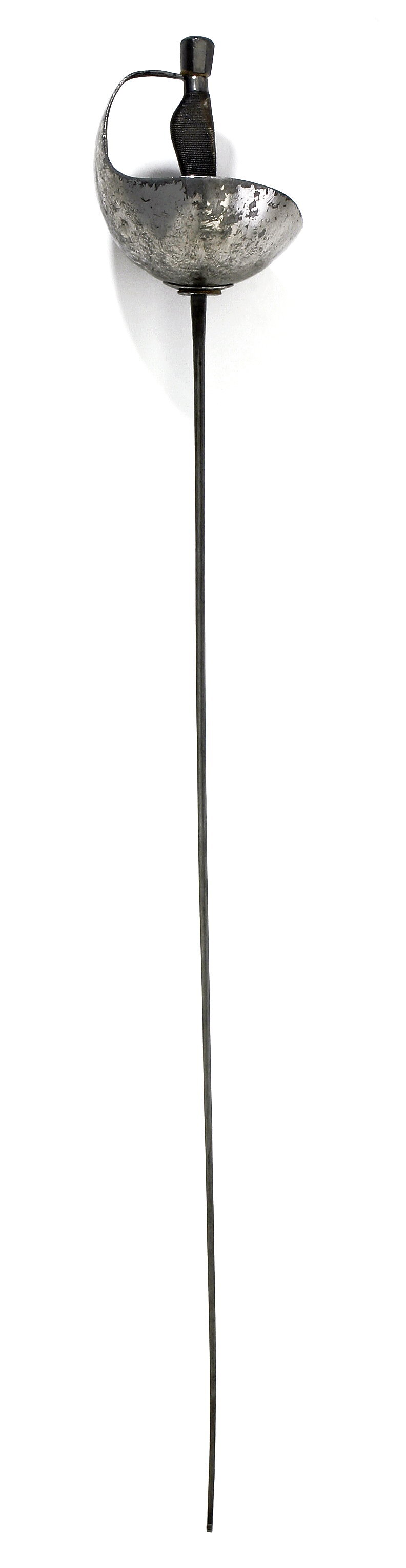 Fäste av förnicklat stål. Knapp omvänt konisk, vertikal, tvåsidig fasettslipning på två motstående sidor; påskruvad en gängad, ringformig och i vertikalled öppen stålmutter, som är trädd på tångens ytterände. Mellan knappen och kavelns övre ände en fyrsidig packning av sämskskinn. Kavel mjukt rektangulärt fyrsidig, framsidan med rundat utskjutande överdel avpassad för lillfingersidan vid full fattning; tätt lindad med tvinnat, tunnt segelgarn, lindningen överdragen med mörkt lack samt upptill och nedtill avgränsad med en slät ring. Parerplåt stor och tämligen djupt skålformig, utsidan något större och högre än insidan, framsidan uppåtsvängd och övergående i en flat handbygel med överdelen påträdd tången mellan packningen och kavelns övre ände. Pareranordningen i sin helhet med omvikt kant. På parerplåtens insida, runt kavelns nedre ände, en cirkelrund puta av brunt tyg. På insidan av parerplåt och handbygel vertikalt målat med svart färg: "Prins G A". Klinga med rektangulärt tvärsnitt, på ut- och insidan av starka delen och mittpartiet en hålkäl. Spetsens ytterände omböjd.