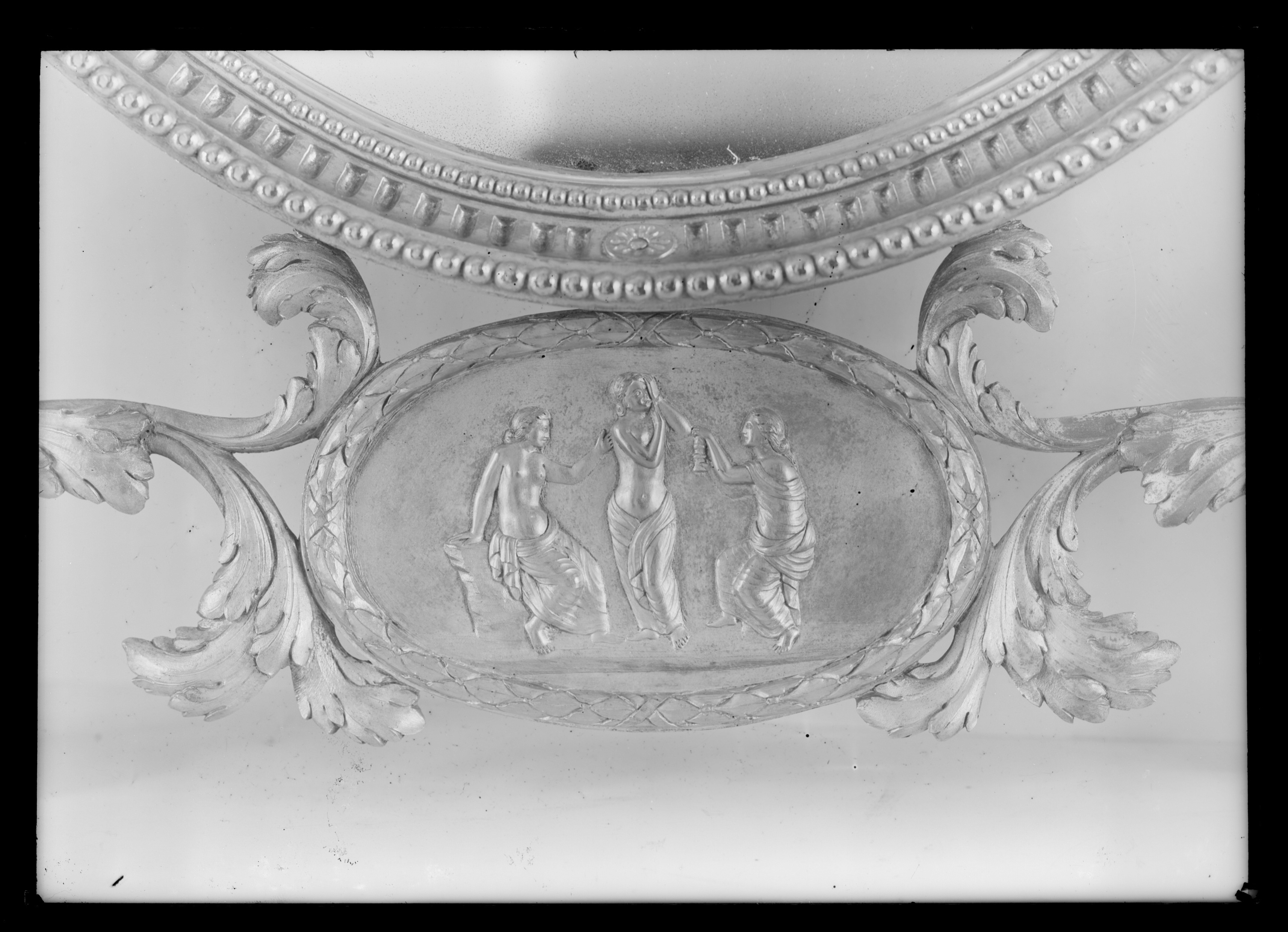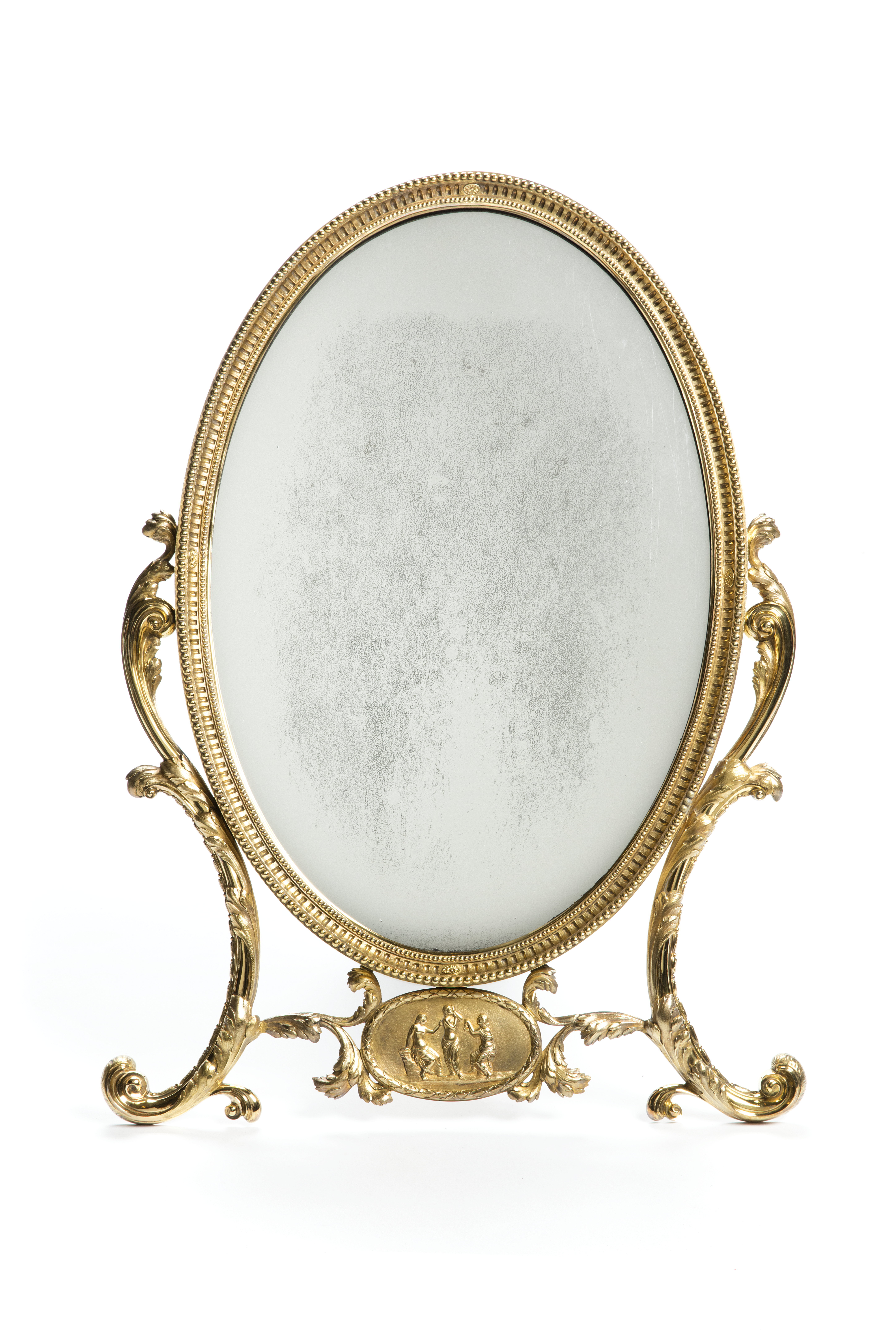 Spegel i form av en stående oval. Stomme av mahogny, med ett bakåt utfällbart stöd vars kontur är balusterformad, plant och delvis genombrutet. Ett grönt band fäst vid stödet och i en ring på spegelns baksida spärrar stödet när spegeln är uppställd.Spegelramen är av gjuten, ciselerad och förgylld mässing. Den består av en ram runt spegelglaset (som är svagt gröntonat) i form av en hålkäl med inifrån räknat pärlstav, hålkäl med urgröpta partier bildande ett randmönster och 4 ovala rosetter (placerade kl 12,3,6,9), ytterst pärlstav. Från mitten av ovalens vardera sida går en s-formad volut, omslingrad av akantus, nedåt och utgör ett stöd. Från voluterna sträcks akantusblad mot mitten och håller mitt under spegeln en lagerkransomsluten oval med figurframställning i relief: 3 kvinnofigurer i antik klädnad, den mittersta tycks bli uppvaktad vid sin toilett (Venus?). Ramen har till större delen matt yta mot vilken pärlstavarnas och voluterna blankpolerade partier kontrasterar. På den ovala ramen inslaget 4 stämplar: 1) Smith & Sharps fyrpassformiga stämpel med DSRS, 2) Londons lejon, 3) Londons krönta leopardhuvud, 4) årsstämpeln b (1777). Upptagen 1811 i Husgerådskammarens inv. i "Hennes Maijt Drottningens Öfre Toilette Rum", marginalanteckning 1821 tillhörig "HKMT", dvs Karl XIV Johan. Upptagen i Klädkammarens inventarium 1850. Deposition till Statens historiska museum 1868, SHM nr 3937, återlämnad jämlikt k. brev 1887-06-17.