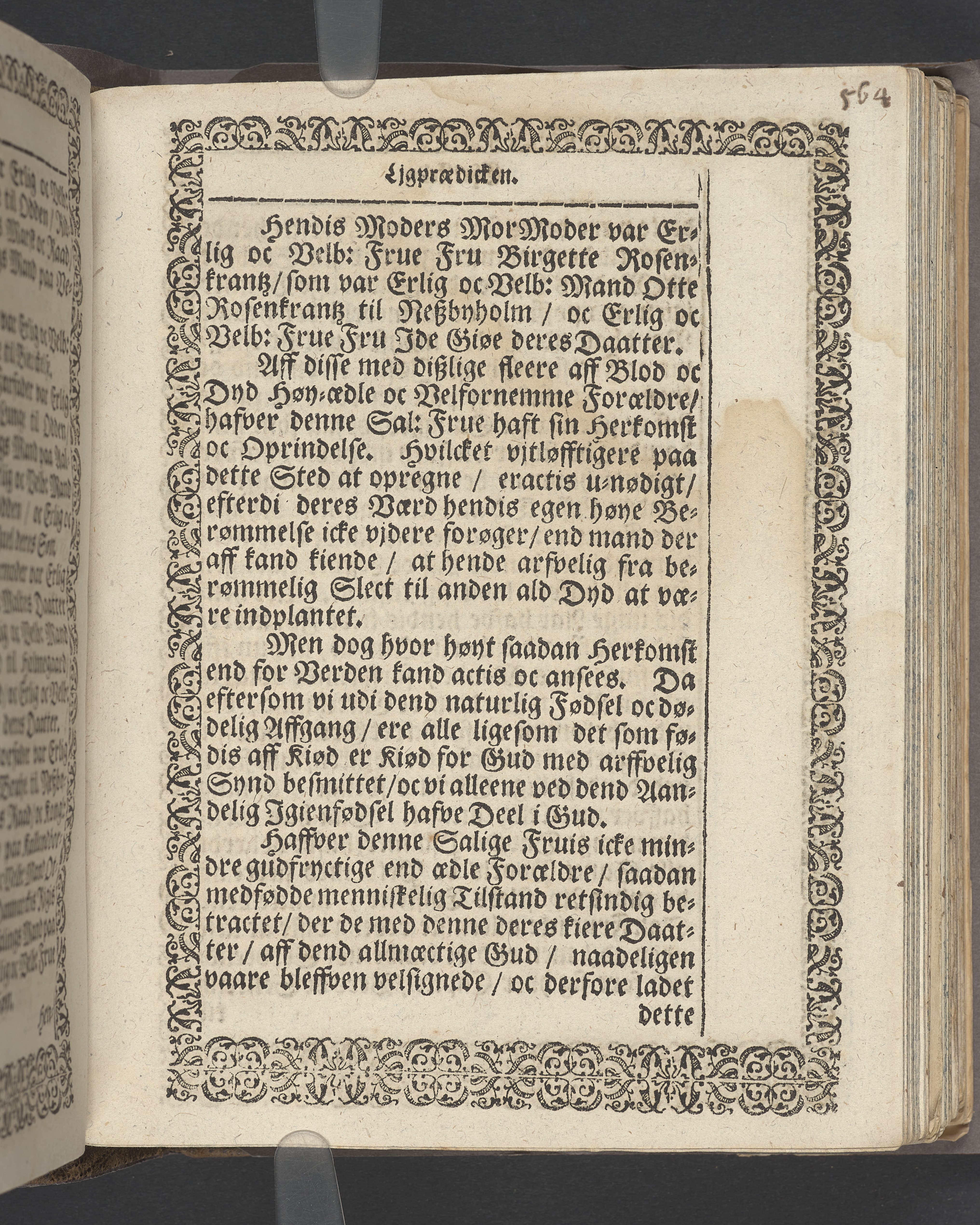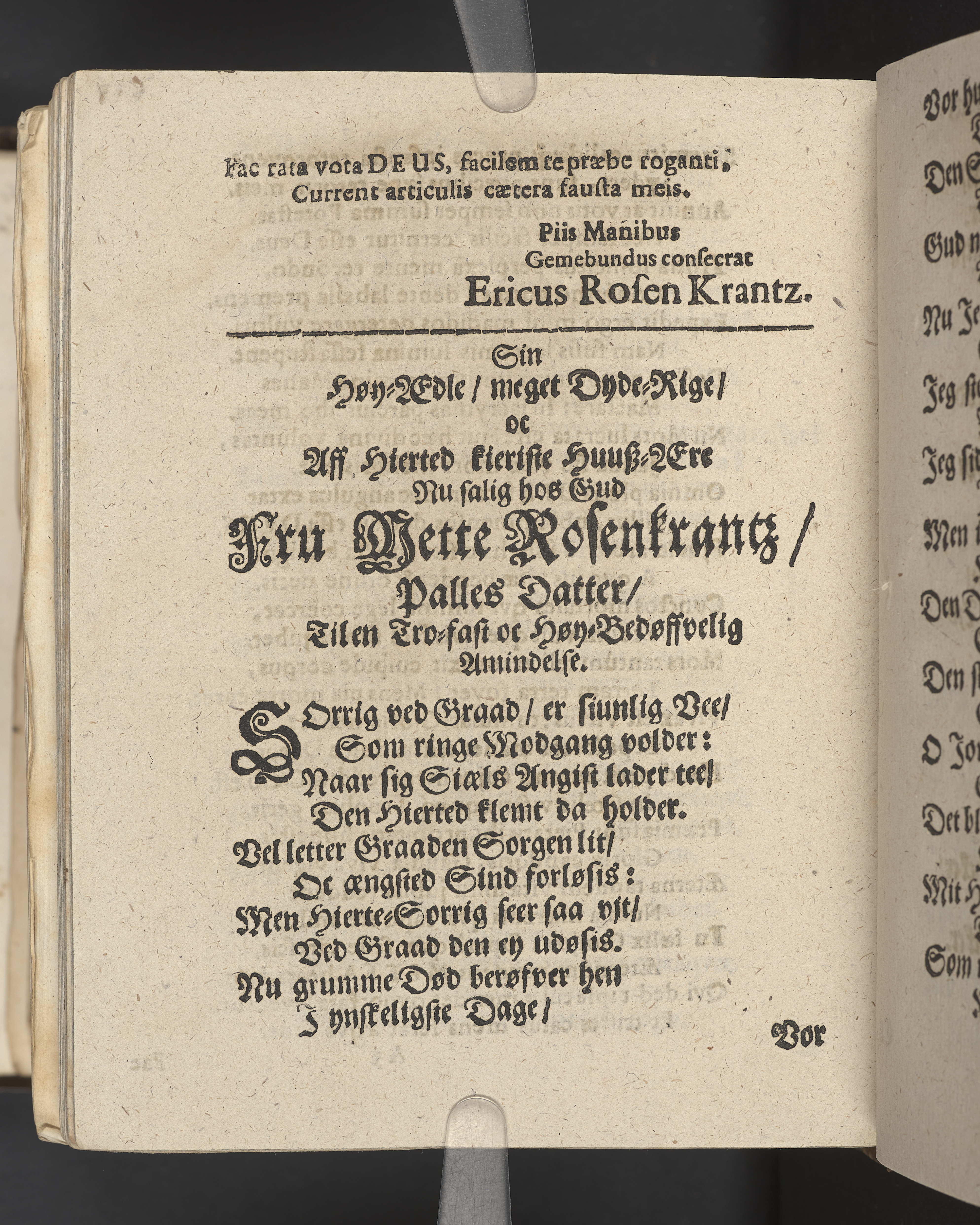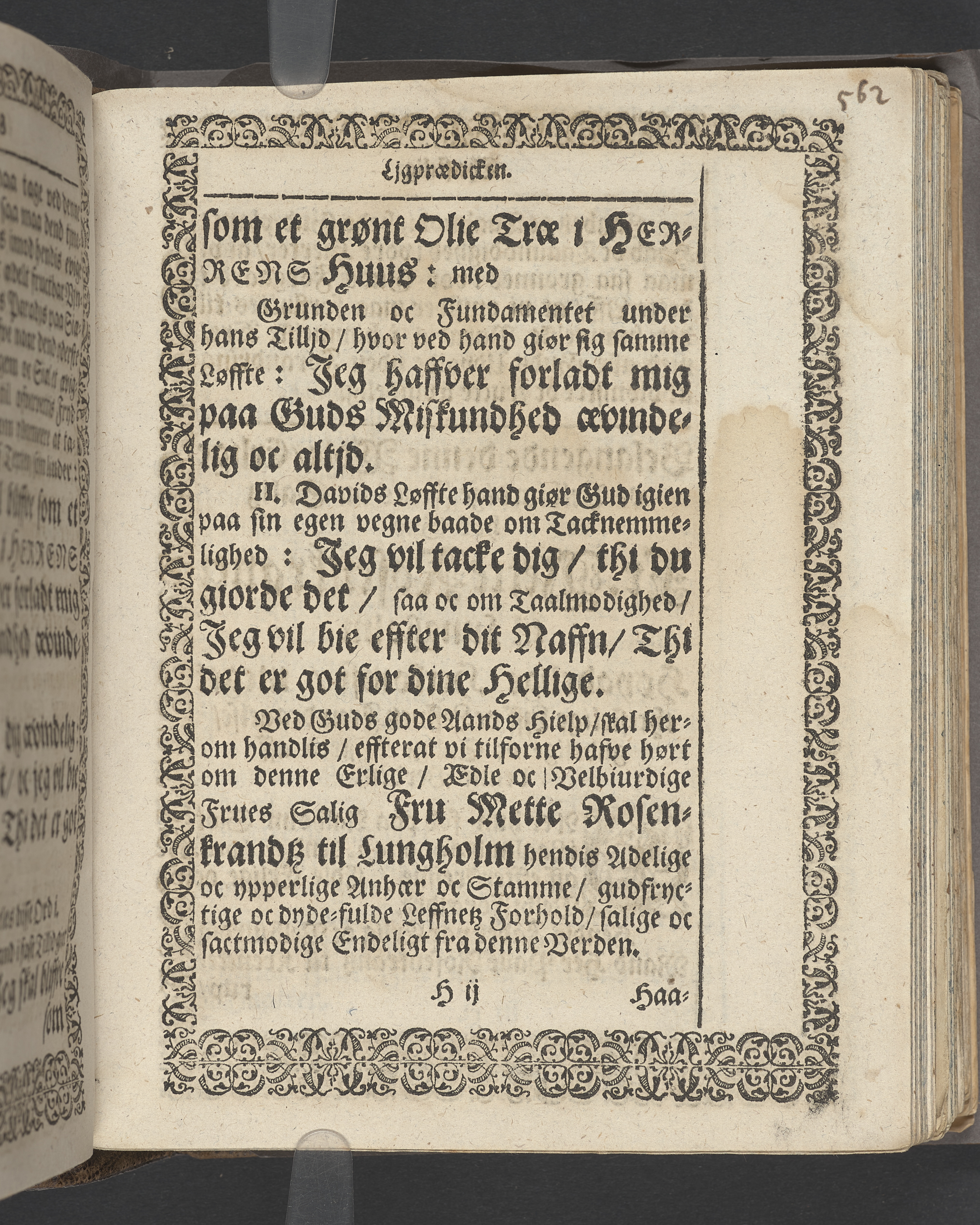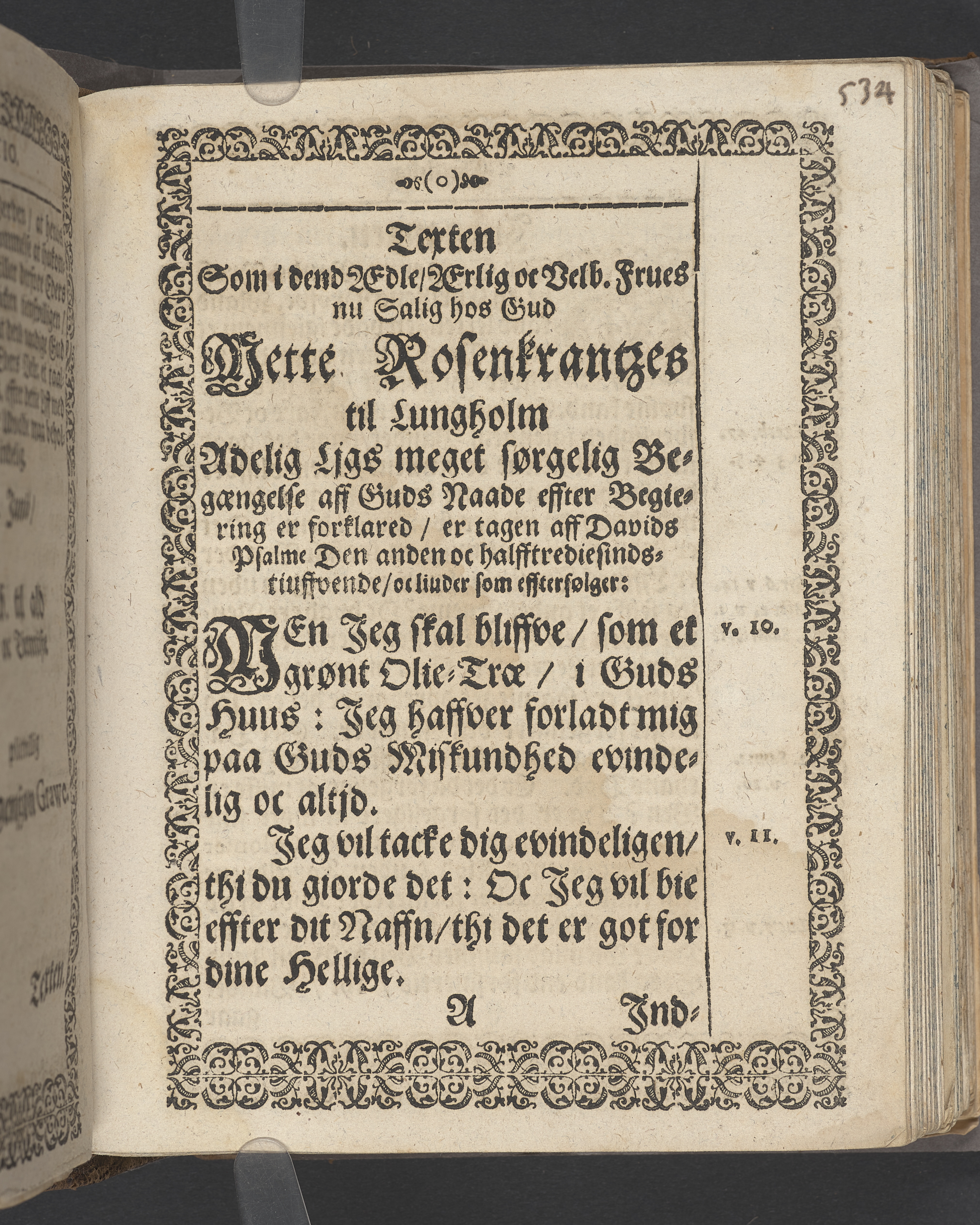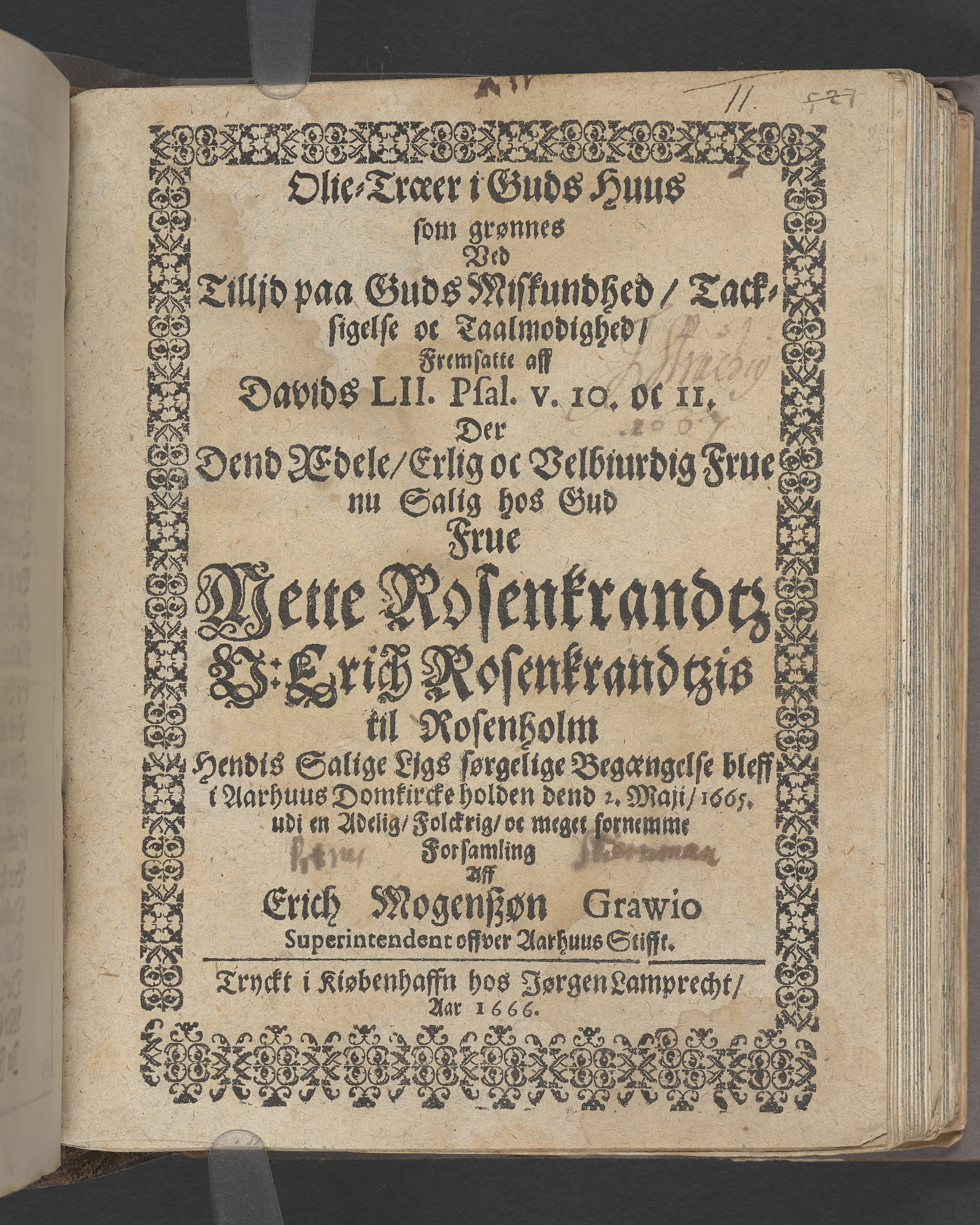 Olie-Træer i Guds Huus... fremsatte, der... Frue Mette Rosenkrandtz, D. Erich Rosenkrandtzis til Rosenholm, hendis salige ligs sørgelige begængelse bleff i Aarhuus domkircke holden dend 2. Maji, 1665 ... Aff Erich Mogenszøn Grawio ... Tryckt i Kiøbenhaffn hos Jørgen Lamprecht, aar 1666.