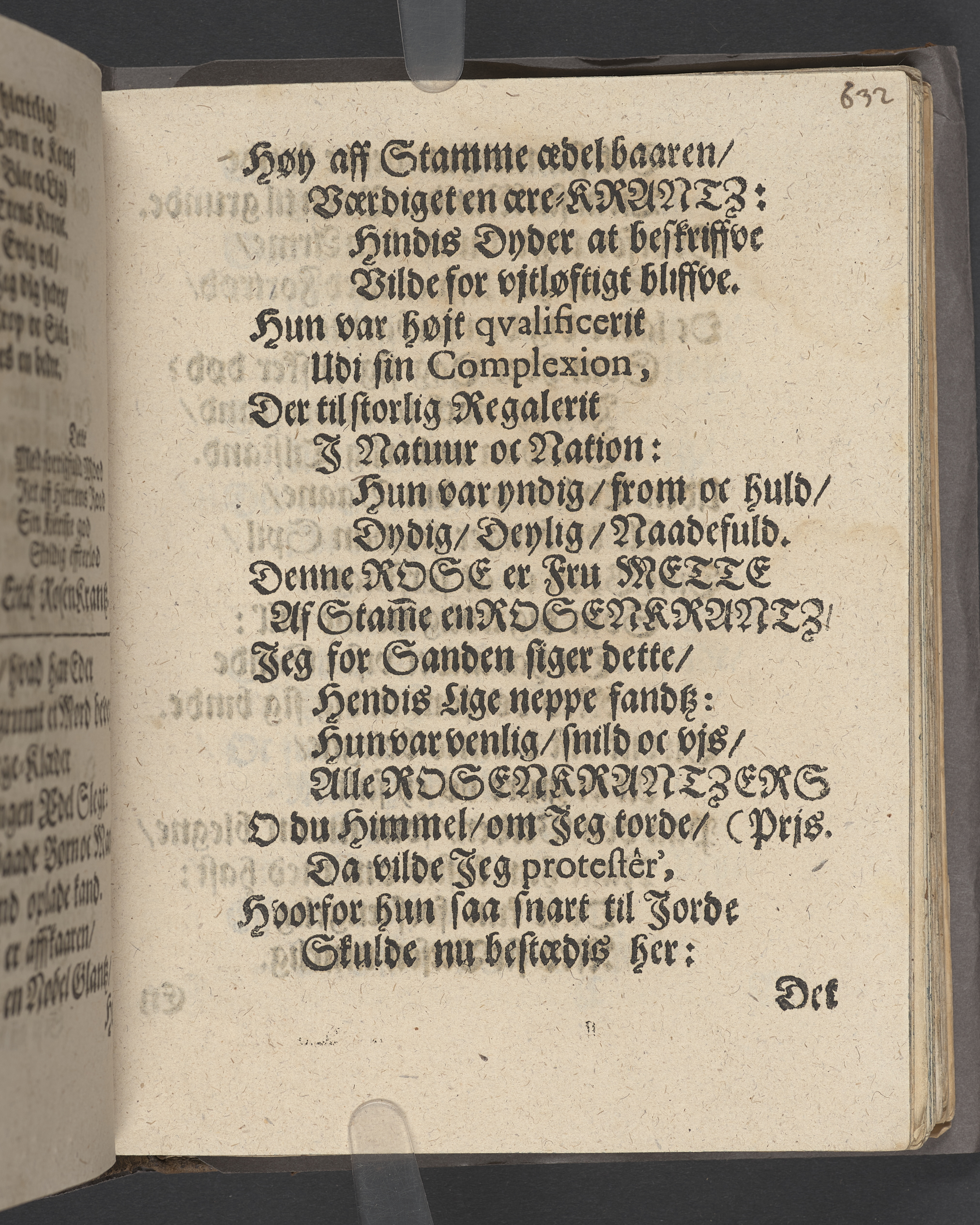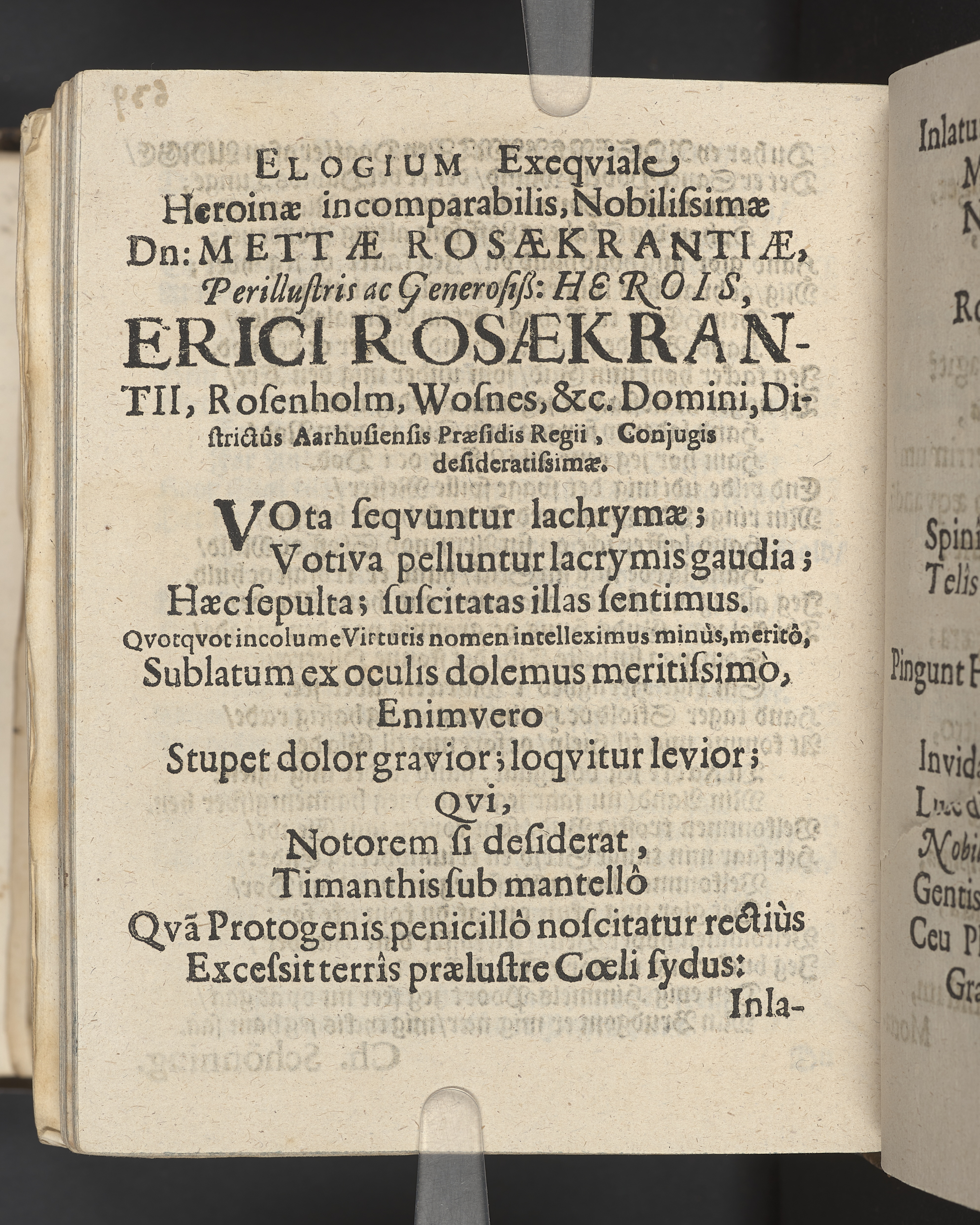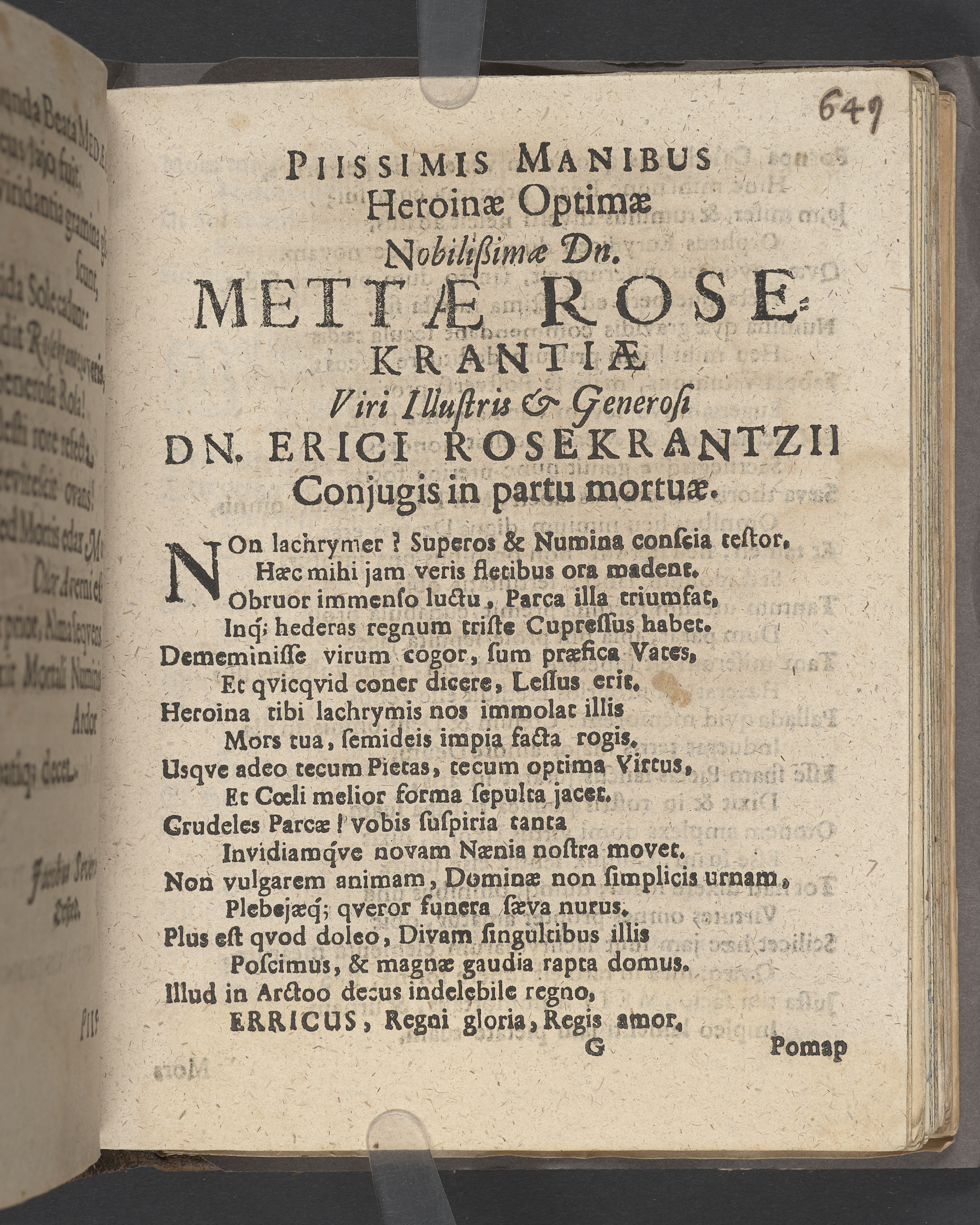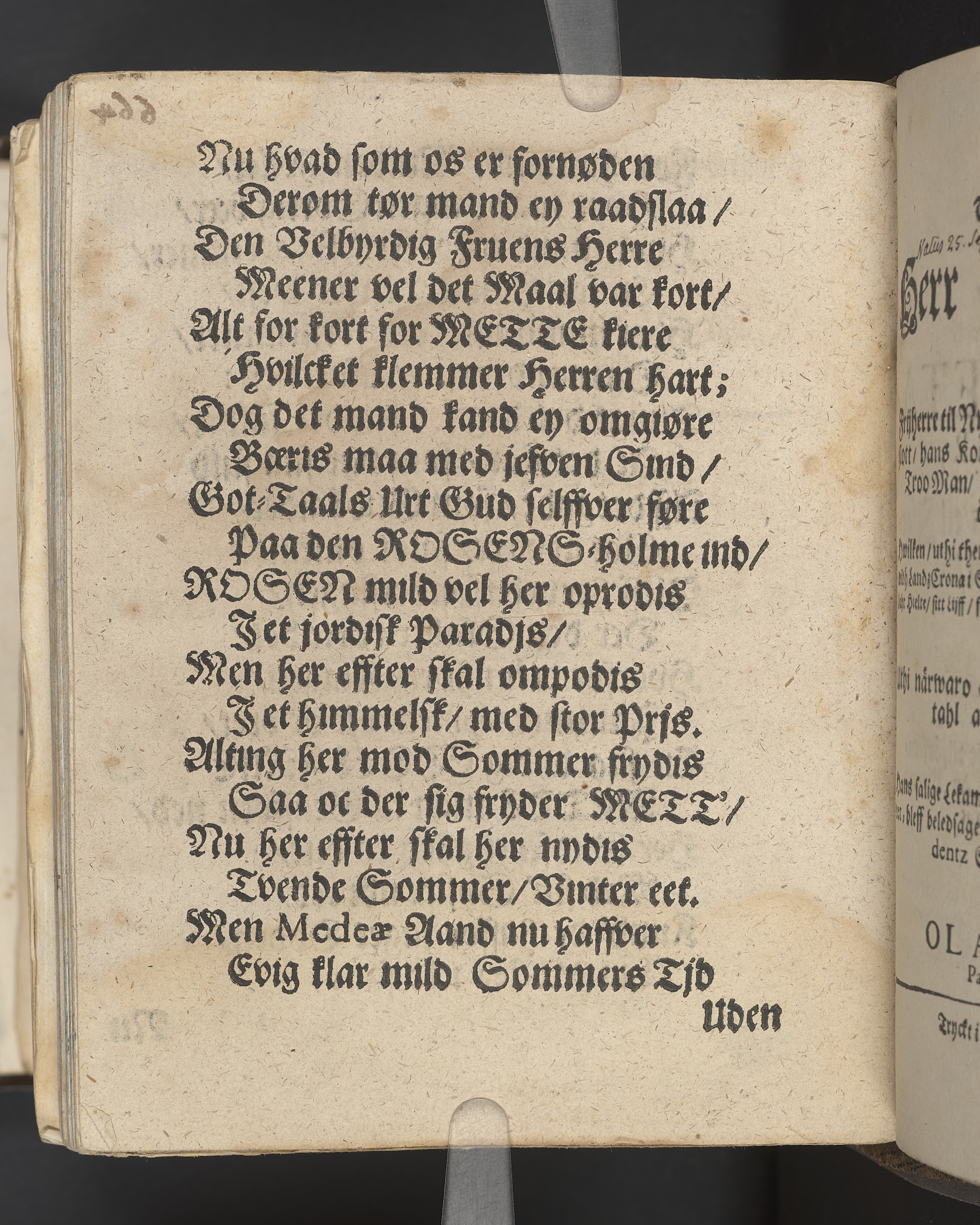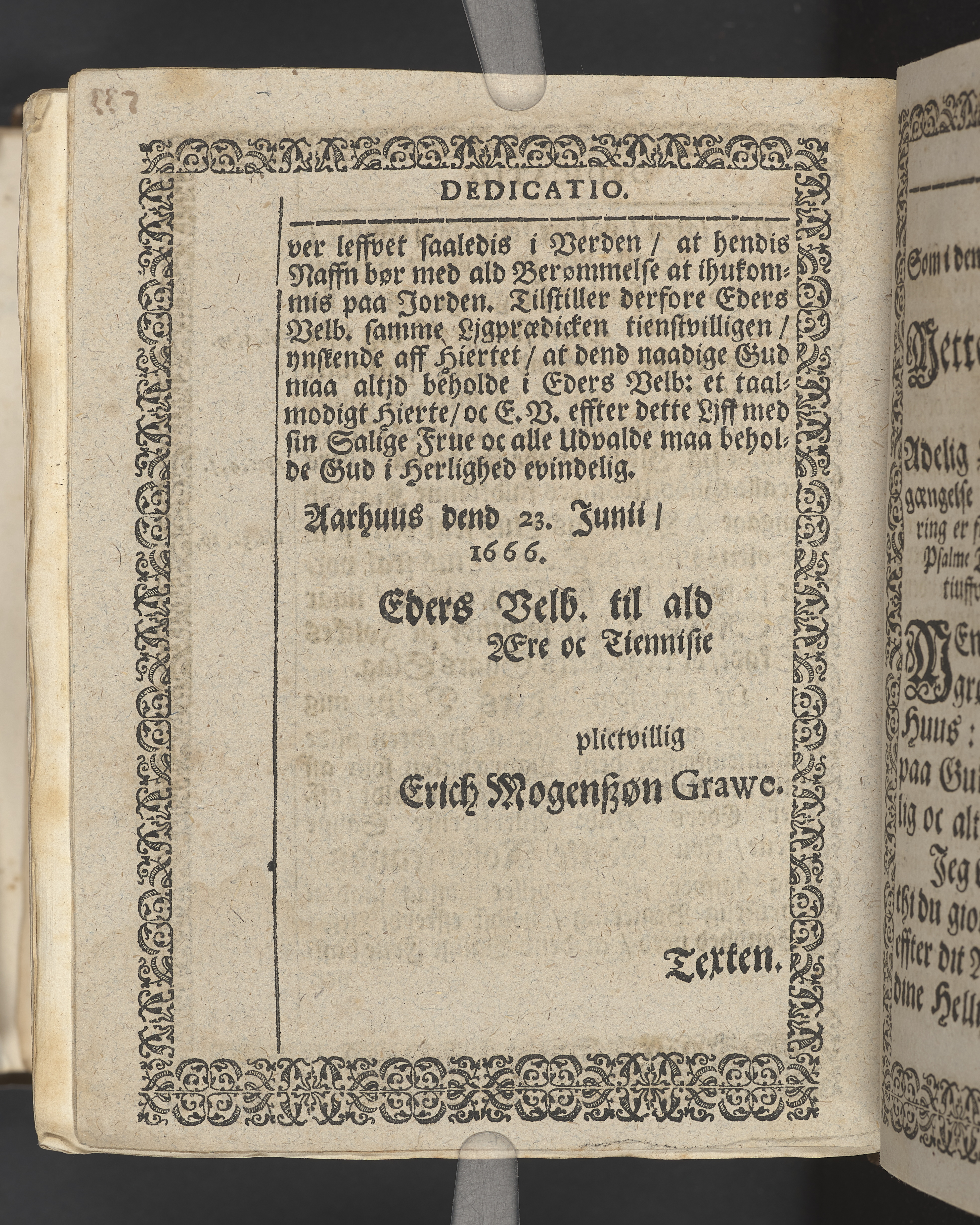 Olie-Træer i Guds Huus... fremsatte, der... Frue Mette Rosenkrandtz, D. Erich Rosenkrandtzis til Rosenholm, hendis salige ligs sørgelige begængelse bleff i Aarhuus domkircke holden dend 2. Maji, 1665 ... Aff Erich Mogenszøn Grawio ... Tryckt i Kiøbenhaffn hos Jørgen Lamprecht, aar 1666.