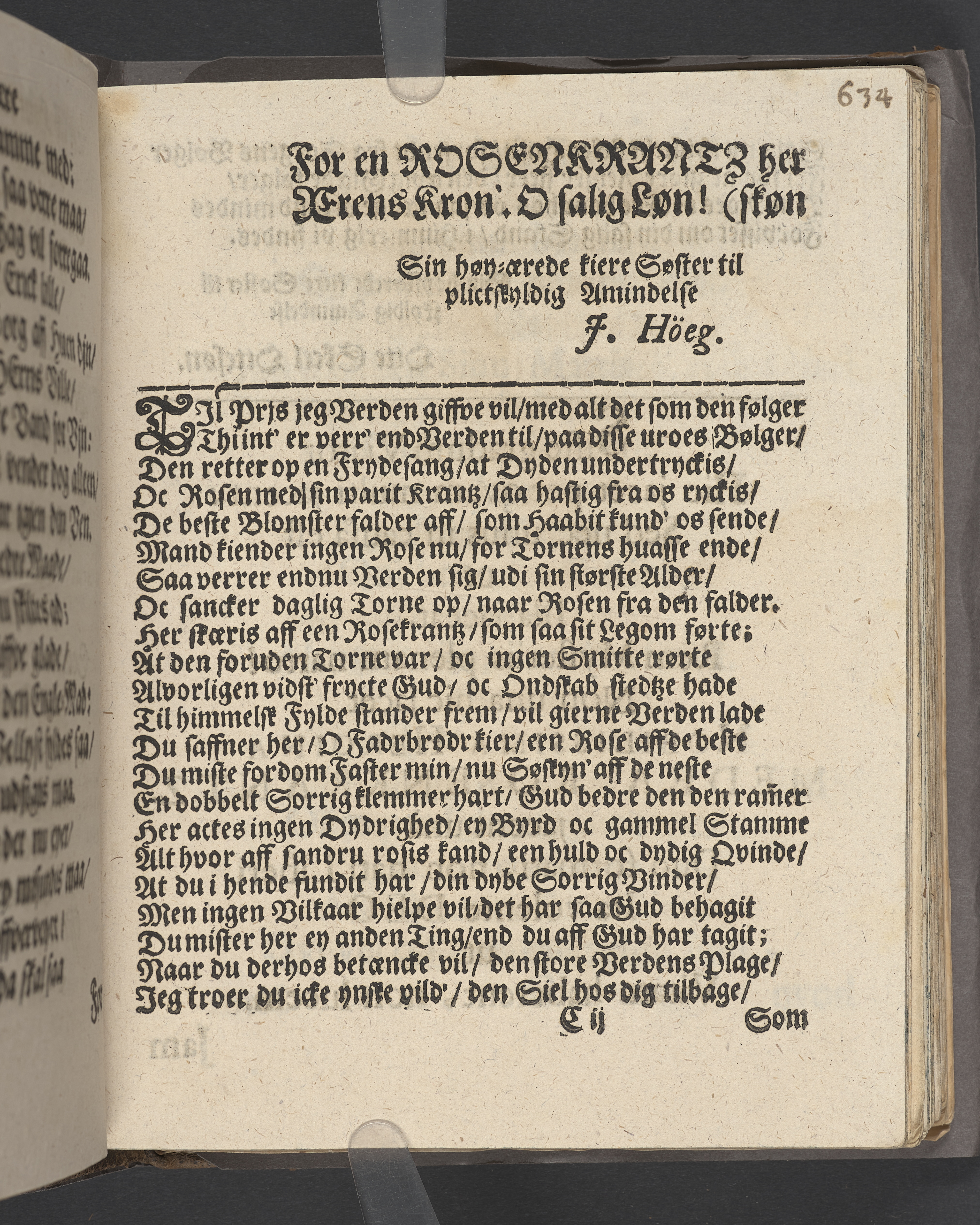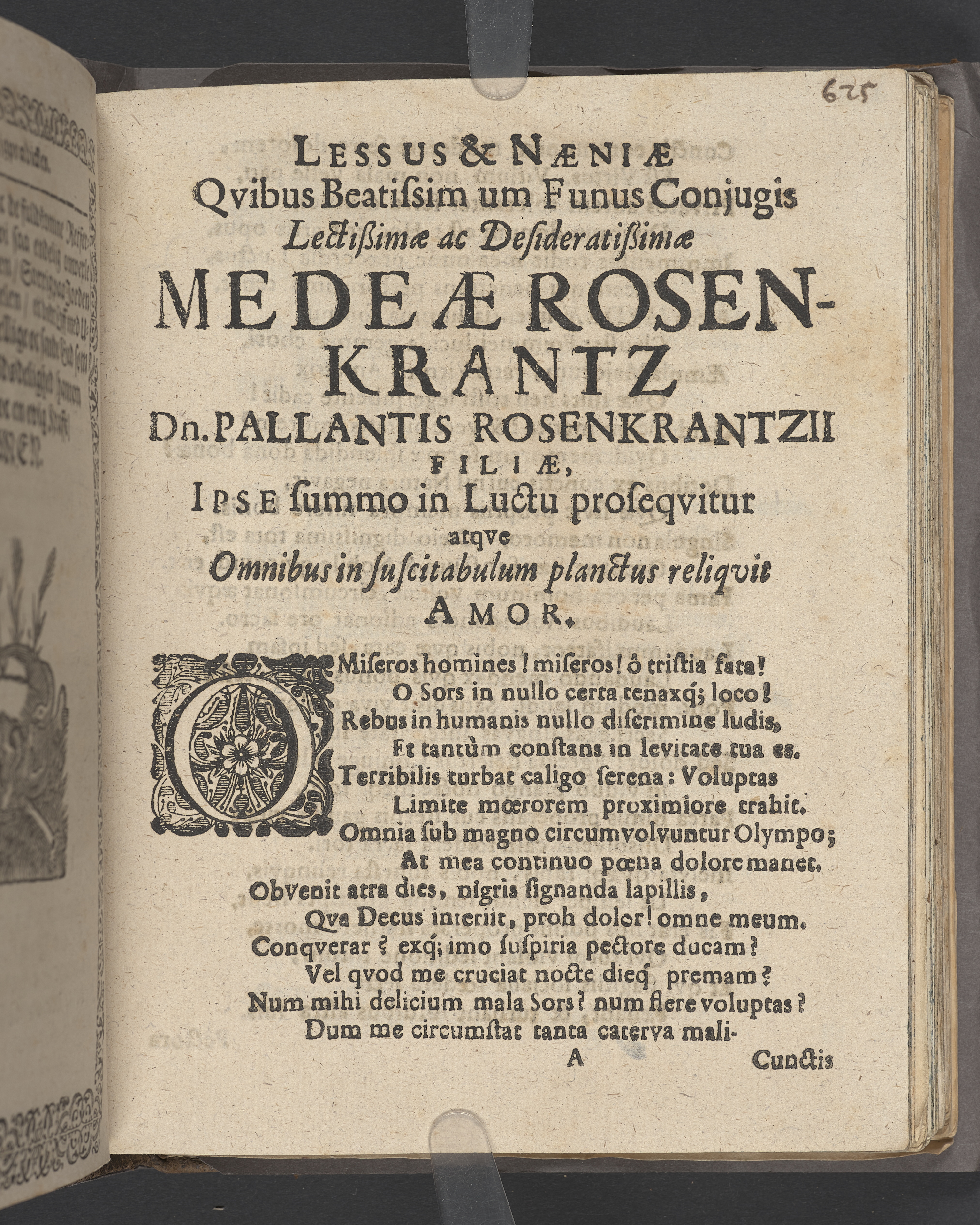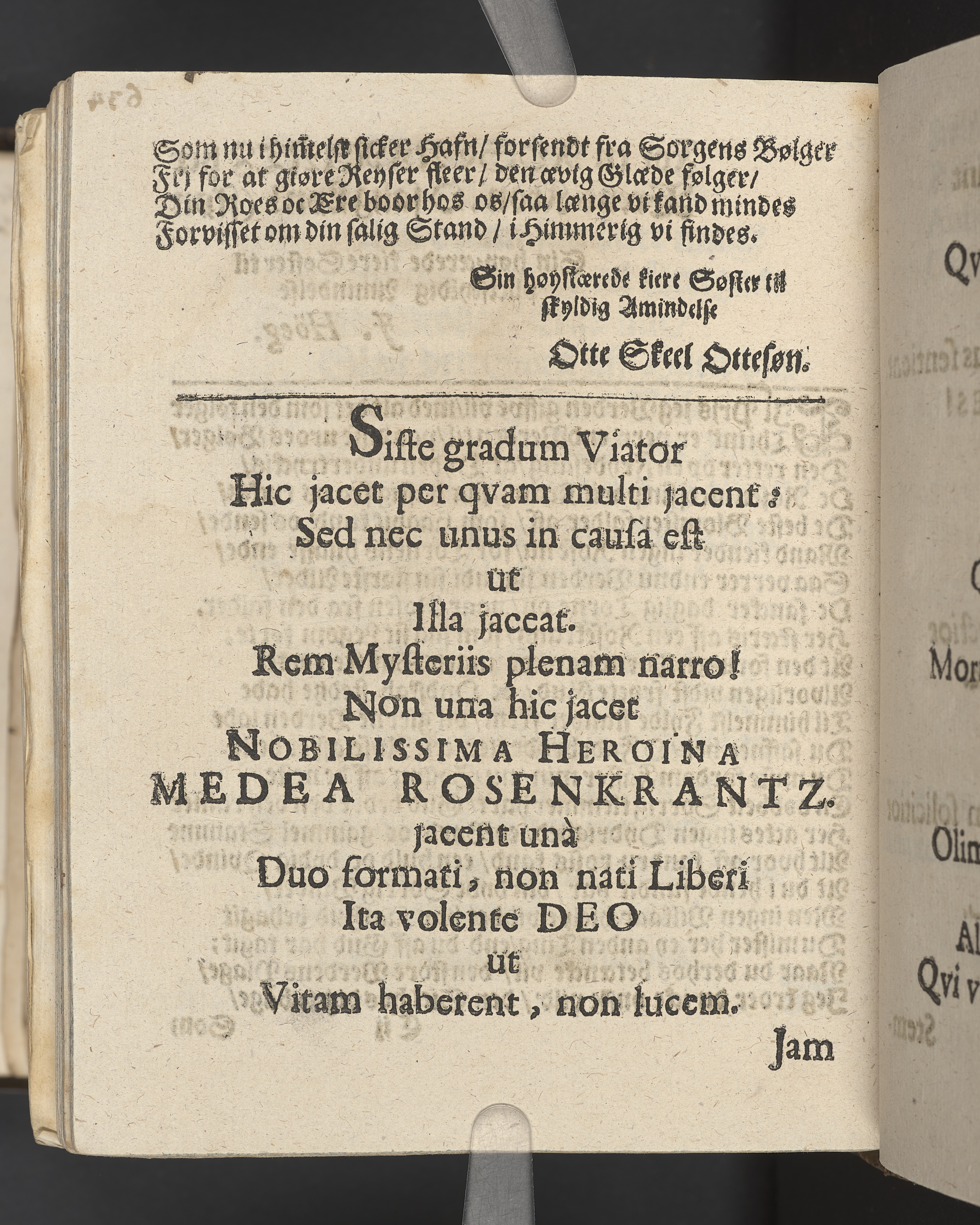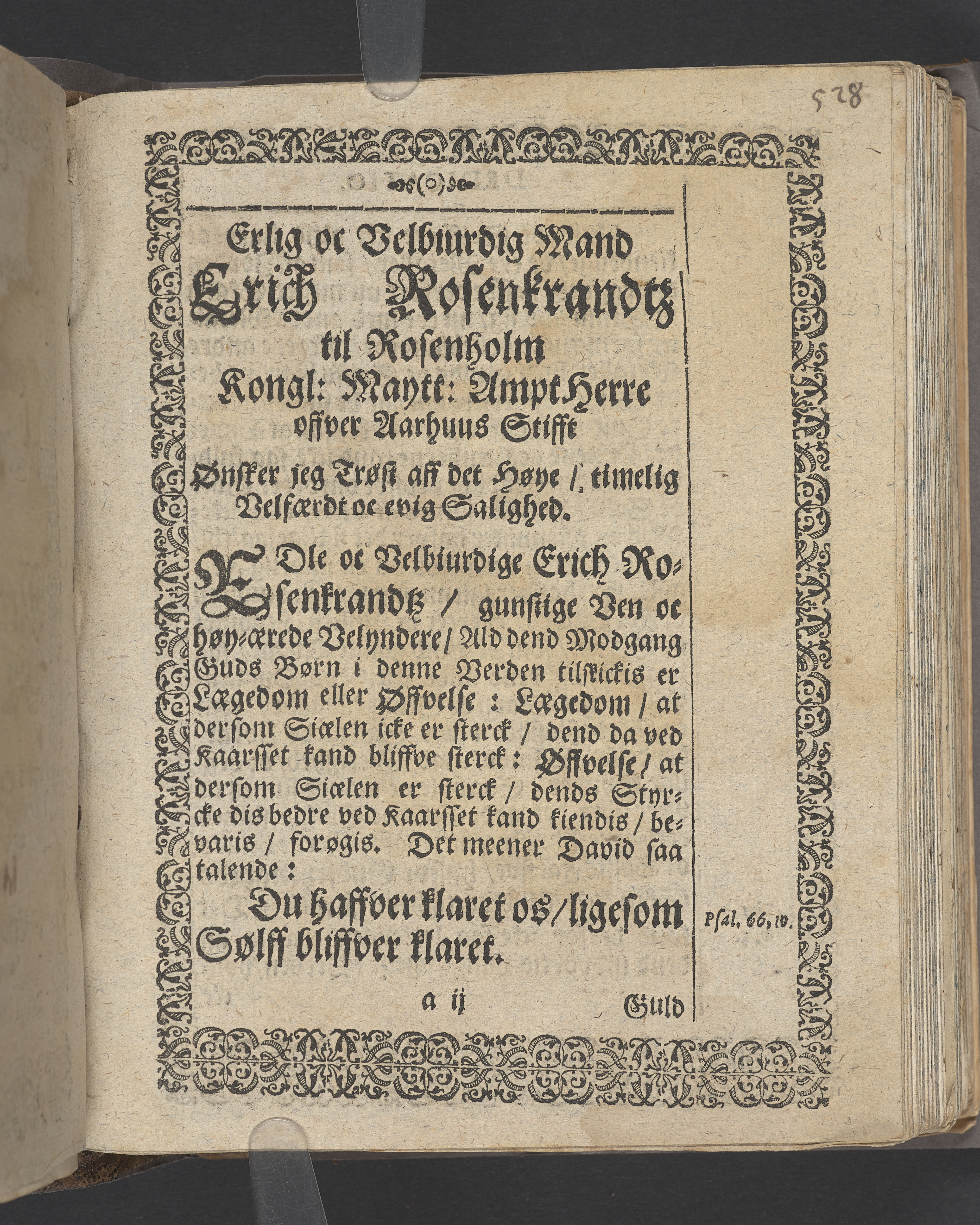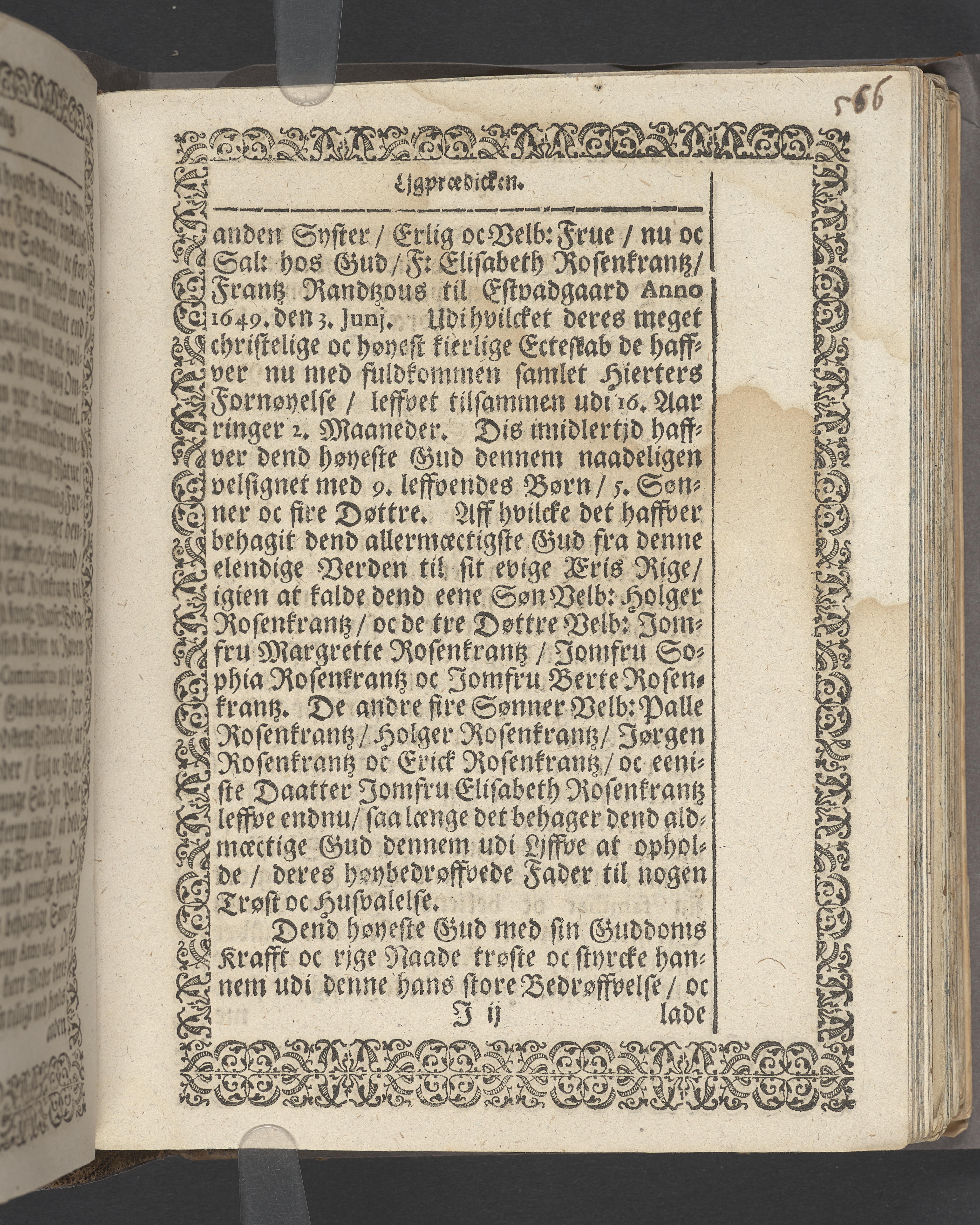 Olie-Træer i Guds Huus... fremsatte, der... Frue Mette Rosenkrandtz, D. Erich Rosenkrandtzis til Rosenholm, hendis salige ligs sørgelige begængelse bleff i Aarhuus domkircke holden dend 2. Maji, 1665 ... Aff Erich Mogenszøn Grawio ... Tryckt i Kiøbenhaffn hos Jørgen Lamprecht, aar 1666.