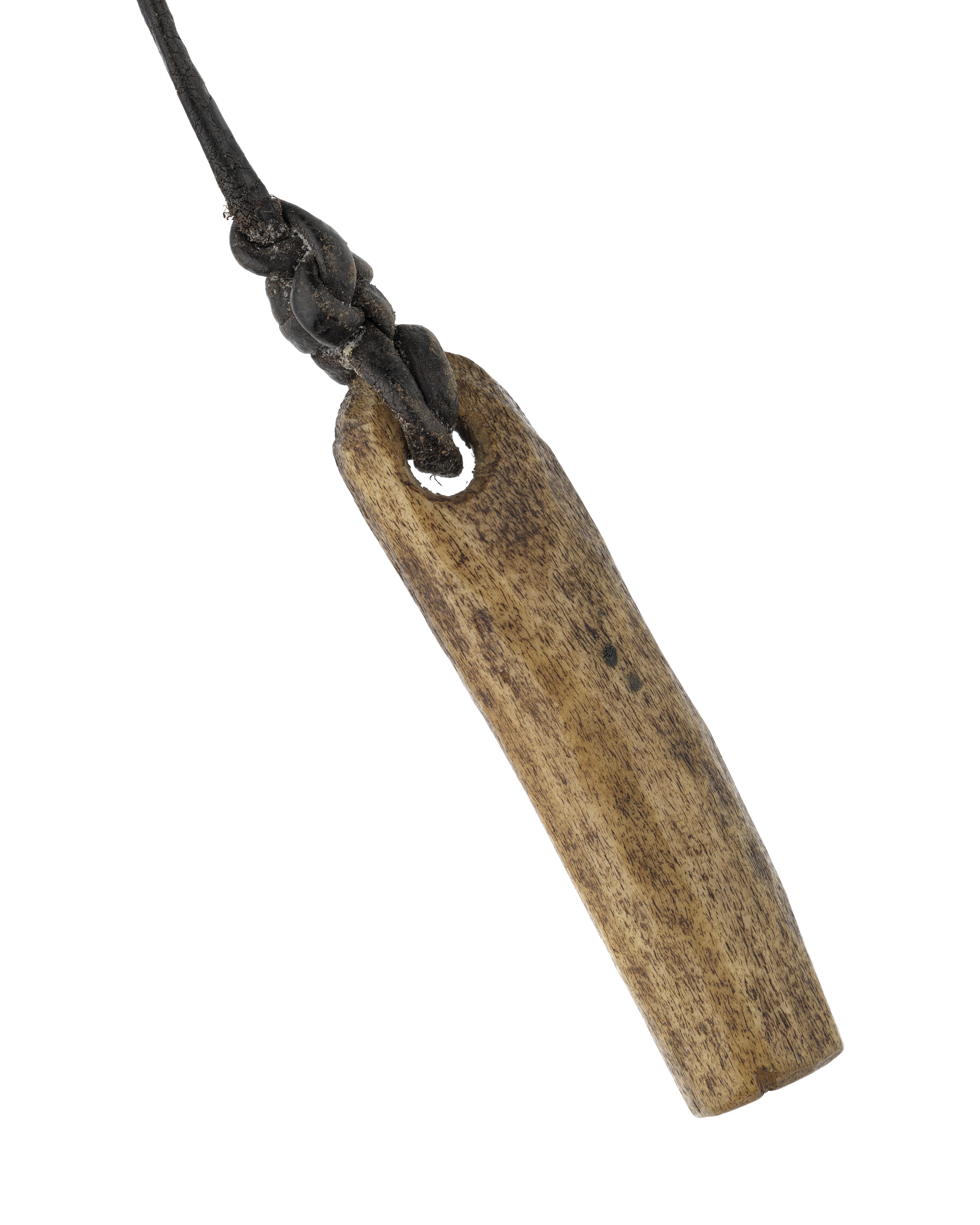 Krutmått av horn, i ena änden är ett längsgående hål inborrat för att mäta krutet. Andra änden ärplanad och genomborrad, igenom hålet är draget en small upphängningssnodd av läder.