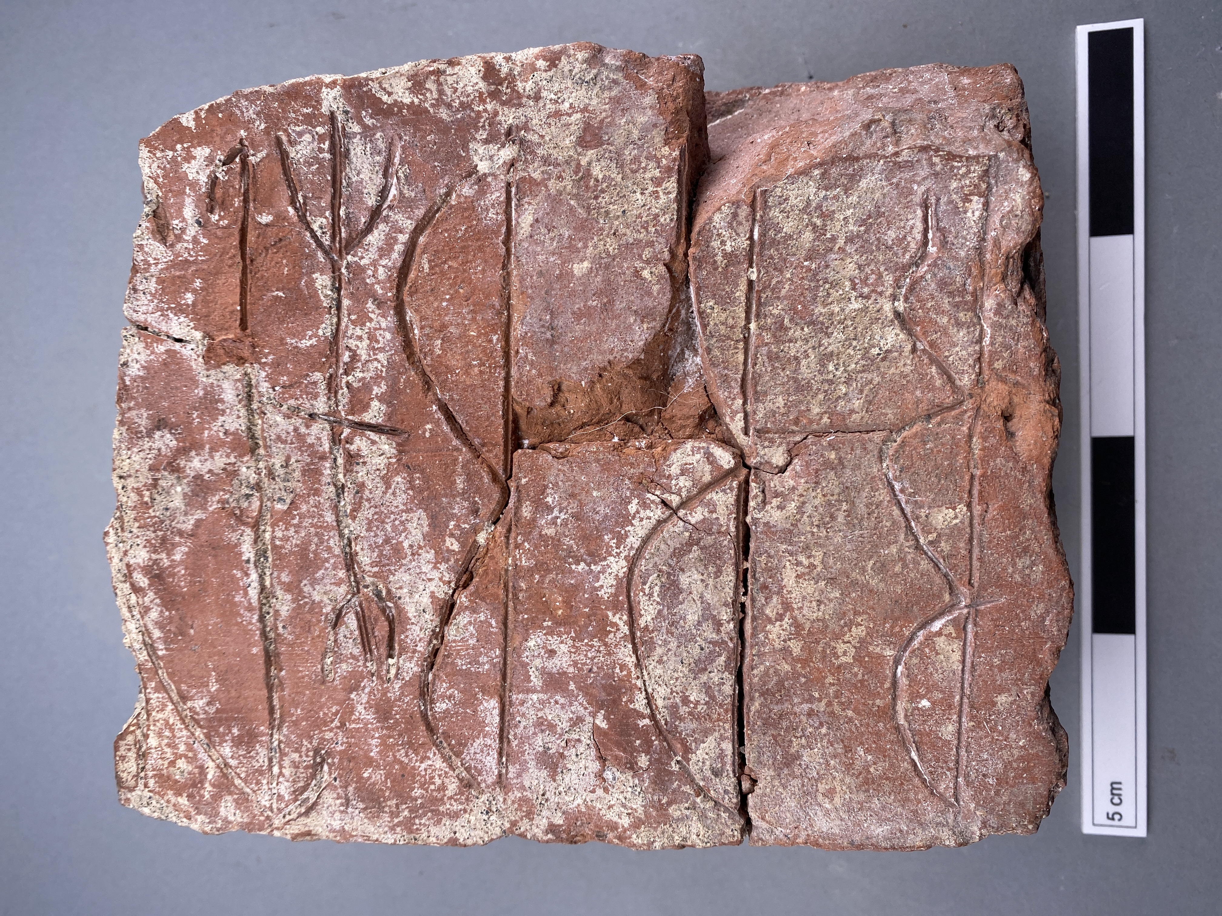 Tegelsten med runliknande tecken. Troligtvis samma som den saknade tegelstenen F1 som ska ha R- och B-liknande runor.