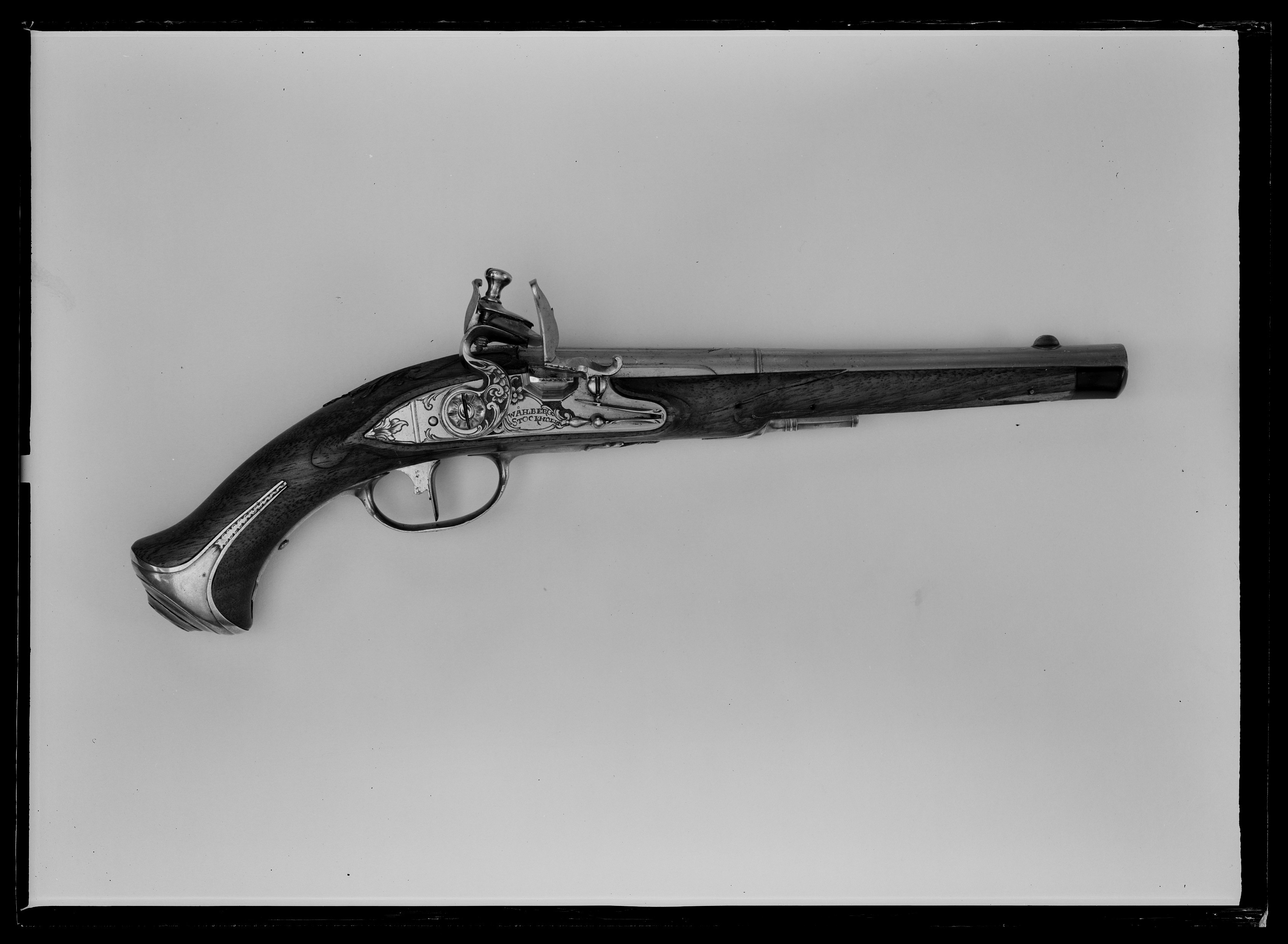 Rund, slätborrad pipa med åttsidig kammare, de två sidofaserna på ovansidan profilerade, blad i stålsnitt på mittfasen, därframför ring. Kort, baktill bladformigt svansskruvblad. Riktmedel: Klack med siktskåra vid pipbasen, spolformigt korn av koppar(?). Fästning: Två häften. Flintlås med plant låsbleck, något fasade kanter, försänkt bakspets. Graverad rankdekor, i kartusch framför hanen signatur: "WÅHLBERG // STOCKHOLM". S-formig hane i utförande som låsbleckets, lös överkäke, käkskruv med päronformigt huvud. Fasetterad fängpanna, batteri med profilerad mittås, batterifjäder med delvis fasade kanter, litet droppformigt fjäderlöv. Fästning: Avtryckare med rundad framsida. Avtryckarbleck av stål. Helstock av valnöt med skuren dekor (högre kvalitet än på parpistolen), blad vid svansskruvplattan. Näsband av hornövriga beslag av mässing. Oval, profilerad kolvkappa, något tillplattad från sidorna, flikar med enkel, graverad kantdekor. Ursprungligen en + en kantig rörka, slät, kort spets. Varbygel med svagt rombisk bygel med kantdekor, plana armar med fasade kanter, främre armen avslutad med treflikigt blad, bakre armen avbruten vid skruvhålet.