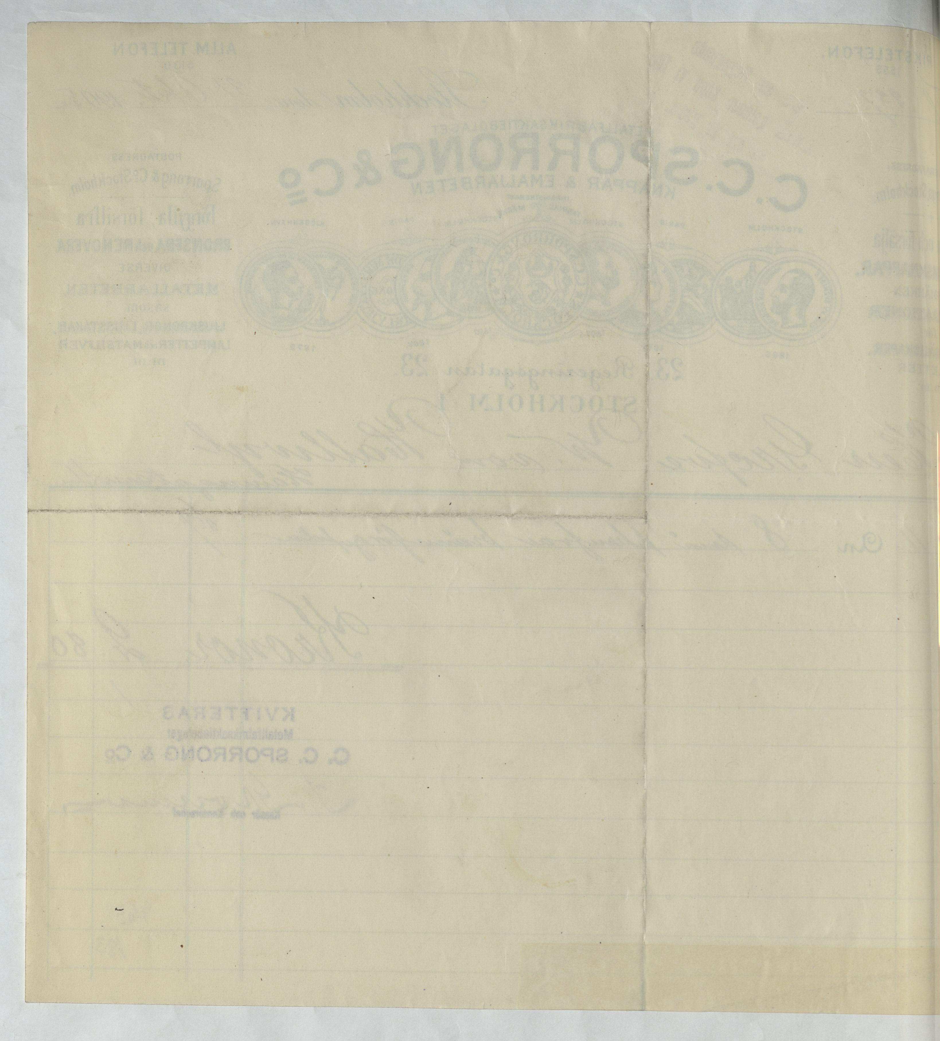 Kvitto från Metallfabriksaktiebolaget C. C. Sporrong & Co. Knappar & Emaljarbeten
