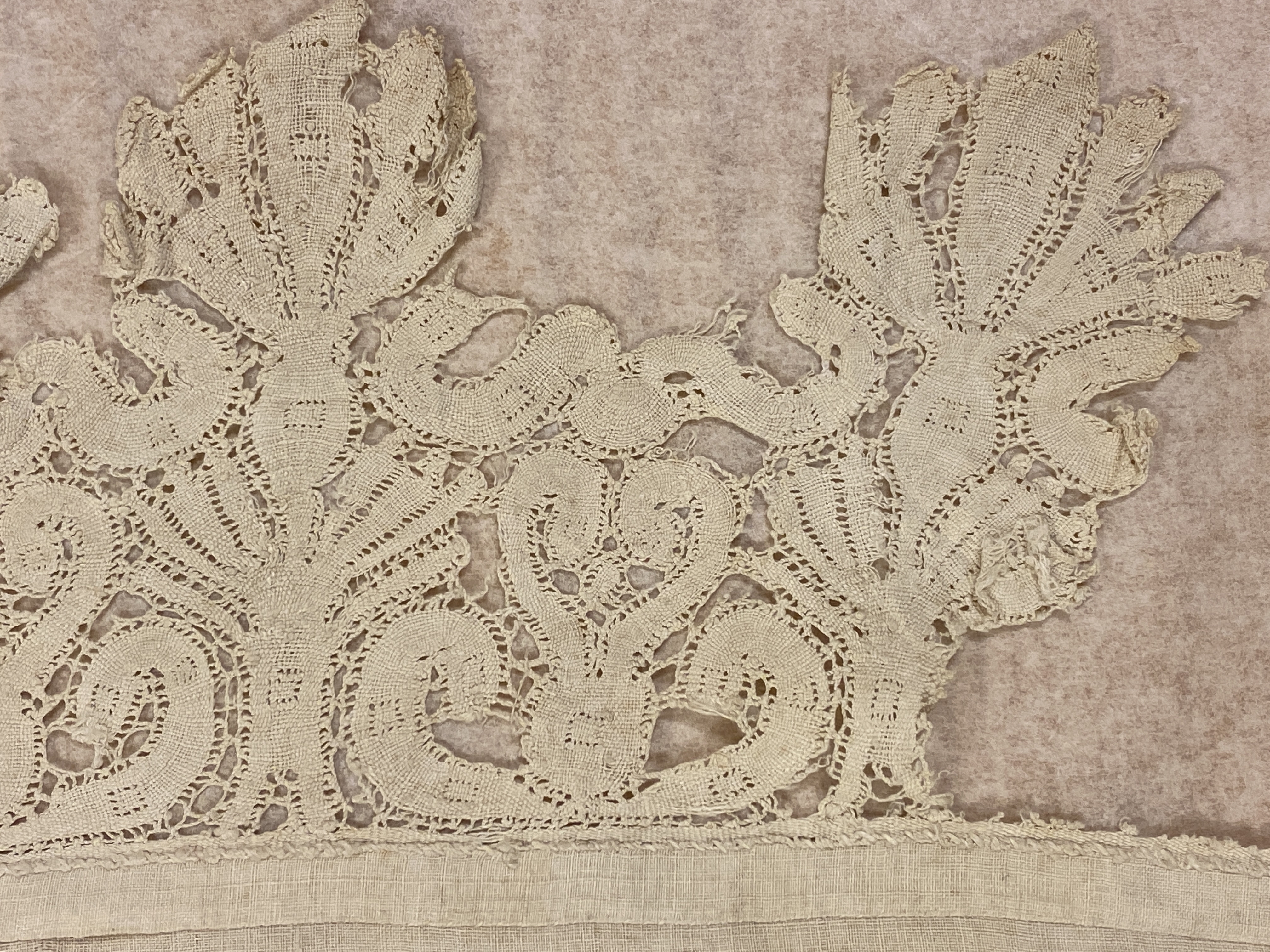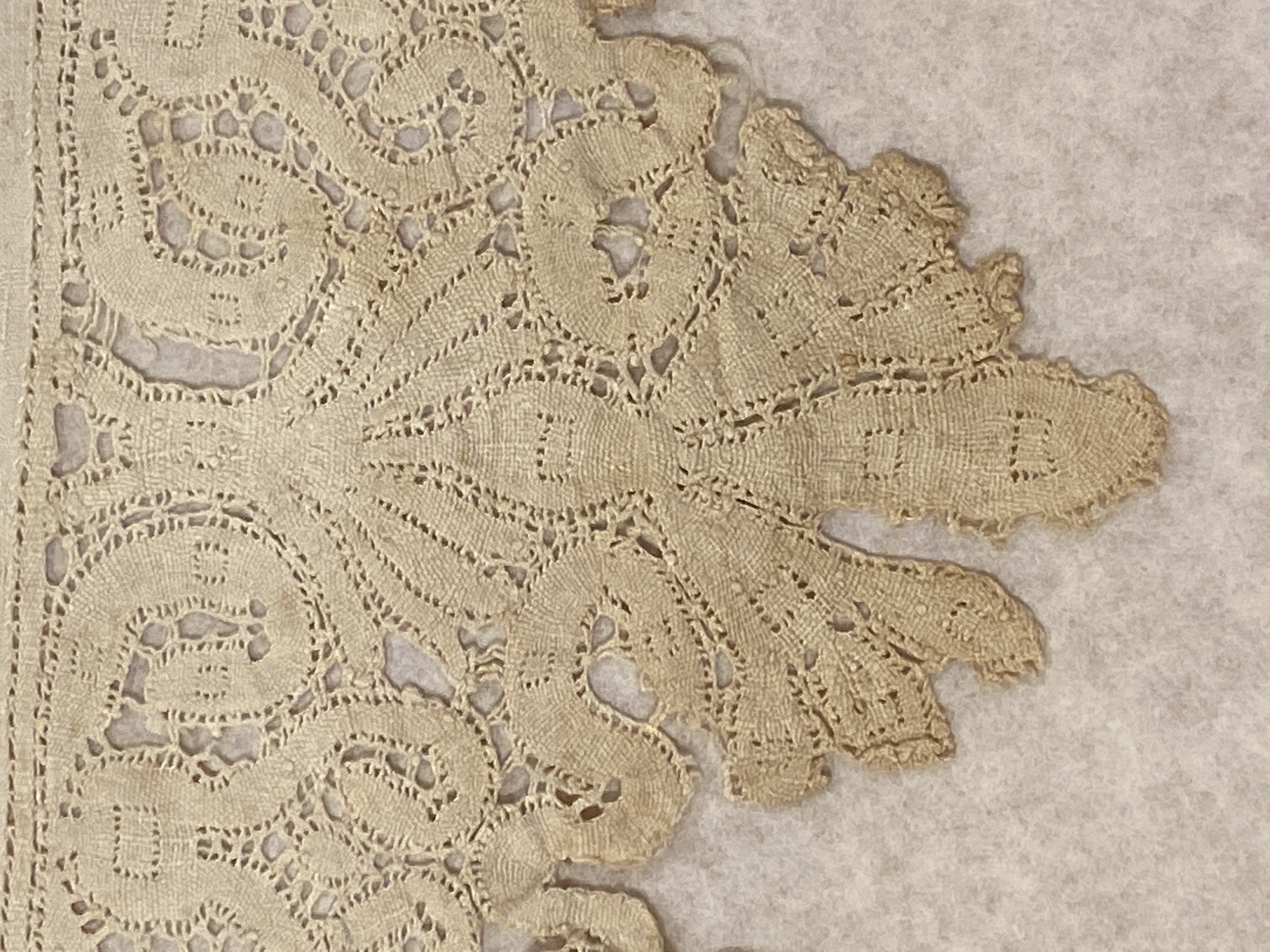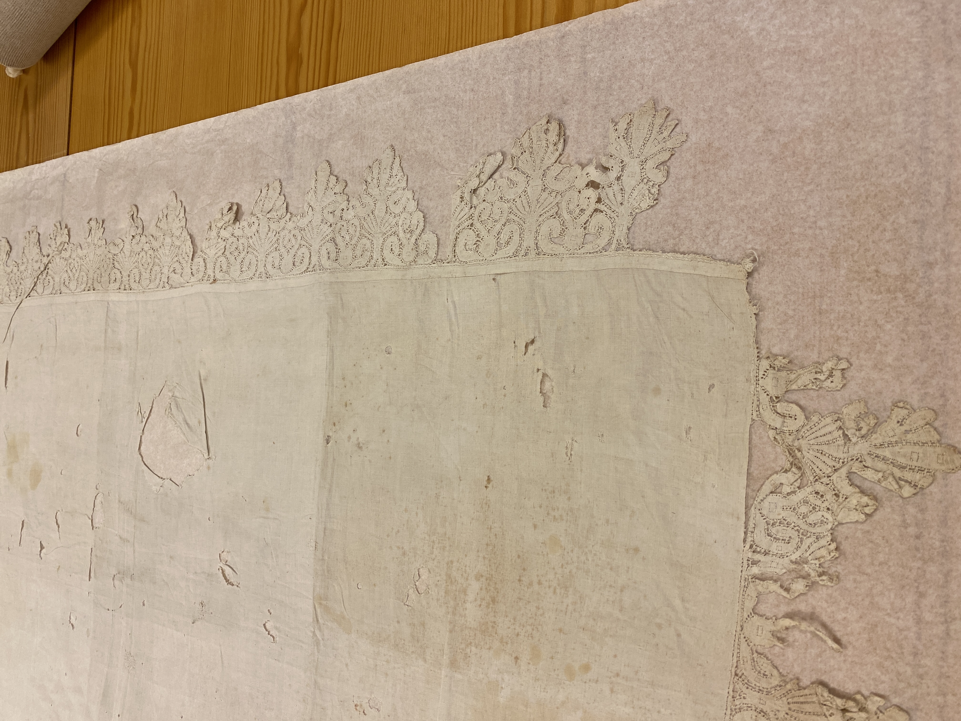 Vitt linne, flandrisk spets. Deponerad i SHM 1986.