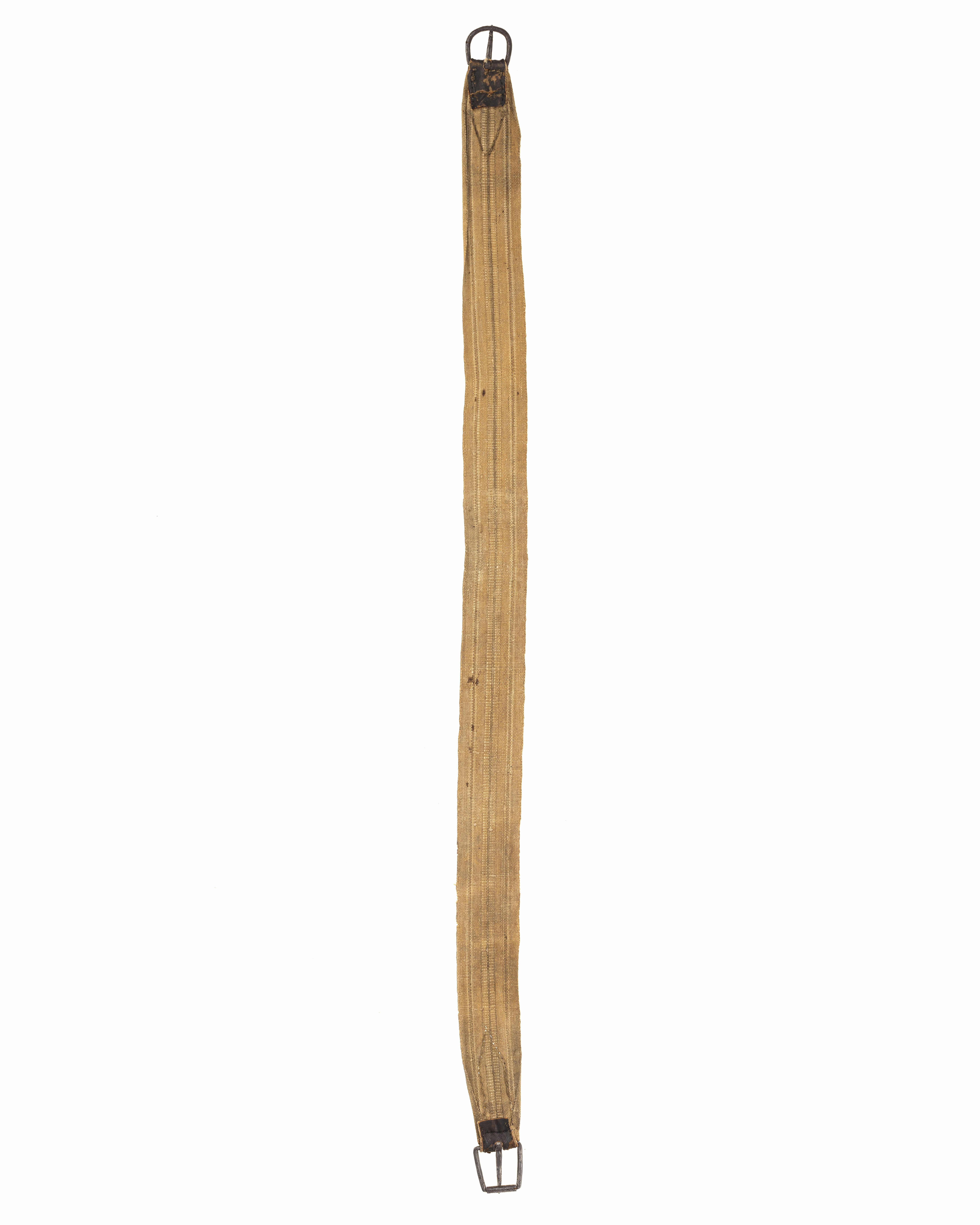 Bukgjord av enkel modell tillverkad av randmönstrat vävt beige linneband. I vardera änden på gjorden finns ett spänne av järn. Bukgjorden är vid spännets fäste och cirka 100 mm ner på gjorden förstärkt med skinn.