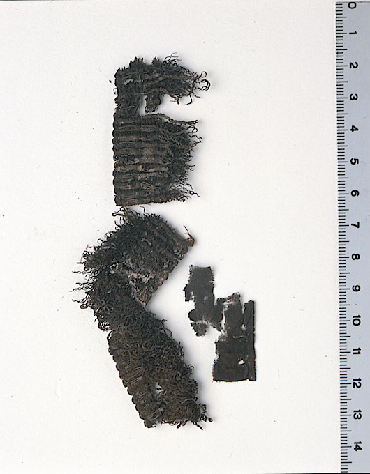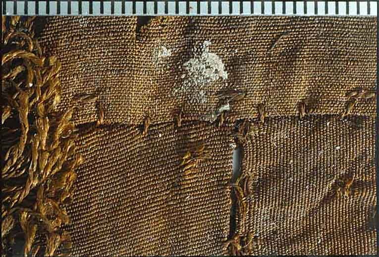 Fragment i tre delar, två fransband och en bit taft. Fransar utmed bottenskivan. De ursprungliga färgerna delvis förändrade, fragmentet numera brunt. Fragmentet är i tre delar. Det ena bandet är vikt så att det bildar en vinkel. Fragmentet ingår i en samling fragment tagna som prov ur drottning Kristinas kista vid gravöppningen den 13-14 december 1965. Taften: Varp: Silke i svag s-snodd, eventuellt 2-trådigt. Trådtäthet: 35 trådar/cm. Inslag: Parallellt liggande fibrer, dvs ingen snodd. Trådtäthet: 32-34 trådar/cm. Material: Silke. Teknik: Tuskaft. Kommentar: Förmodligen densamma som 32975. Nuvarande färg är brun. Fransen: Varp: 2-trådigt silke i s-snodd. Trådtäthet: Många trådar (okänt antal) av silke. Inslag: Silke i s-snodd. Metalltråden är dubbel vilket innebär att 4 stycken metalltrådar ligger parallellt och bildar två öglor i fransen. Trådtäthet: Lite knappt 4 trådar/cm. Material: Silke och metalltråd med silkekärna. Teknik: Bandet till fransen är vävt i varprips. Metalltråden är nedbunden på tre punkter i varje inslag. Kommentar: Materialet i fransen är mycket nedbrutet. Förmodligen densamma som 32974 och 32975. Nuvarande färg är brun.