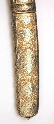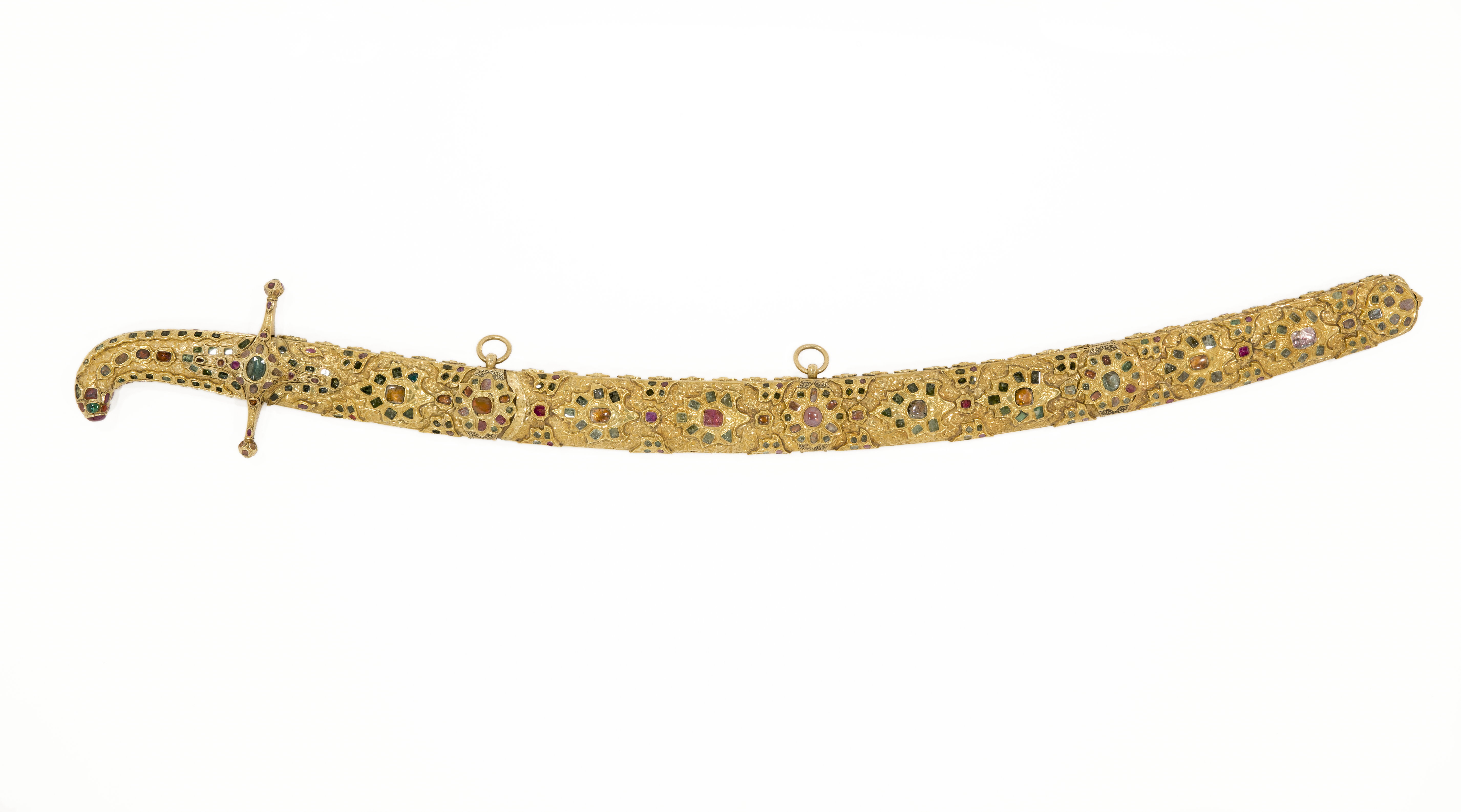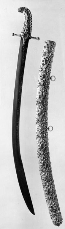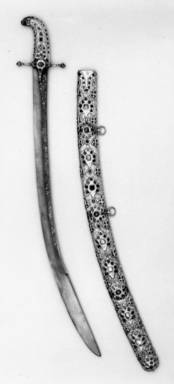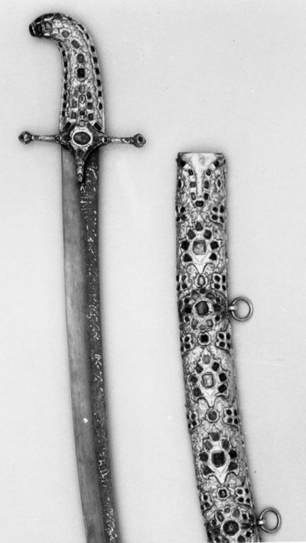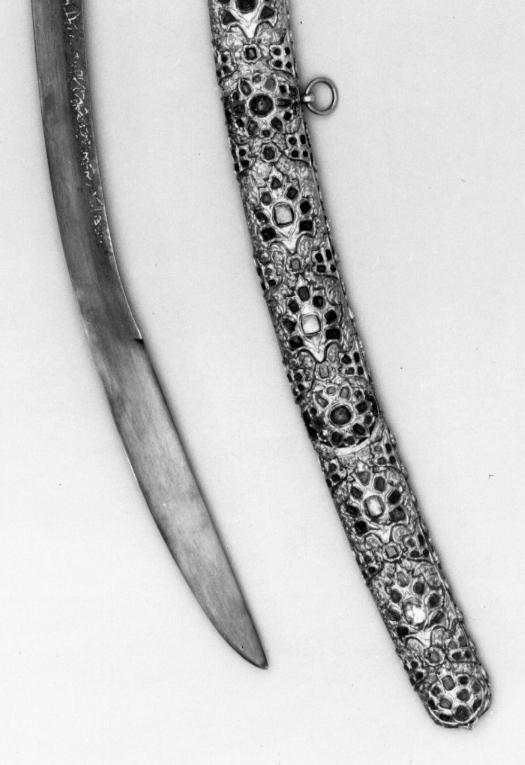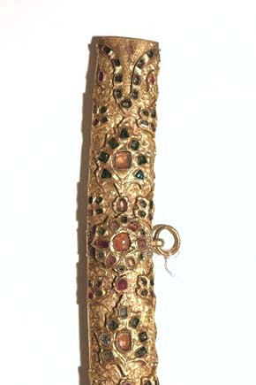 Balja helt klädd med guldbleck. På utsidan ornerad med graverade blommor mot punsad botten och rikt besatt med röda och gröna halvädelstenar och folierade glasbitar. Mitt på baljan stora rosettformiga och palmettformiga fattningar med rosa och gröna stenar. Längs kanterna mindre fattningar. På baksidan bladformiga fattningar. På insidan ornament och kantbård med fina niellerade rankor omgivna av graverade blad och blommor mot punsad botten. Tre beslag med rosettinfattningar på utsidan ca 50 mm bredaoch niellerade band 21 mm på baksidan. Två med hållare med runda koppelringar. Urtag för fästets styrskenor kantat av gröna stenar. Trekantig genombruten släpsko.