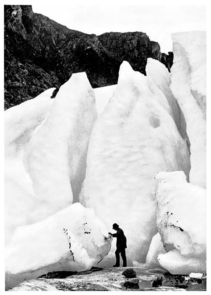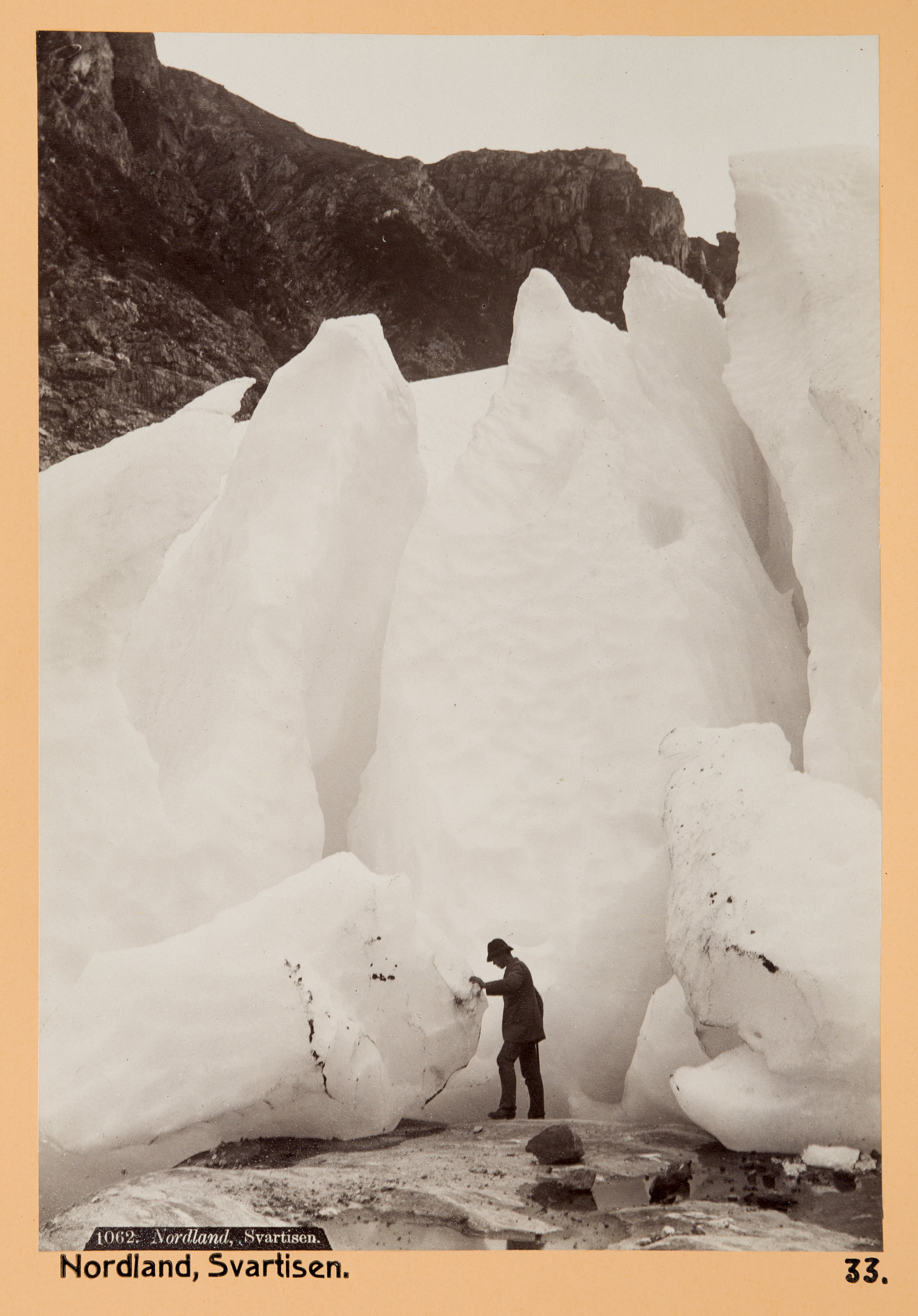 Man på glaciären Svartisen. Fotografierna LXVI:C.01.-33. är inköpta av Wilhelmina von Hallwyl, f. Kempe, i Trondheim, Tromsö och Hammerfest under en resa till Norge tillsammans med maken Walther von Hallwyl, modern Johanna Kempe, döttrarna Ebba, Ellen och Irma, Walthers svägerska Ester von Hallwyl, f. von May, från Schweiz, med sina döttrar Hilda och Irma samt fröknarna Caroline Pflaum och Ida Uhse. Gruppen reste med ångbåten Capella från Trondheim till Nordkap och åter till Trondheim, 1-15 juli 1886. Uppgifterna kommer från Ida Uhses reseanteckningar.