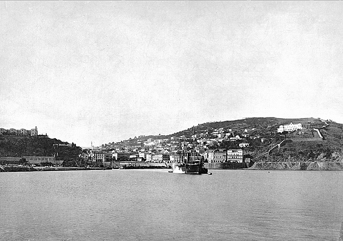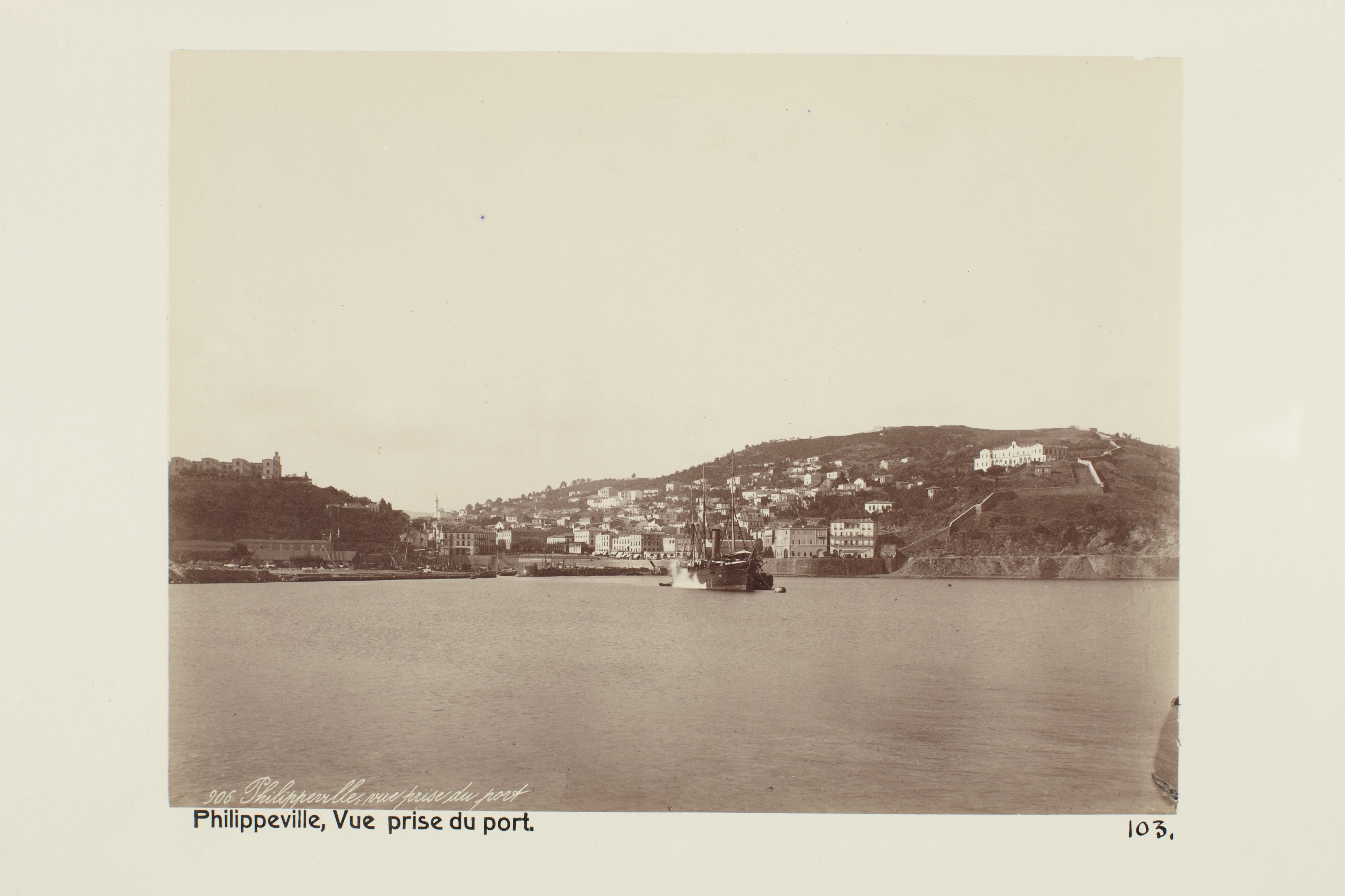 PHILIPPEVILLE (Nuvarande Skikda), Algeriet. Vy från hamnen. Foto från resa genom Algeriet och Tunisien samt åter över Schweiz, 11 februari - 19 maj 1889. Samtliga foton i gruppen LXVI:F. är inköpta av Wilhelmina von Hallwyl i Alger, Biskra, Tunis, Constantine, Oran och Blidah vid hennes vistelse i nämnda städer tillsammans med sin make, Walther von Hallwyl, sin mor, Johanna Kempe, f. Wallis, dottern Irma samt fröknarna Caroline Pflaum och Ida Uhse. Uppgifterna kommer från fröken Ida Uhses reseanteckningar.