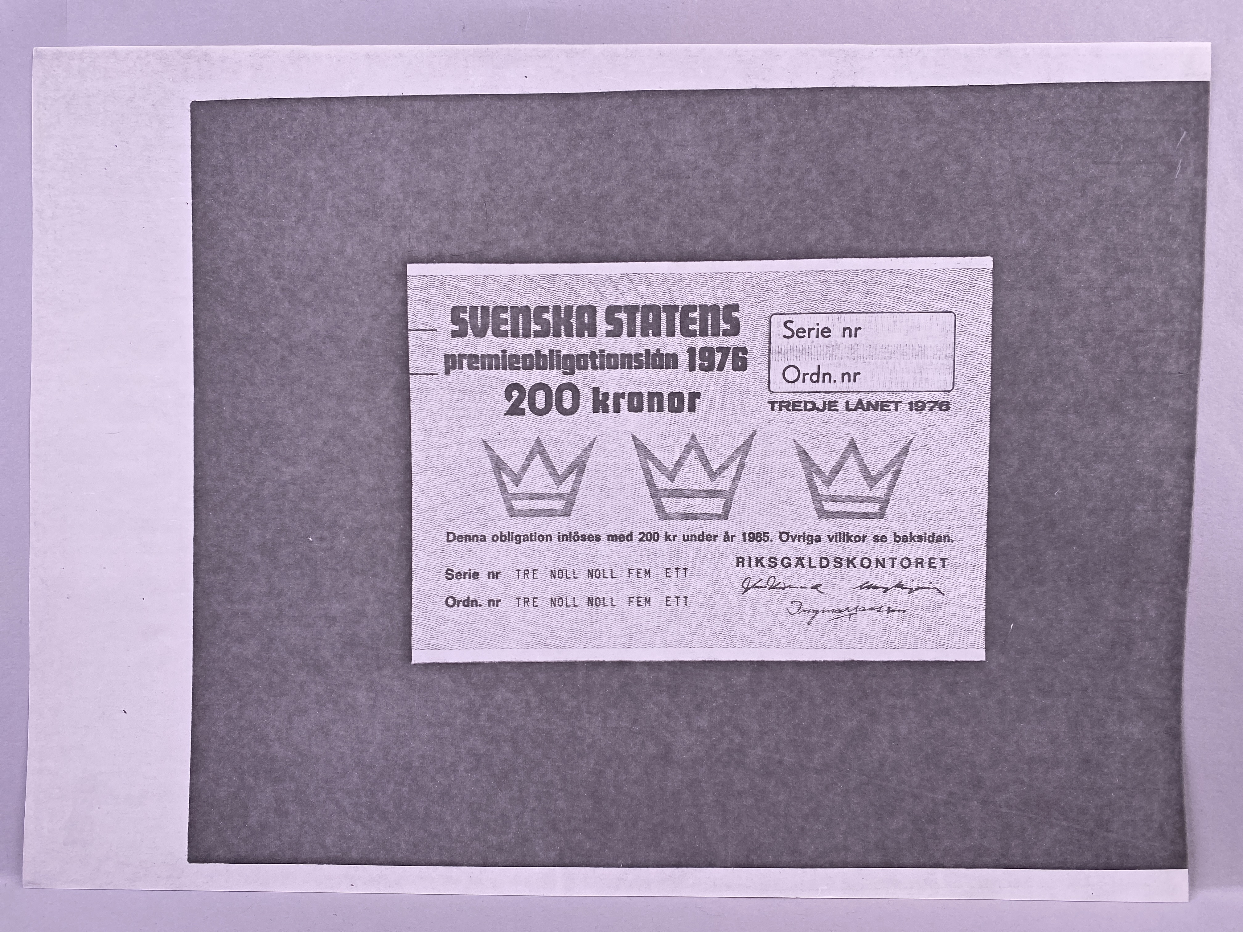Fotostatkopia på obligation som "inlöses med 200 kr under år 1985". Tredje lånet 1976. Serie nr /, ord. nr /. Designförslag.