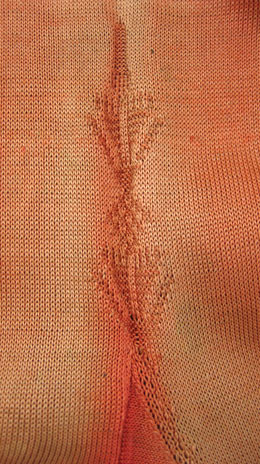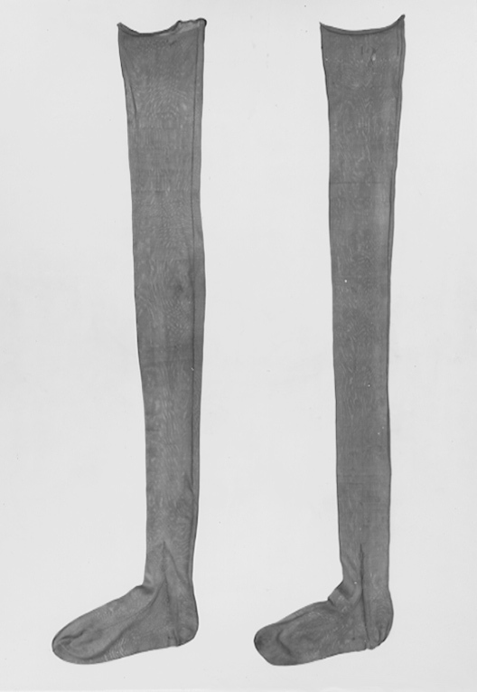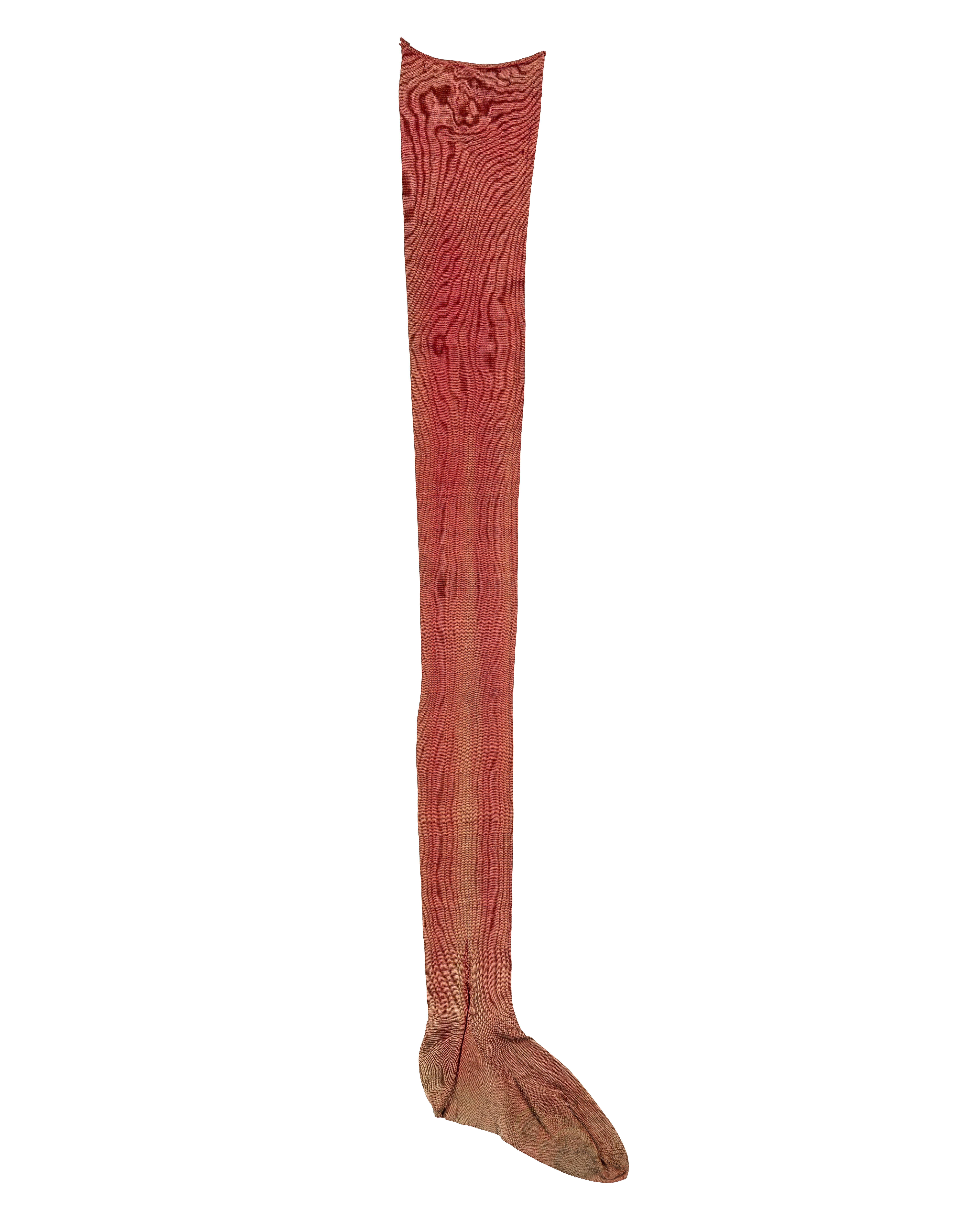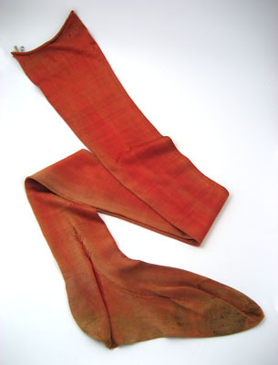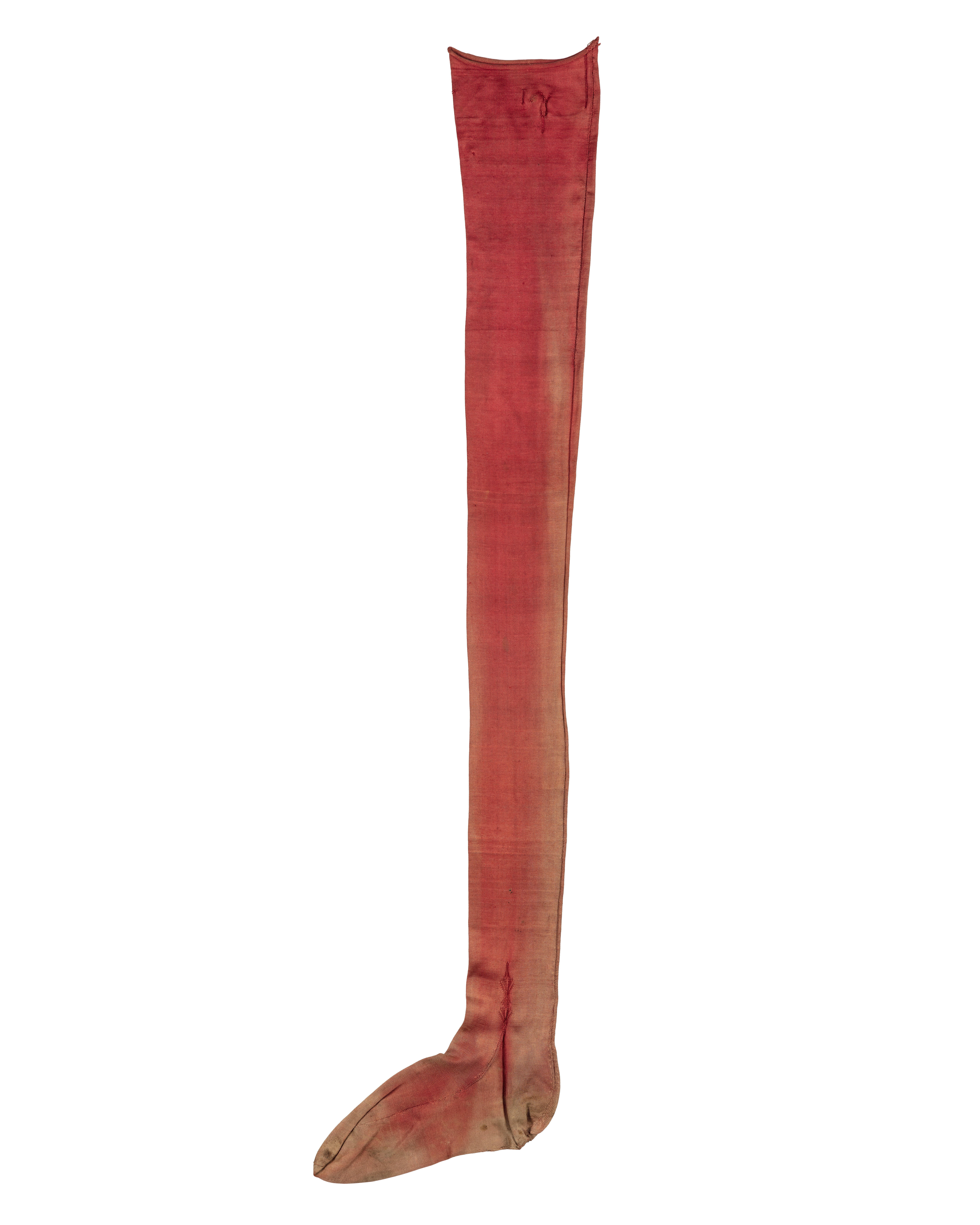 Röd lång silkesstrumpa med söm mitt bak som löper ner under hälen. Strumpan har hälsöm, förstärkt tåsöm och fotkilar. Från tån utgår ett parti med två rader avigt stickade maskor som med hälsömmen möts i en kil upp mot benet och mynnar ut i en pildekor, bredd: 15 mm, höjd: 60 mm, i konststickning på båda sidor om foten.