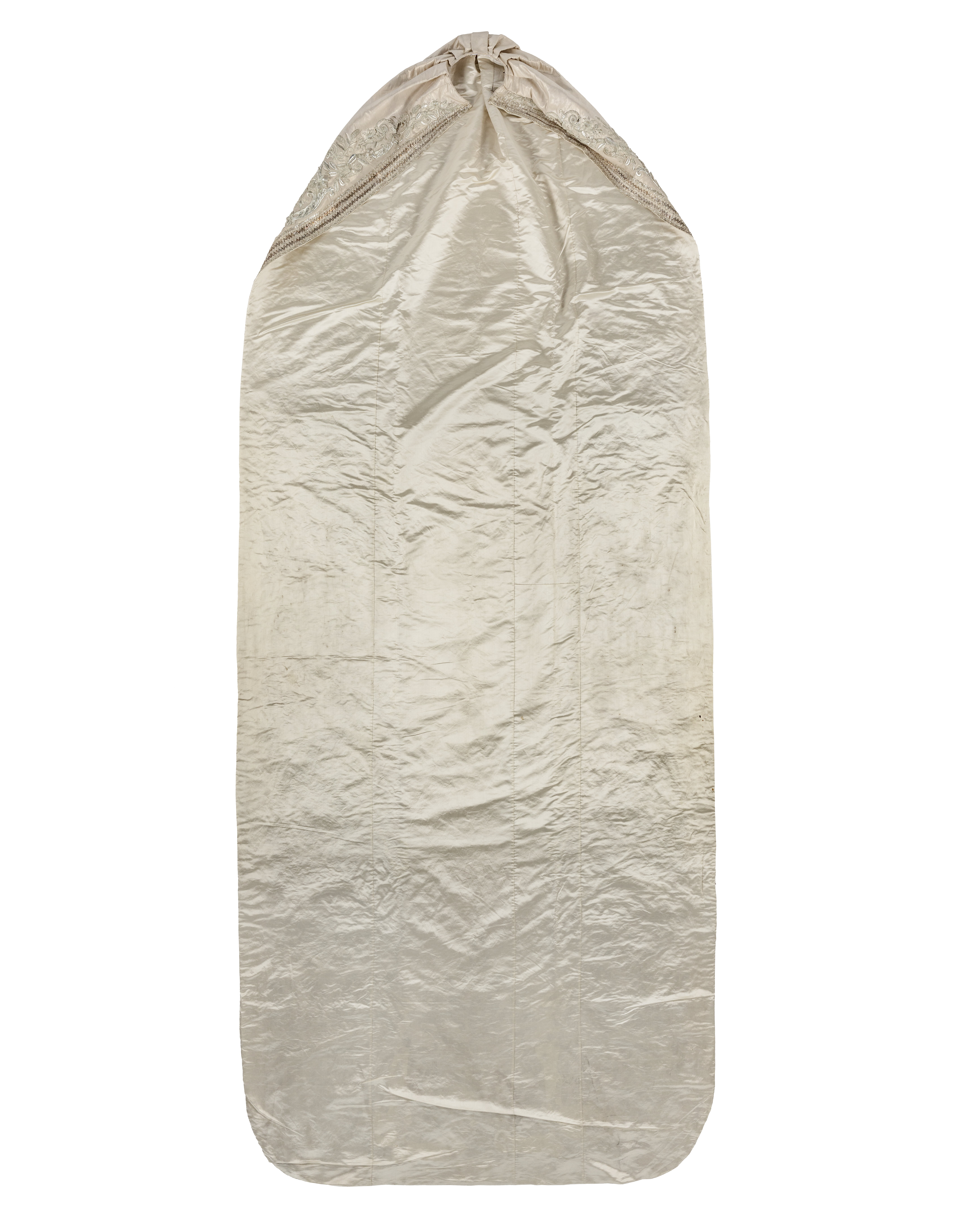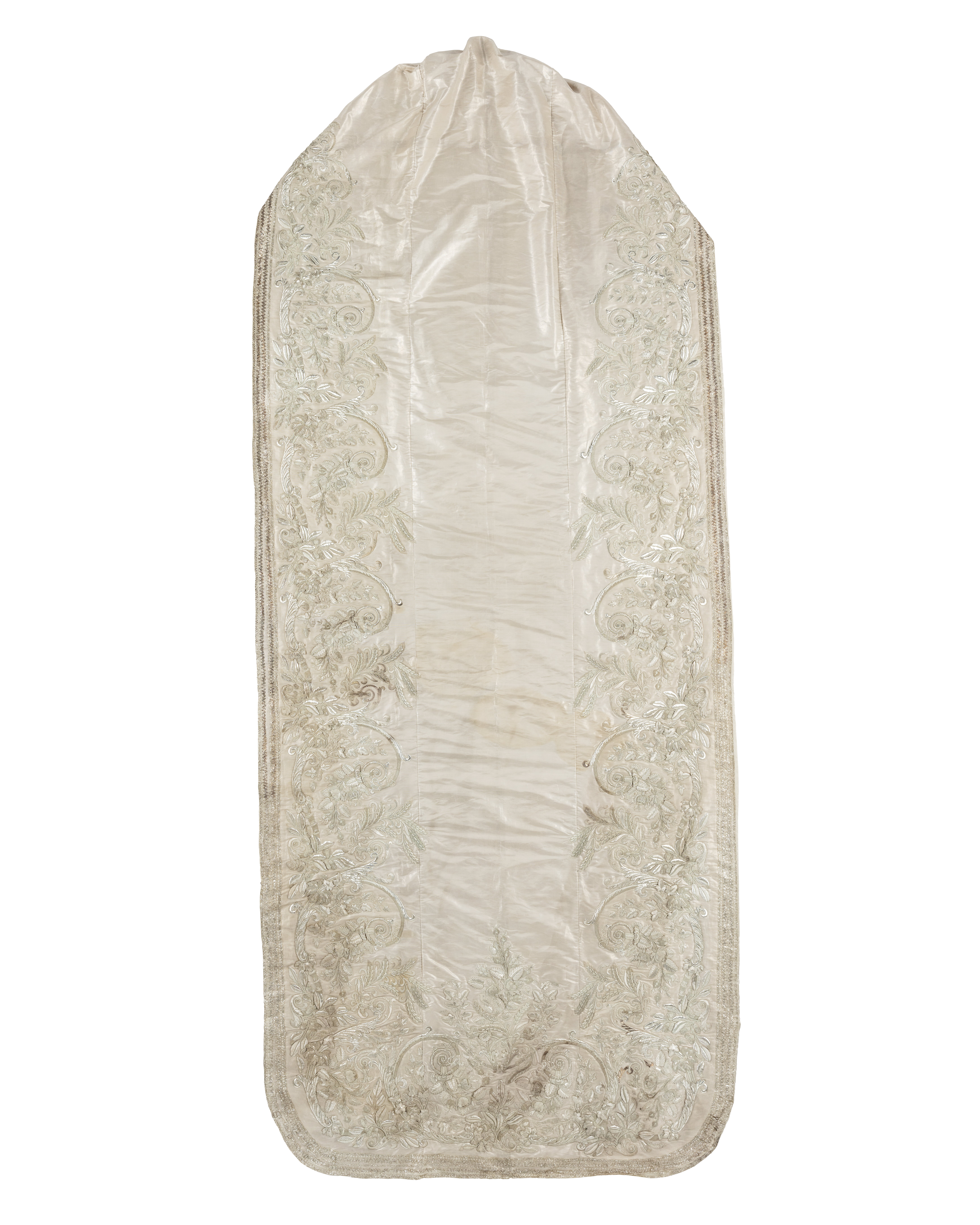 Till prinsessan Lovisas brudklänning, använd vid förmälningen med kronprins Karl sedemera Karl XV 19 juni 1850. Släp av silverinvävt vitt siden med upphöjda blomsterbroderier. Hopsytt av tre delar och med foder av tunnt vitt siden. Runt släpets ytterkant löper ett ca 70 mm brett zickzack-mönstrat broderi av silvertråd. Innanför broderiet löper ett matelassébroderi av silver och silverpaljetter föreställandes prunkande blomster och växter. Olika sorters blommor och blad samt ax av korn eller råg. Broderierna är relativt smala upptill men växer sig allt bredare längre ner på släpet. Upptill är släpet veckat och format för att passa runt midjan, på insidan fastsytt ett ca 10 mm brett sidenband med tre hakar, två längt ut och en i mitten, för att fästa släpet i kjolen. I fodret strax under bandet mot respektive ytterkant är fäst en ögla av tjockare linneväv.