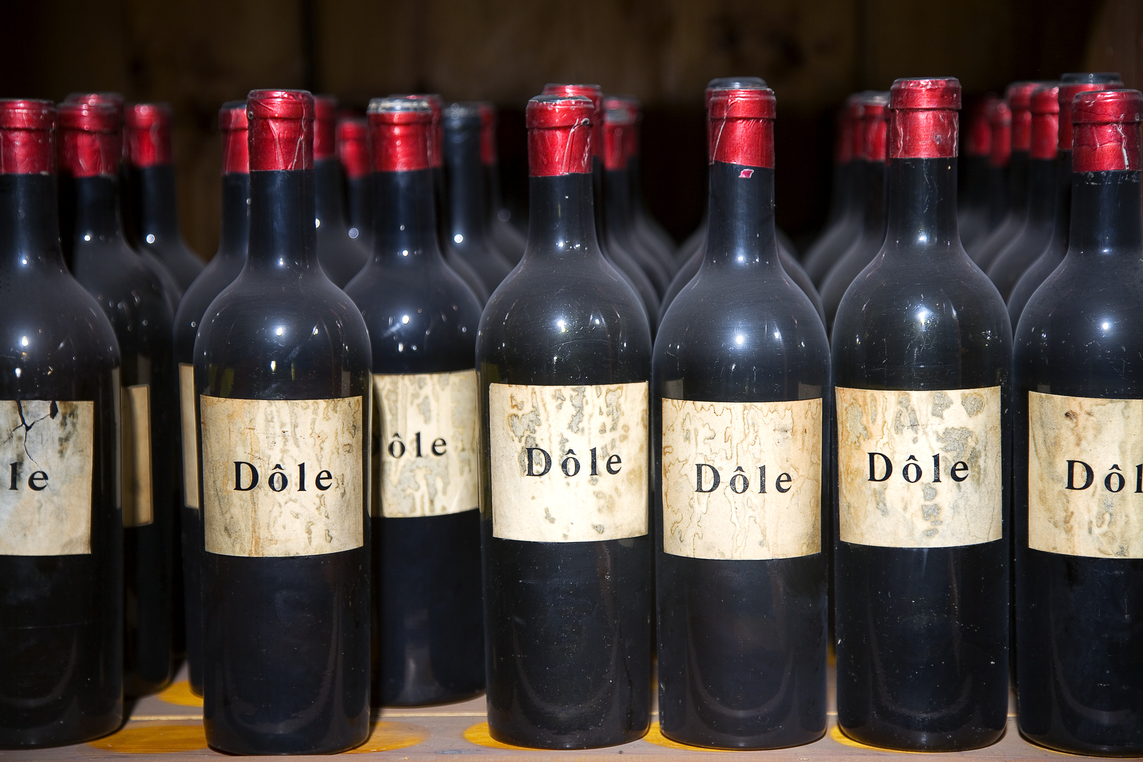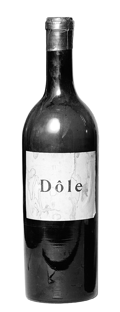 DOLE, åttiosju helbuteljer Av mörkgrönt glas. Cylindriska, med kupigt indragen skuldra och smal cylindrisk hals med stärkring; bottnen konisk, högt uppskjutande. Etikett vit, på denna i svart: "Dôle". Kapsylfragment av förtent bly, rödfärgat. Höjd: 30 cm.; diameter: 8,2 cm.