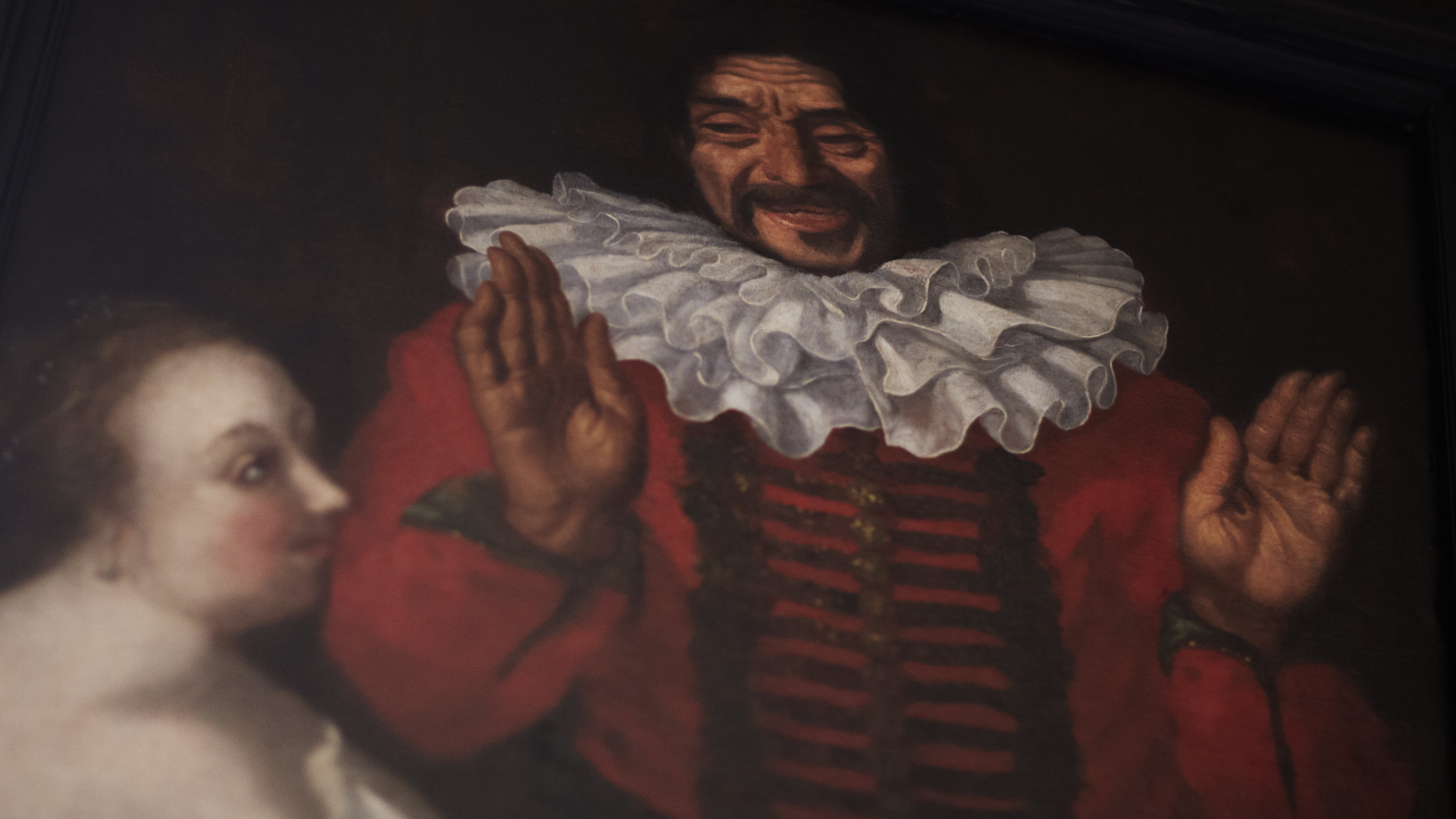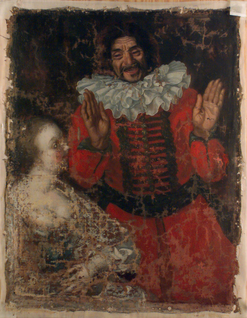 Stående knäbild, fas leende med upplyftade händer, röd rock med guldribbor, nedliggande, veckad, vit krage i tre lager. Till vänster sittande dam blickande upp mot honom, blått liv, gråvit klänning. Ny kilad spännram. Duken på baksidan överklistrad med papper. Svart, profilerad ram, bredd 95 mm. Wrangellapp på ramen: "N:o 533 Hasenberger 6 Rd". Tillskrivet med blyerts: "Hofnarr hos C G Wrangel".