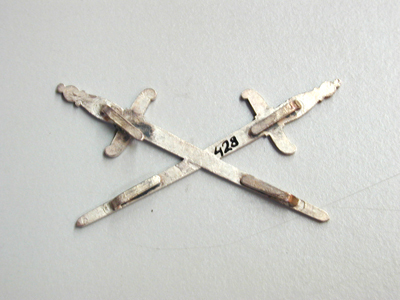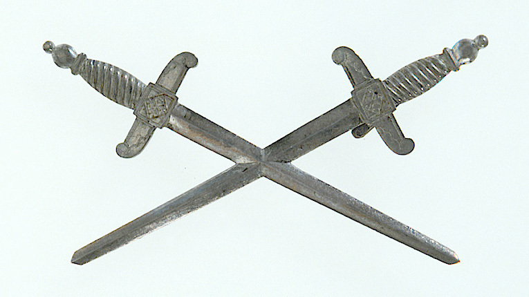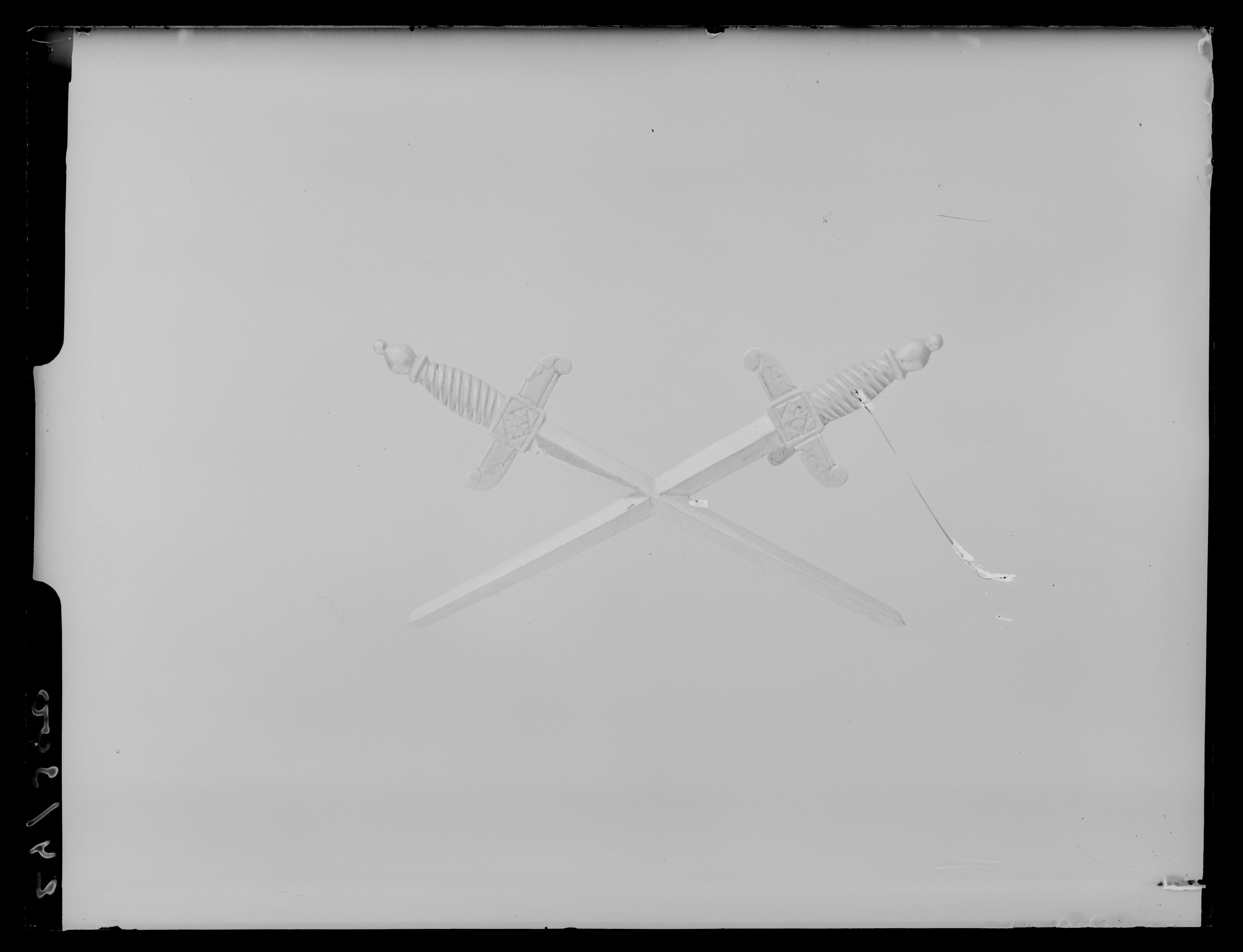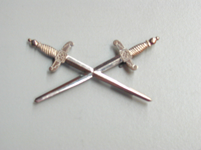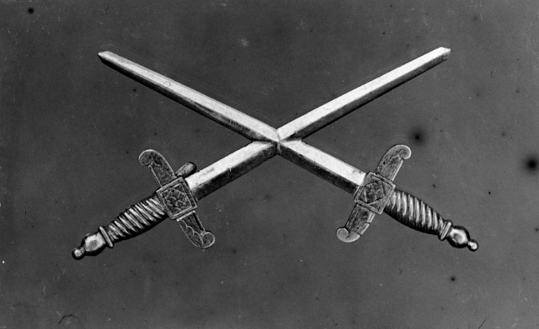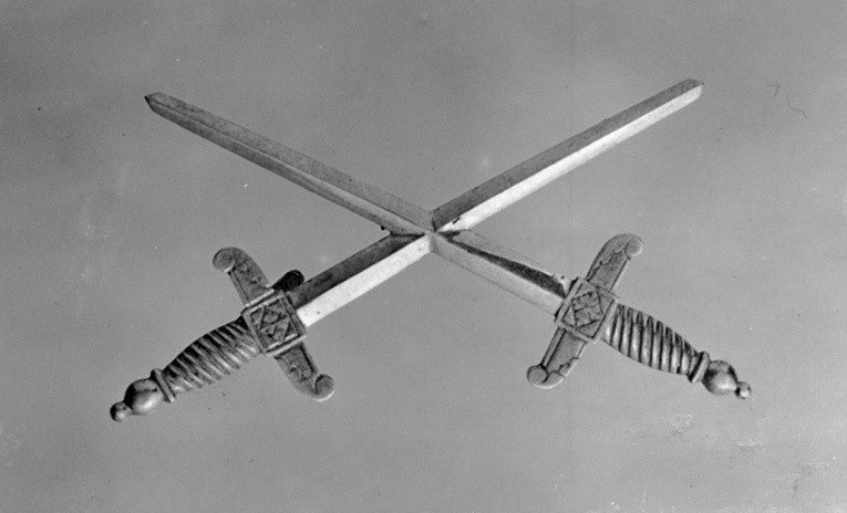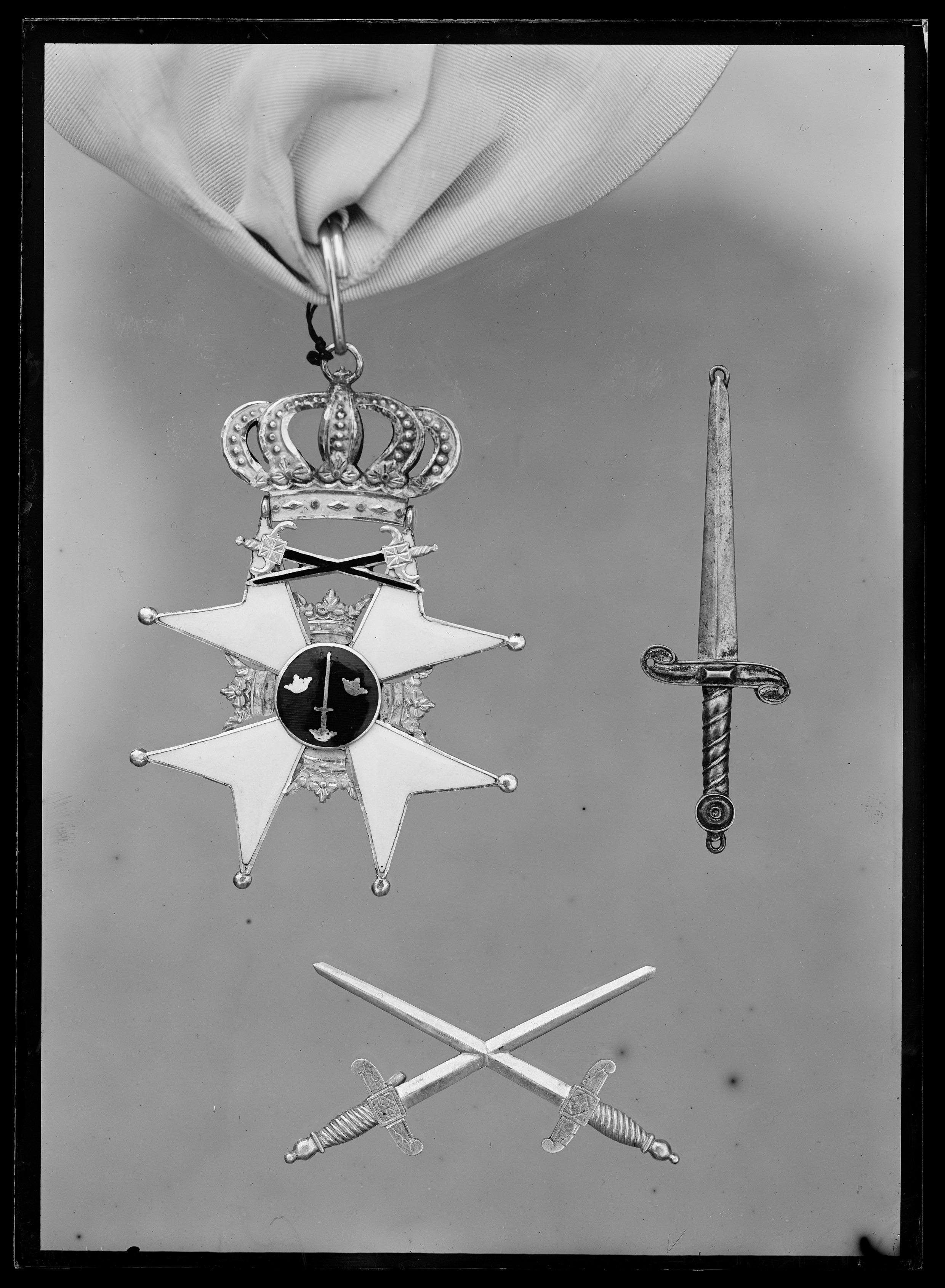 Bröstdekoration för riddare med stora korset av Svärdsorden, för person som tidigare är kommendör med stora korset av Svärdsorden enligt 1788-1798 års stadga, för riddare med stora korset, 2 kl., enligt 1844-1902 års statuter. Två korslagda svärd av silver med spetsarna uppåt, tvåeggade klingor med mittås, fästen med plommonformiga knappar med nitknapp, s-formigt svängda parerstänger, kvadratiska kryss, spolformiga kavlar med gles lindning. Baksidan slät med inåtriktade hakar, fastlödda på varje spets.