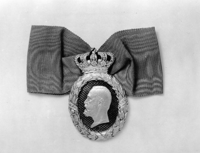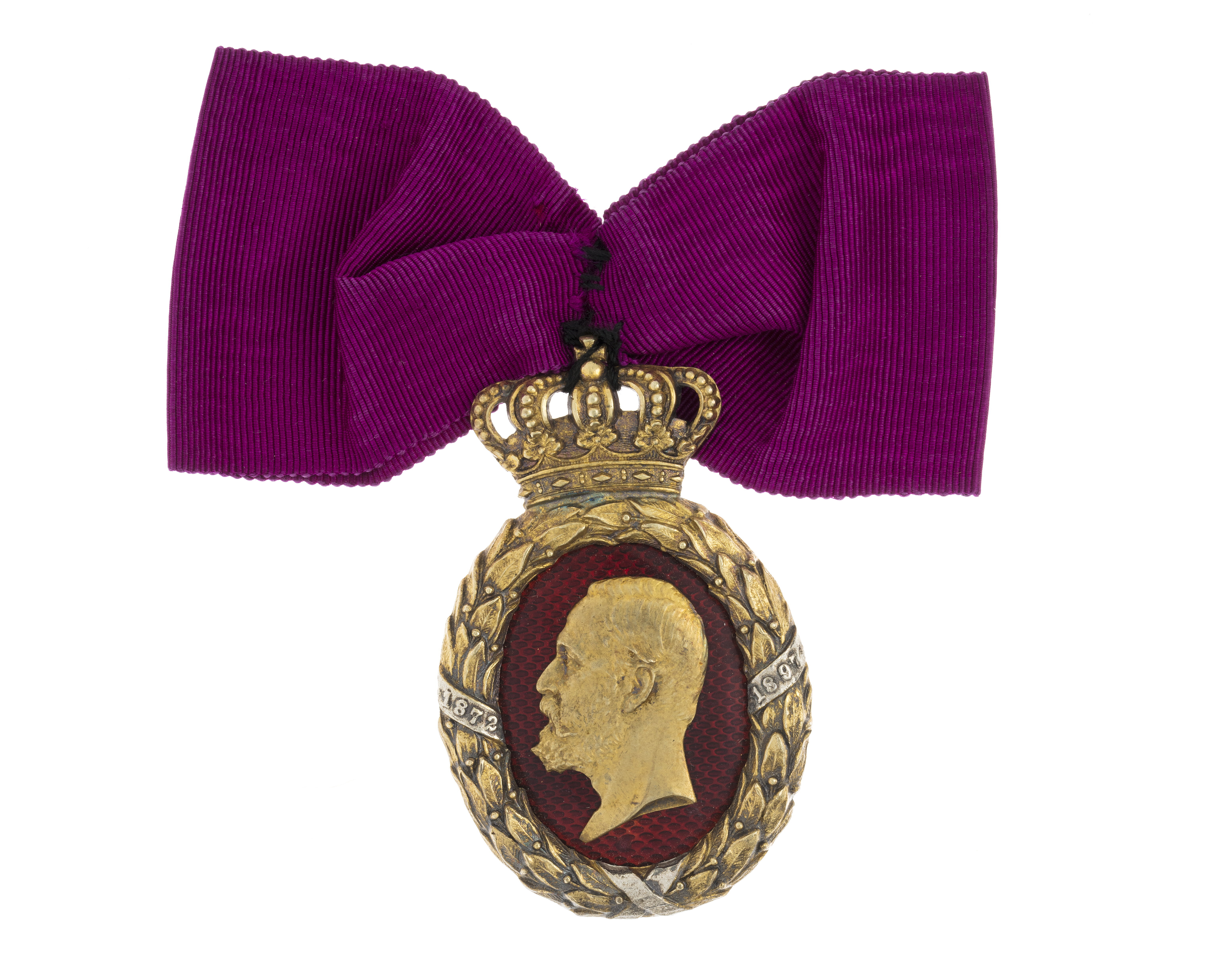 Oval täckt av genomsynlig röd emalj, därpå reliefporträtt av Oskar II, halsbild, profil vänster. Runtom lagerkrans av guld, omlindad med silverband med årtalen 1872 och 1897. Kransen krönt av kunglig krona av guld. Bakom kronan bygel, däri fäst spiralformig ring. Förvaras tillsammans med nr 619 i etui nr 620. Buret av drottning Sofia (1836-1913), gåva av hennes stärbhus genom chefen för konung Gustav V:s hovförvaltning.