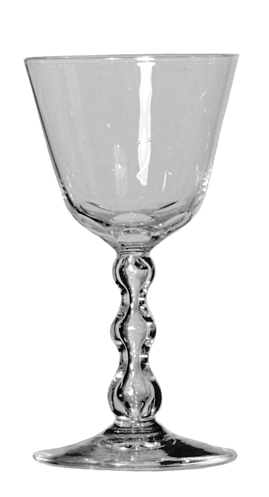VINGLAS på hög fot, fyra stycken , av färglöst glas. Kuppa omvänt konisk, med rundad botten, kring denna på utsidan sex slipade runda s. k. oliver; ben (skaft) balusterformigt, med tre vulstiga utsvällningar; fotplatta låg, svagt kupig, slät. Mått: H:11,1 - 12; D: 5,9 - 6,6 cm. Fot: D: 5,6 - 5,7 cm