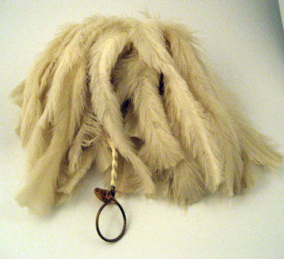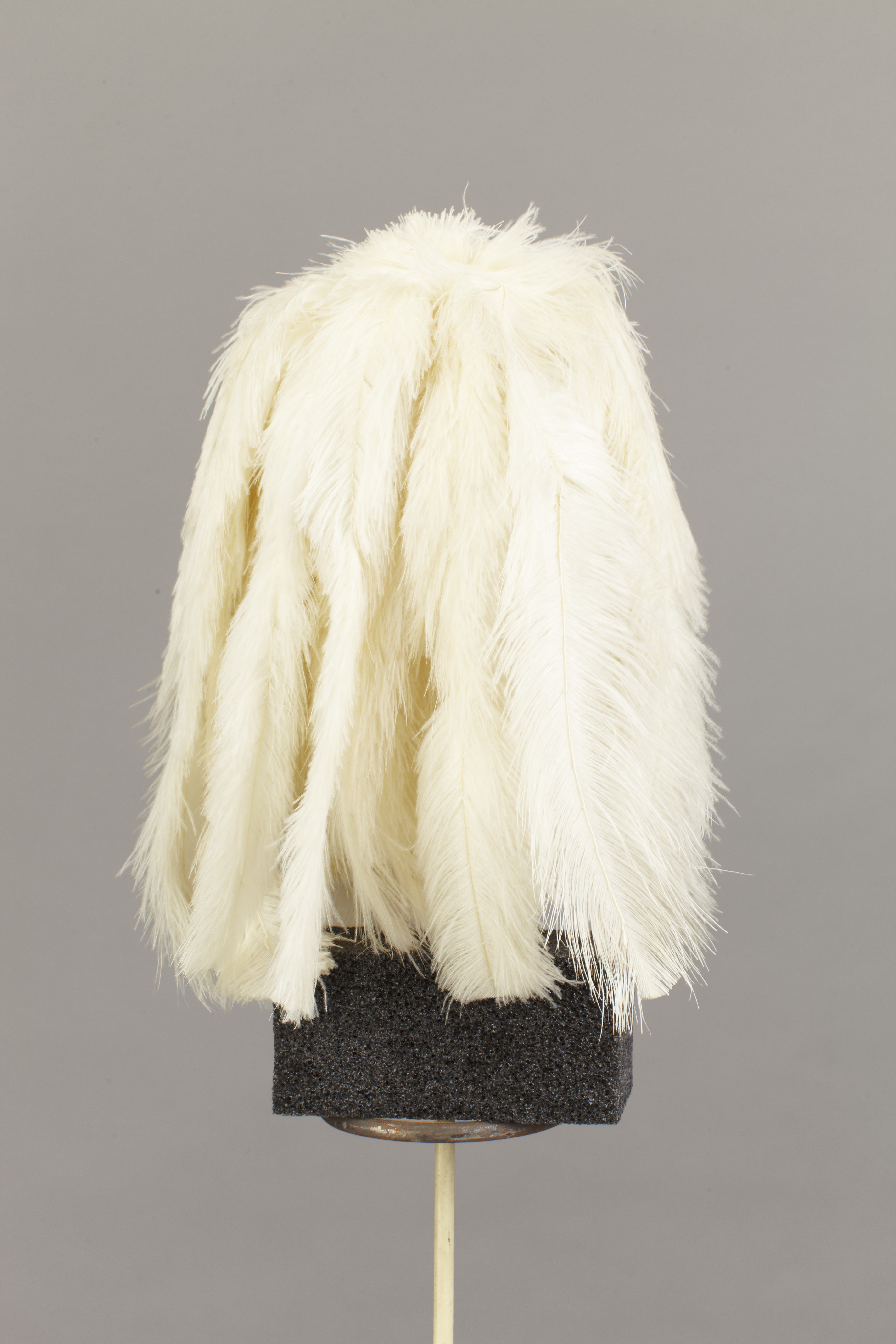 Vit plym bestående av många vita strutsfjädrar som faller åt sidorna. Ett tvinnat skaft, 135mm långt, av förgylld mässing, klädd med vitt skinn. Avslutas med en rund ögla.