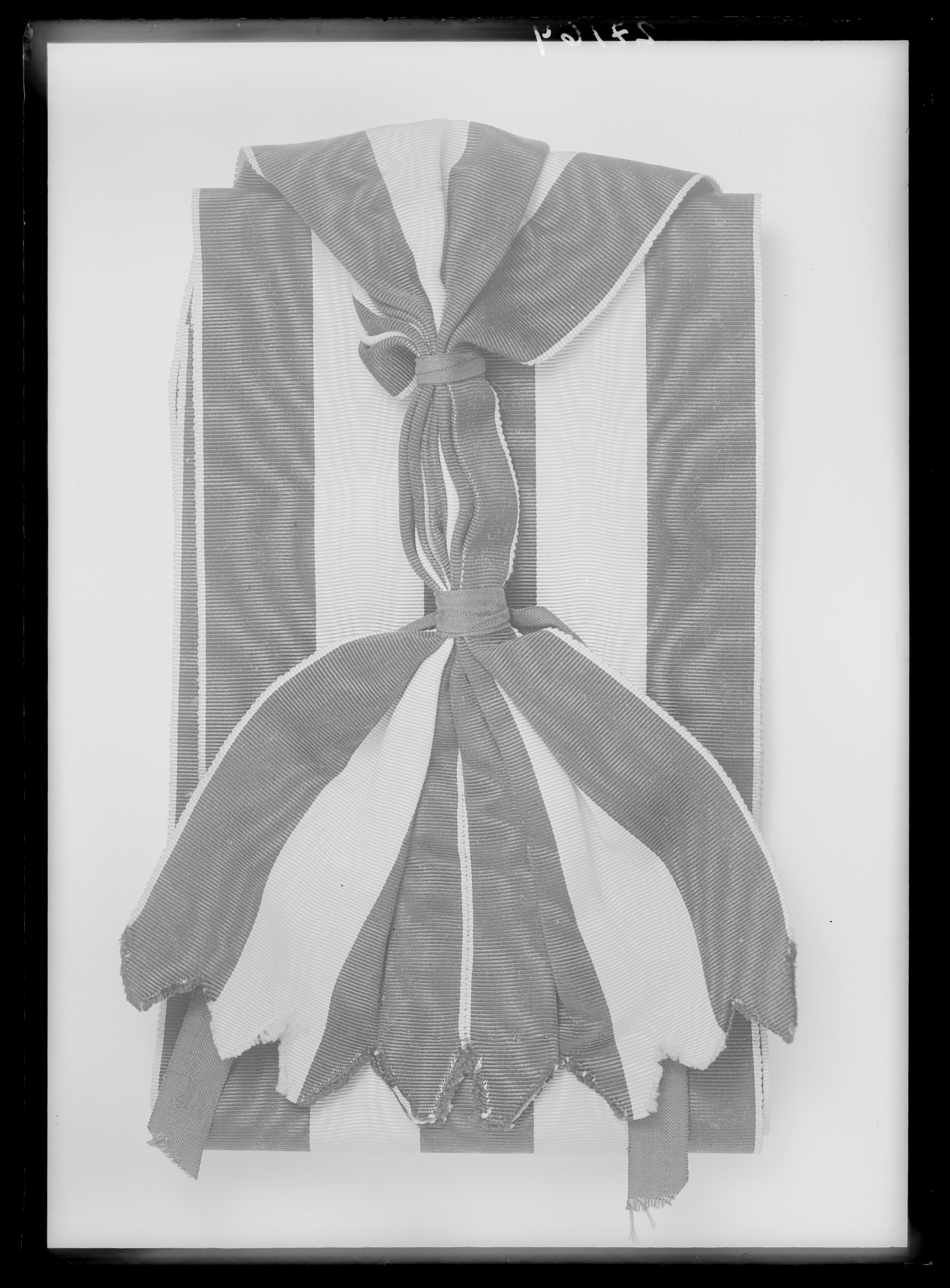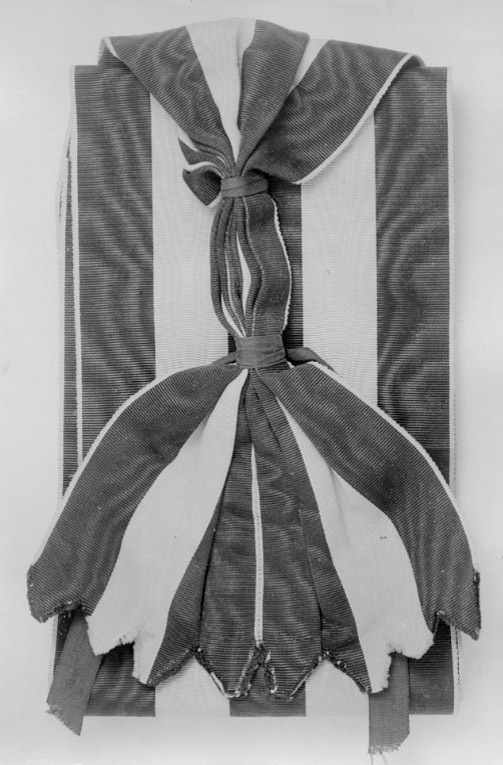 Axelband av gulorange sidenmoaré med tre 20 mm breda, svarta ränder, tandade bandändar, ihopsydda, så att banden delvis täcker varandra, banden därovanför veckade och sammanbundna med två svarta sidenband.