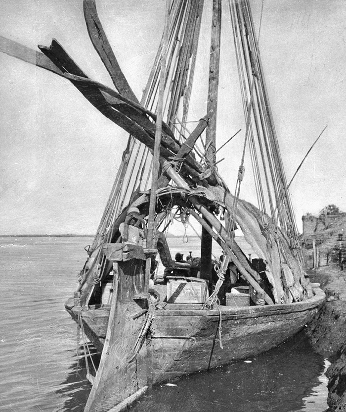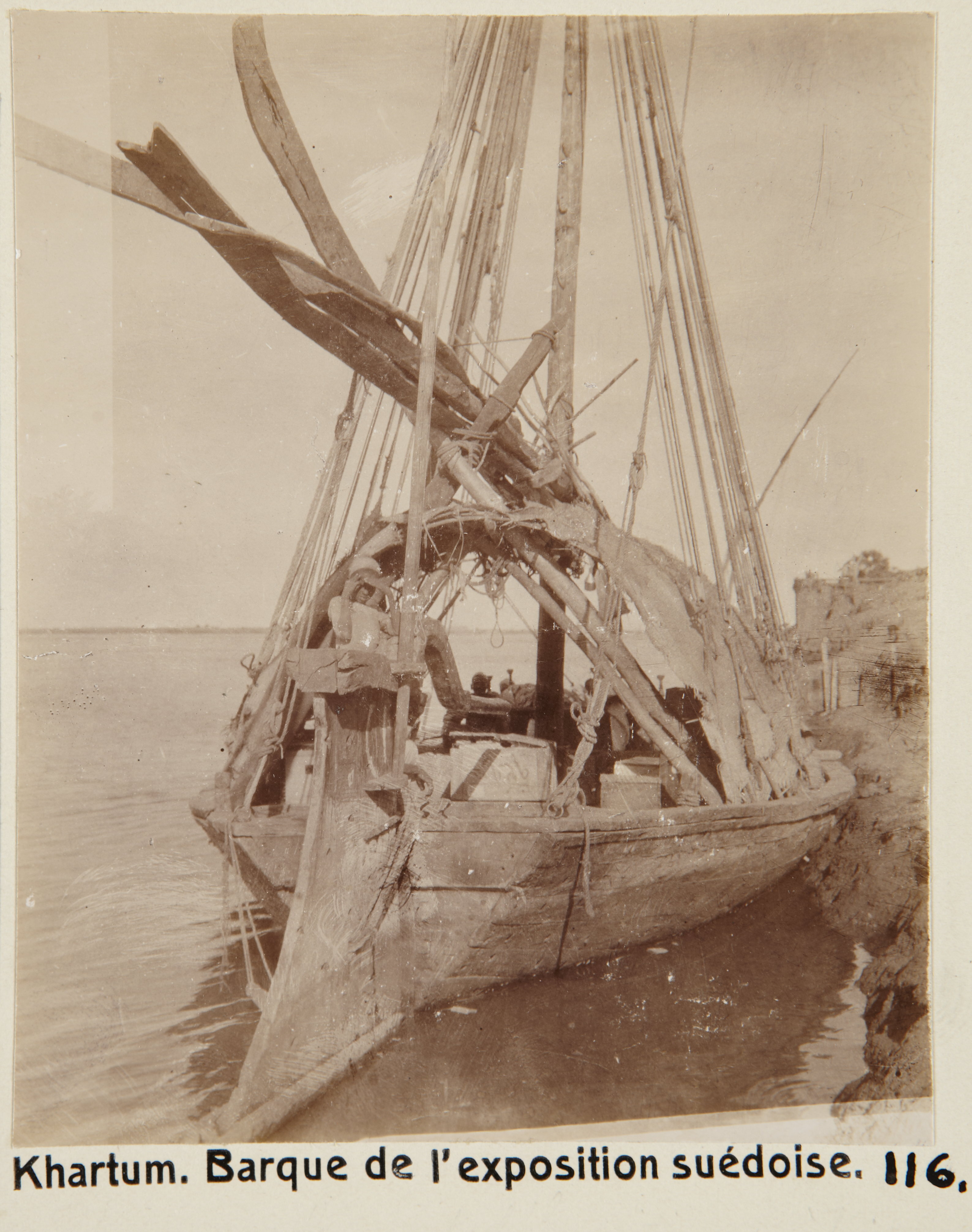 Den svenska expeditionens båt. Khartoum, Sudan. På fotografiet står det "Khartum. Barque de l'exposition suédoise" - den svenska utställningens båt, men i museets katalog står det "l'expédition. Fotografierna LXVI:M.01.- 201. kommer från resan till Egypten och Sudan som Wilhelmina och Walther von Hallwyl gjorde vintern 1900-1901. De lämnade Sverige den 5 november 1900 och fortsatte från Egypten till Palestina den 28 mars 1901. Med på resan var döttrarna Ellen med maken Henric de Maré och Irma med maken Wilhelm von Geijer. Wilhelminas sällskapsdam, fröken Ida Uhse reste också med. Under en del av resan anslöt sig ledamoten av Internationella domstolen i Kairo, assessorn Otto Conrad Waldemar Cedercrantz med makan Anna Elisabeth. Vid resan uppför Nilen hade Walther von Hallwyl hyrt ångfartyget Columbia med besättning. Båtresan startade i Kairo 27 december 1900, gick ända till Wadi Halfa varifrån man reste vidare med tåg till Khartum och tillbaka till Wadi Halfa. Båten vände åter i riktning mot Kairo, men det verkar som att sällskapet tog tåg sista biten, från Luxor. Henric och Ellen de Maré samt fru Cedercrantz lämnade båten redan då de passerade Luxor första gången. Resten av sällskapet återvände till Kairo den 1 mars. Fotografierna LXVI:M.01.-120. togs av resenärerna själva, de största av Ellen de Maré, de mellersta av Wilhelmina von Hallwyl och de minsta av Wilhelm von Geijer. Resten köptes av professionella fotografer i Kairo, de flesta från Studio Photogr. Artistique G. Lekegian & Cie. Alla uppgifter kommer från Ida Uhses reseanteckningar.