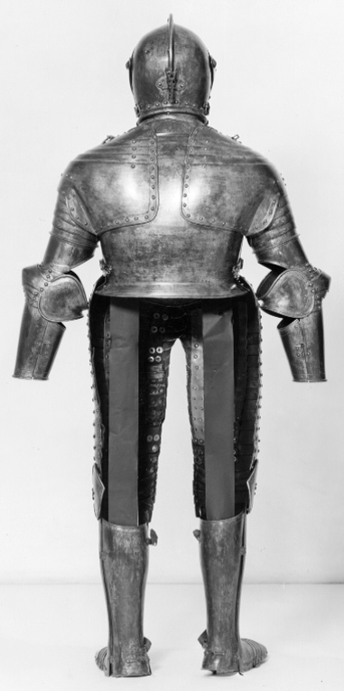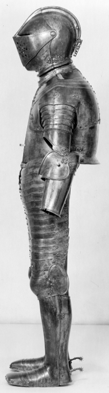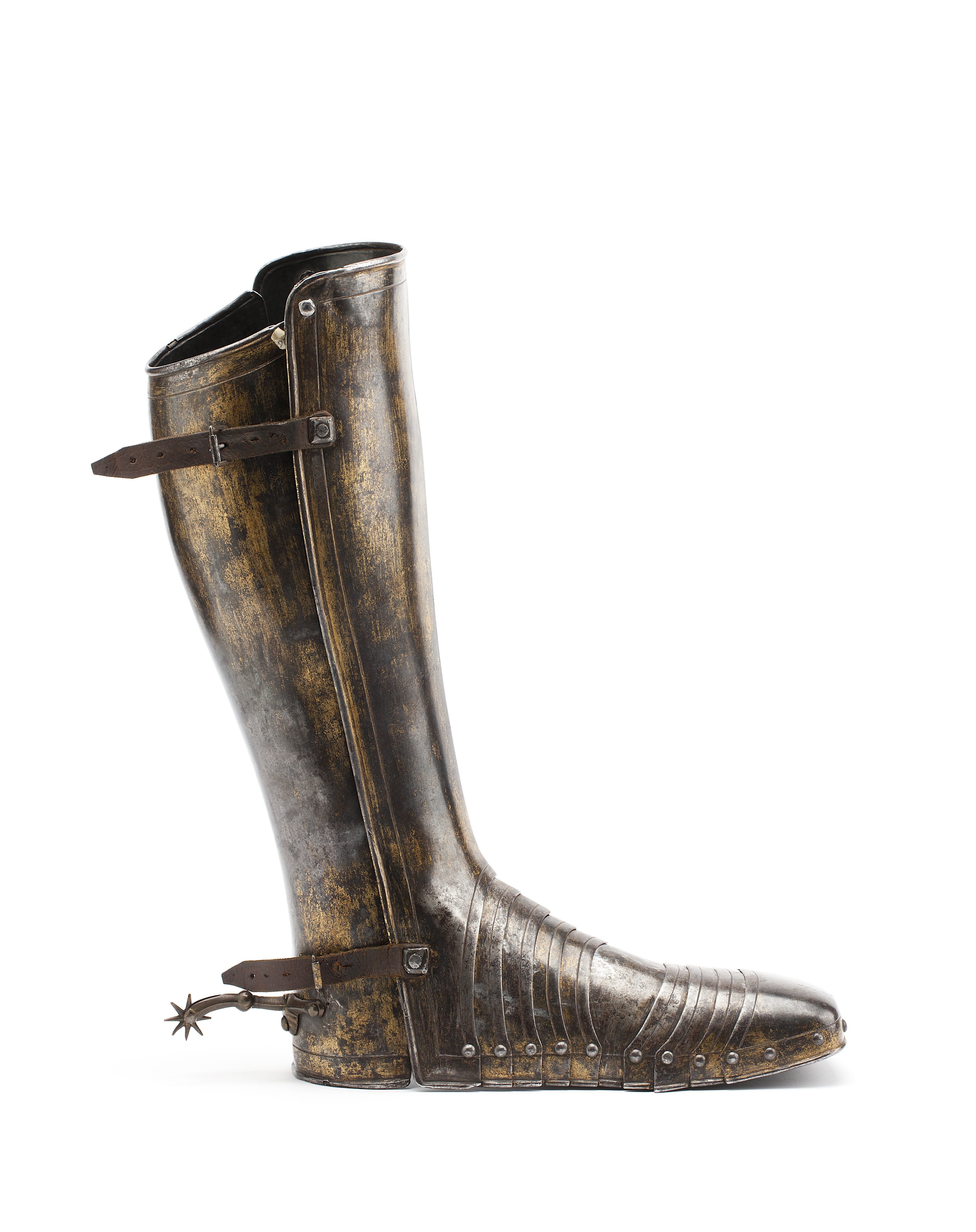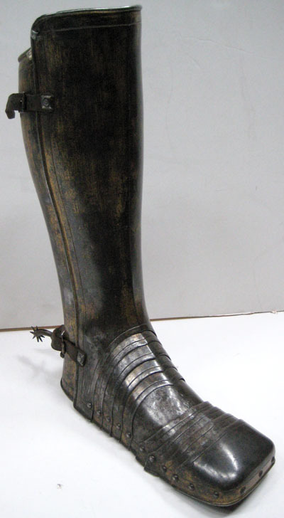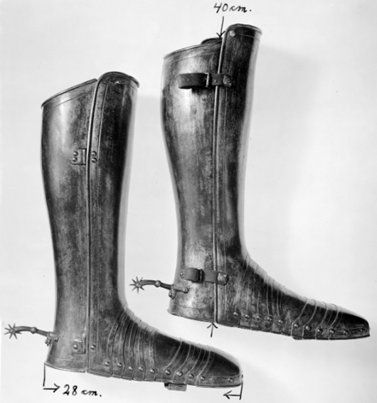 Anskaffad av Louis de Geer och möjligen slagen i dennes faktori i Norrköping. Förgylld av Charles Dartné i Haag och levererad till Stockholm 1624.Benskena/rustningssko, vänster. Del av Hertig Karl Filips tornerrustning.