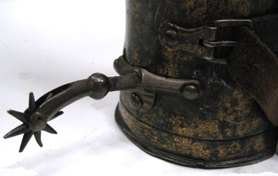 Av stål. Utsidan med sliten förgyllning och insidan svart med slagmärken. Sammanlagt 11 delar och sporre. Sporren nygjord.