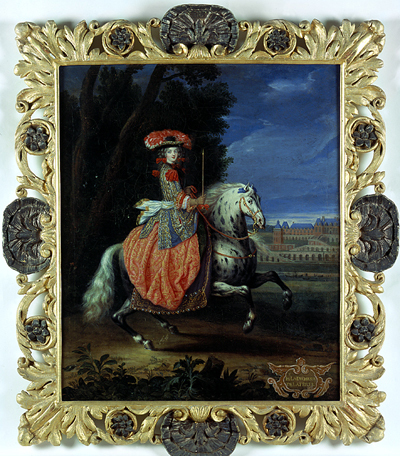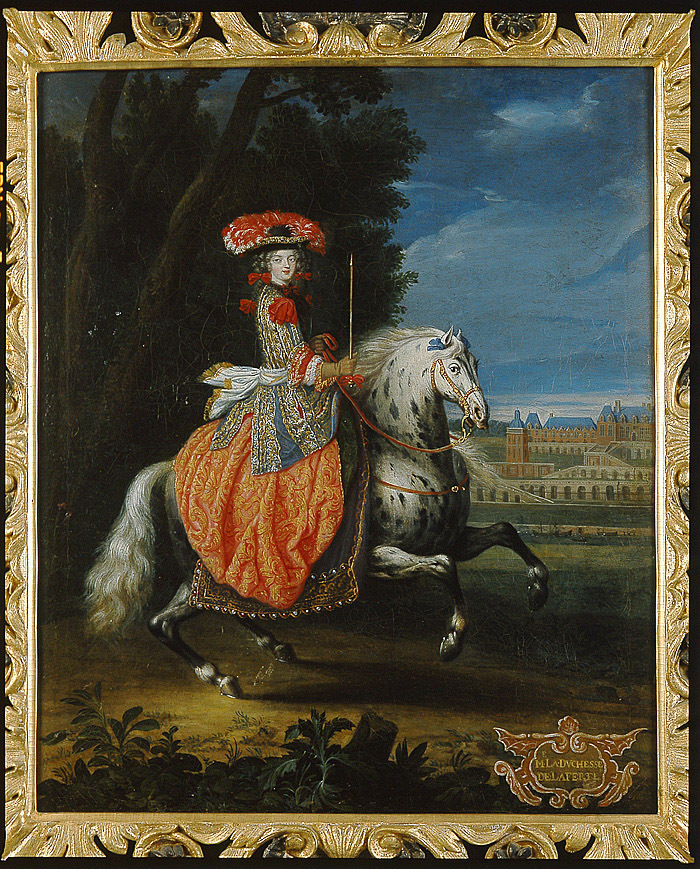 Oljemålning på duk. Helfigur till häst. Röd brokadklänning, blå, guld- och silverbroderad höftlång jacka. På dräkten och i håret röda rosetter. Svart hatt med röda och vita plymer. I midjan vitt, utfladdrande skärp. I händerna spö och tyglar. Vit- och svartfläckig häst med violett, broderat täcke. I fonden slottet Saint-Germain-en-Laye. Inskription: "M. La Duchesse de Laferte". På dukens baksida: "N56 Pour Monseigr Le Duc Daumont". Förgylld, snidad ram med akantusblad. En försilvrad mussla på vardera sidan. Ramlistens bredd 115 m m. Överst på ramens baksida "56" med blyerts. På lapp på spännramen "3524 Mr Lundberg Rent. Nat. rest ". På spännramen "H 24" eller "3824" med blyerts. Omkonserverad dvs. "relined" trots tidigare enl. tillståndsbedömning relativt väl utförd dubblering. Omspänd på ny kilram genom Institutet för Materialkunskap vis NM:s Skeppsholmsateljéer genom konservatorer Ola Westerudd, Peter Kerer och Helga Etzell enligt restaureringsbesked daterat 14.2.1968 Björn Hallström. Madame La Duchesse de la Ferte´ född 1654. Marie Isabelle Gabrielle Angelique de la Motte Houndancourt dotter till hertig Philippe, syster till hertiginnan d´Aumont gift med Henri-Francois de Senneterre, hertig de la Ferté, död 1703.