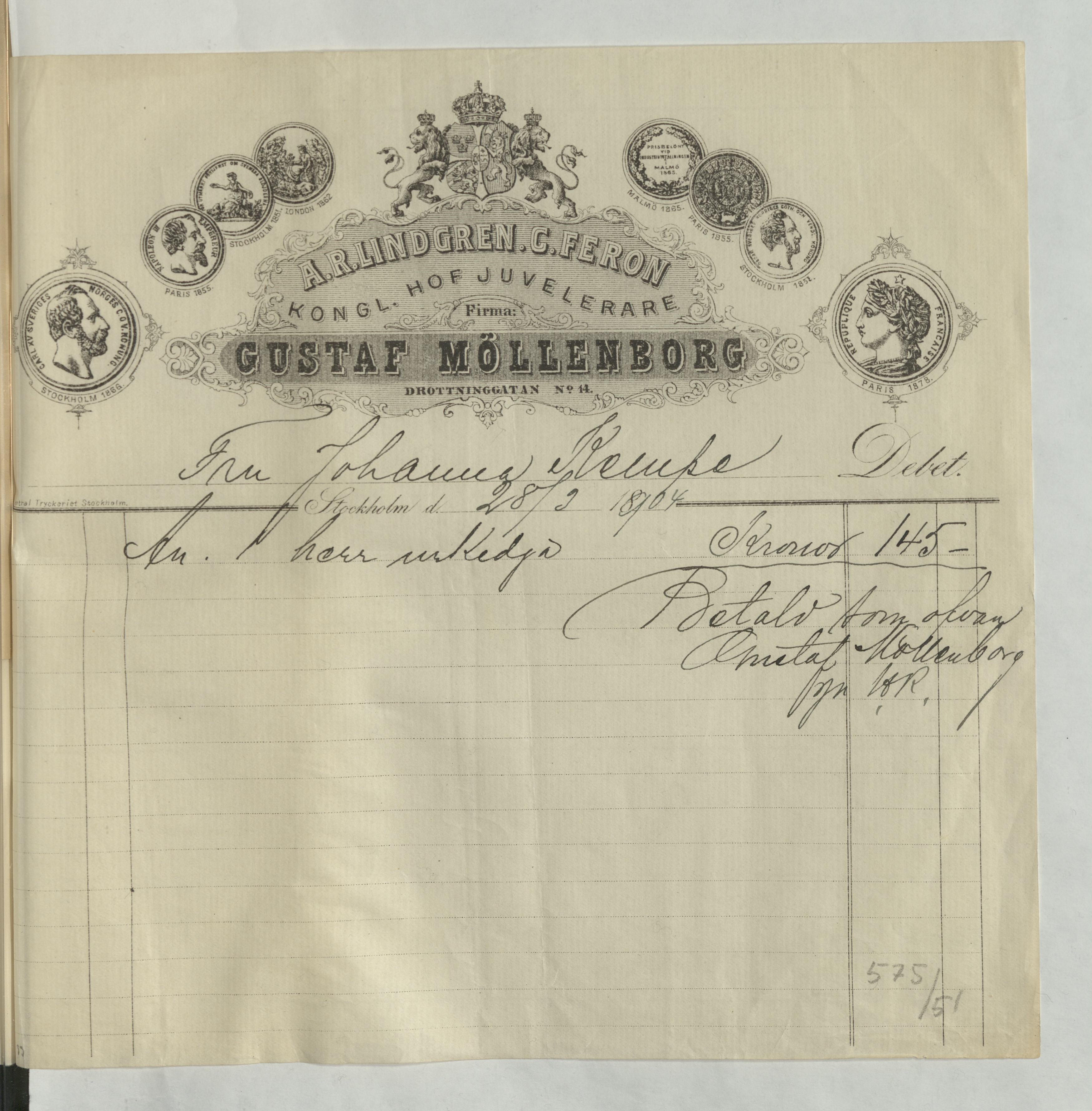 Kvitto från Gustaf Möllenborg, Juvelerare.