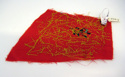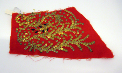 Trapetsformat fragment av röd kashmir. På tyget förekommer ett broderi av förgyllda paljetter föreställande bladoch rankor samt små blad av svart och grön silketråd.