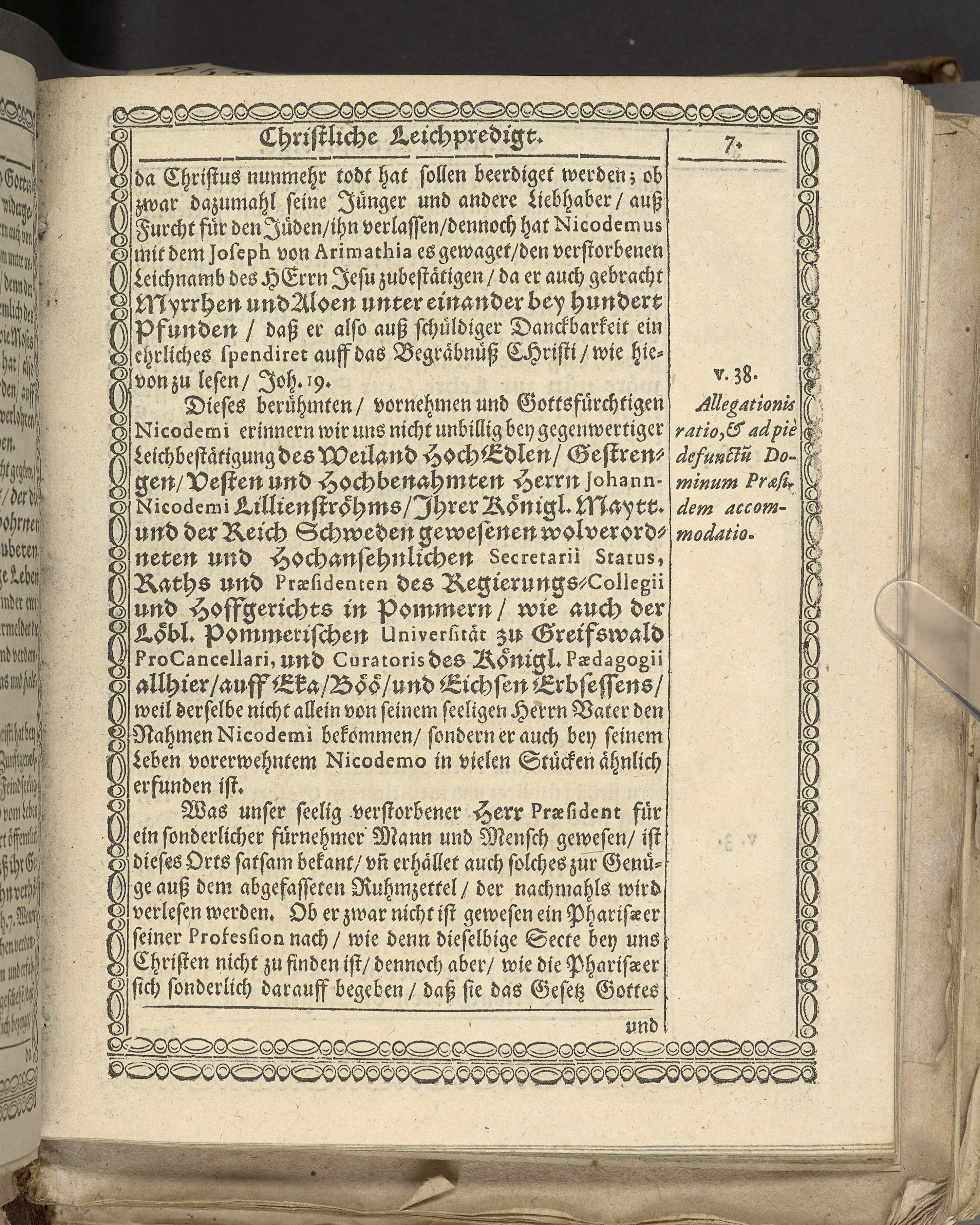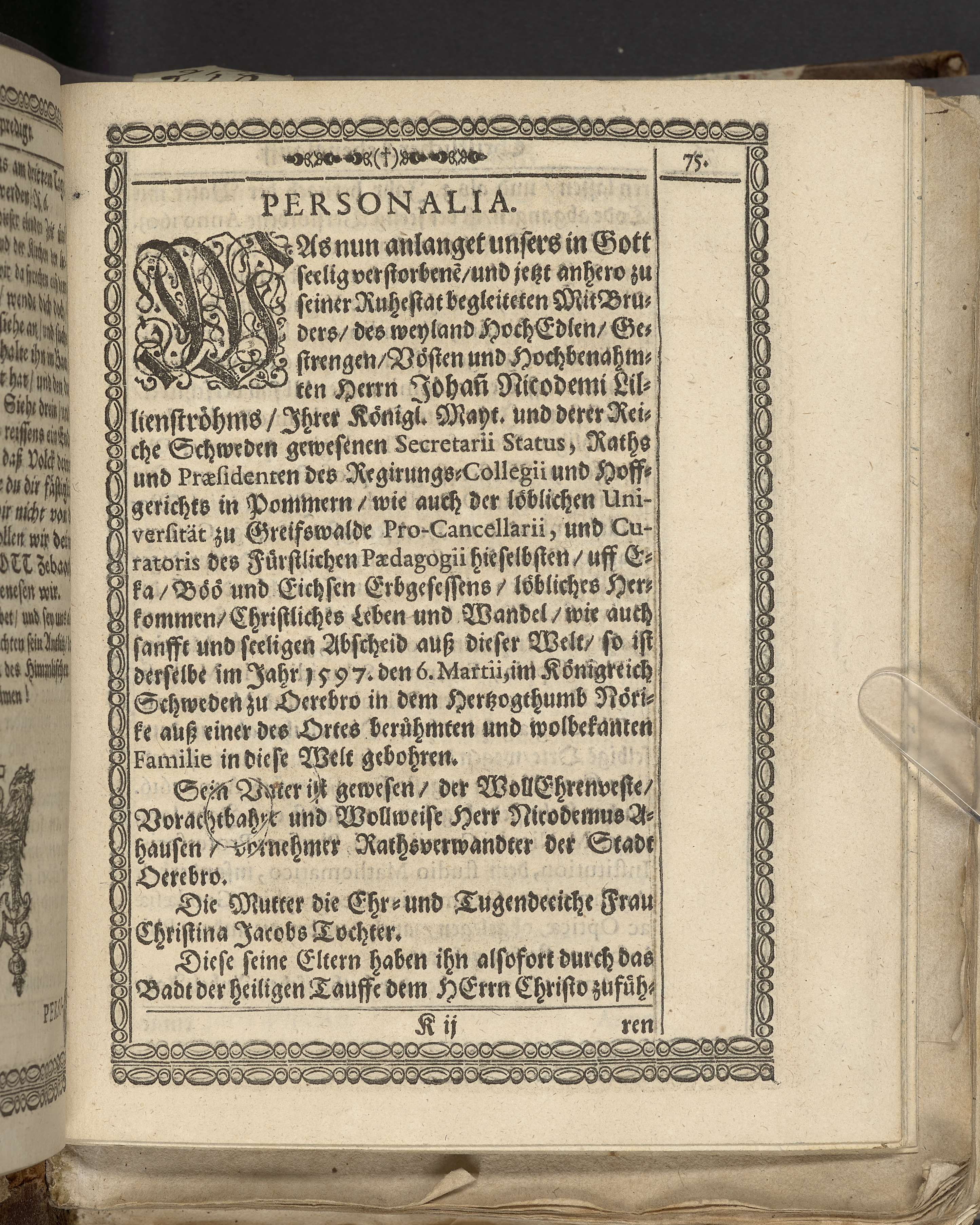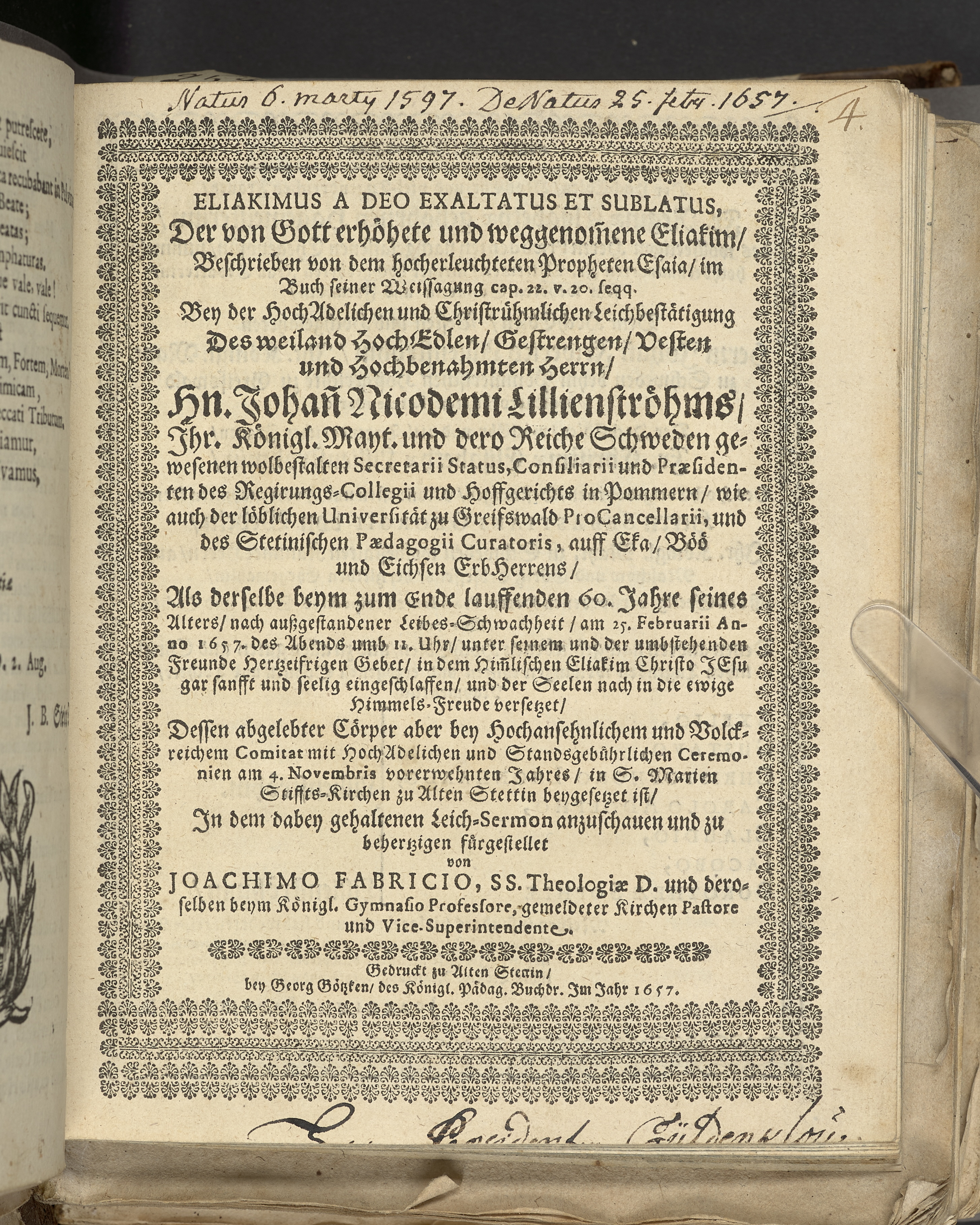 Eliakimus a Deo exaltatus et sublatus ... Bey der hochadelichen und christrühmlichen Leichbestätigund des ... Hn. Johan[n] Nicodemi Lillienströhms, Ihr. königl. Mayt. und dero Reiche Schweden gewesenen wolbestalten Secretarii Status ... auff Eka, Böö und Eichsen Erbherrens ... Dessen abgelebter Cörper ... am 4. Novembris vorerwehnten Jahres, in S. Marien Stiffts-Krichen zu Alten Stettin beygesetzet ist ... von Joachimo Fabricio ... Gedruckt zu Alten Stettin, bey Georg Götzken, des königl. pådag. Buchdr. Im Jahr 1657.