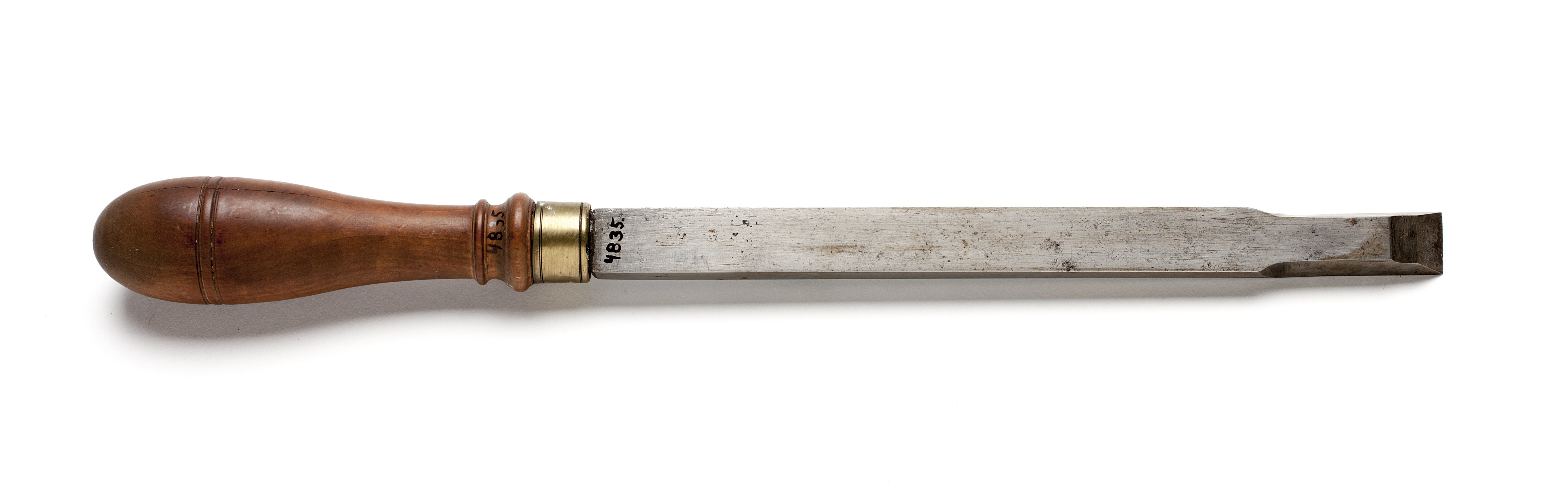 Klinga med rektangulär, i änden trapetsoidisk genomskärning. Svarvat skaft av päronträ med två vulster nedtill ("skoklostertyp"). Mässingsring.