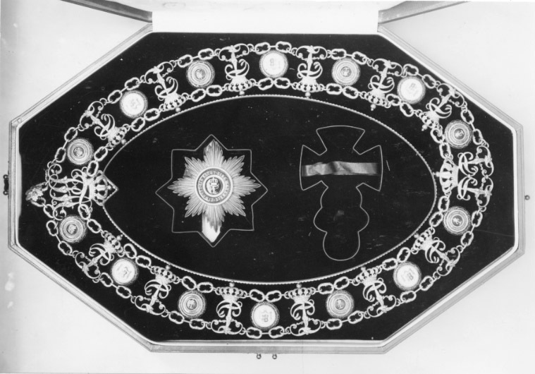 Åttkantigt etui av trä med svagt fasade kanter. Utvändigt klätt med röd saffian, påundersidan med blålila, skinnmönstrat papper. Pressad linjedekor, på locket dessutom linje iguldpressning samt mittpå locket Oldenburgs vapen. Två gångjärn samt knäpplås av gulmetall, två av låsen saknar knäppen (ett löst inutietuiet). Locket invändigt klätt med vitt siden. I underdelen ursprungligen fast insats kläddmed mörkt blålila sammet, urtag för kedja, mittpå insatsen oval förhöjning med urtag förkraschan och ordenstecken, höga kanter runt urtagen samt runt ovalen, klädda med rött siden,runt nederkanten dessutom snodd av vitt silke. På locket klistrat blåvit etikett med bläckpåskrift: "Oldenburg".