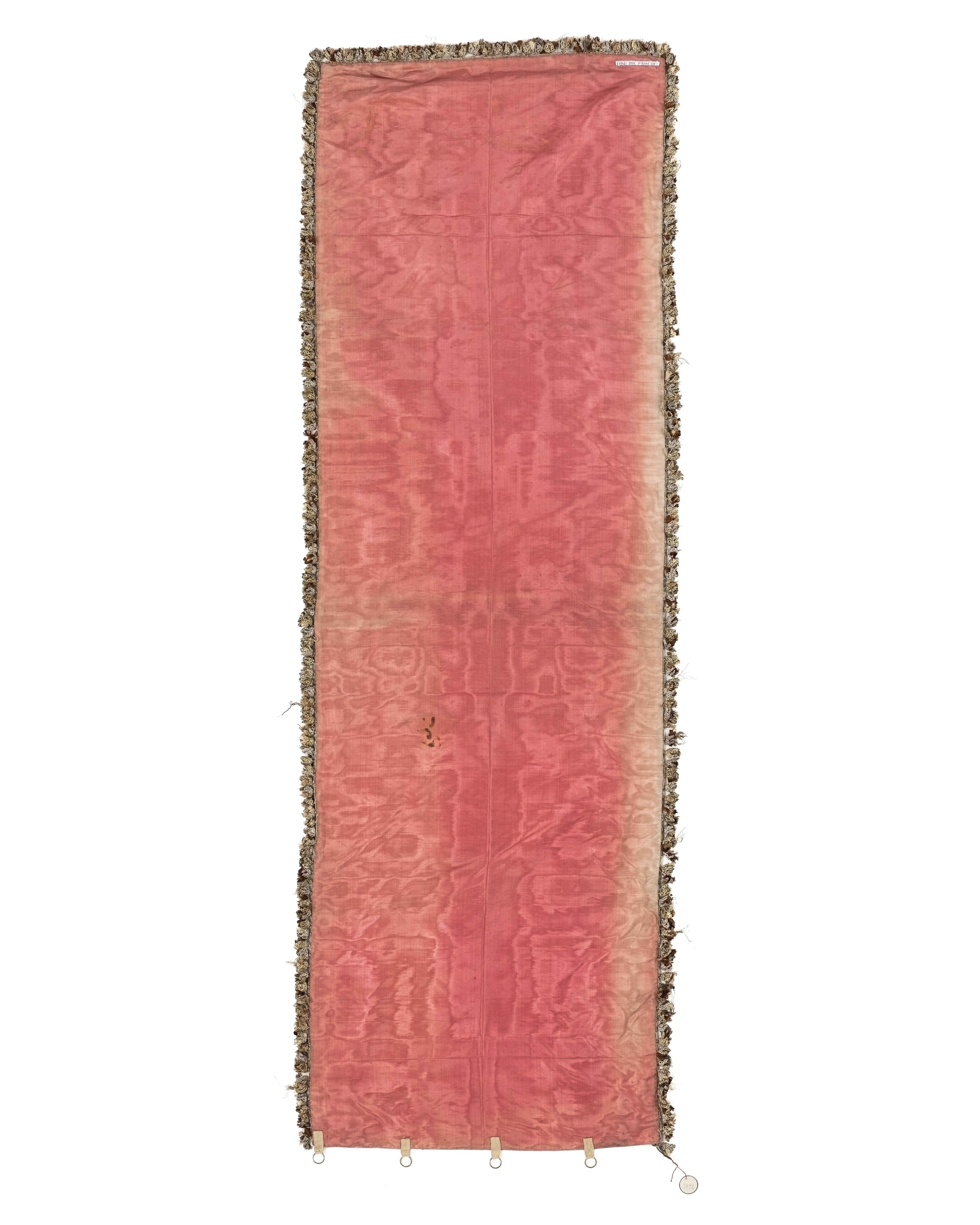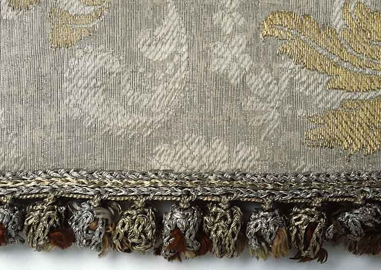 Sängomhänge bestående av två tygvåder, tyget är vävt i silke där en våd är 537 mm bred. Tyget är vävt i kypert med ett diagonalt blommönster i gul och vit silketråd. Kantbården är 35 mm bred och är flätad i guld- och silvertråd. Foder av röd sidenmoare.
