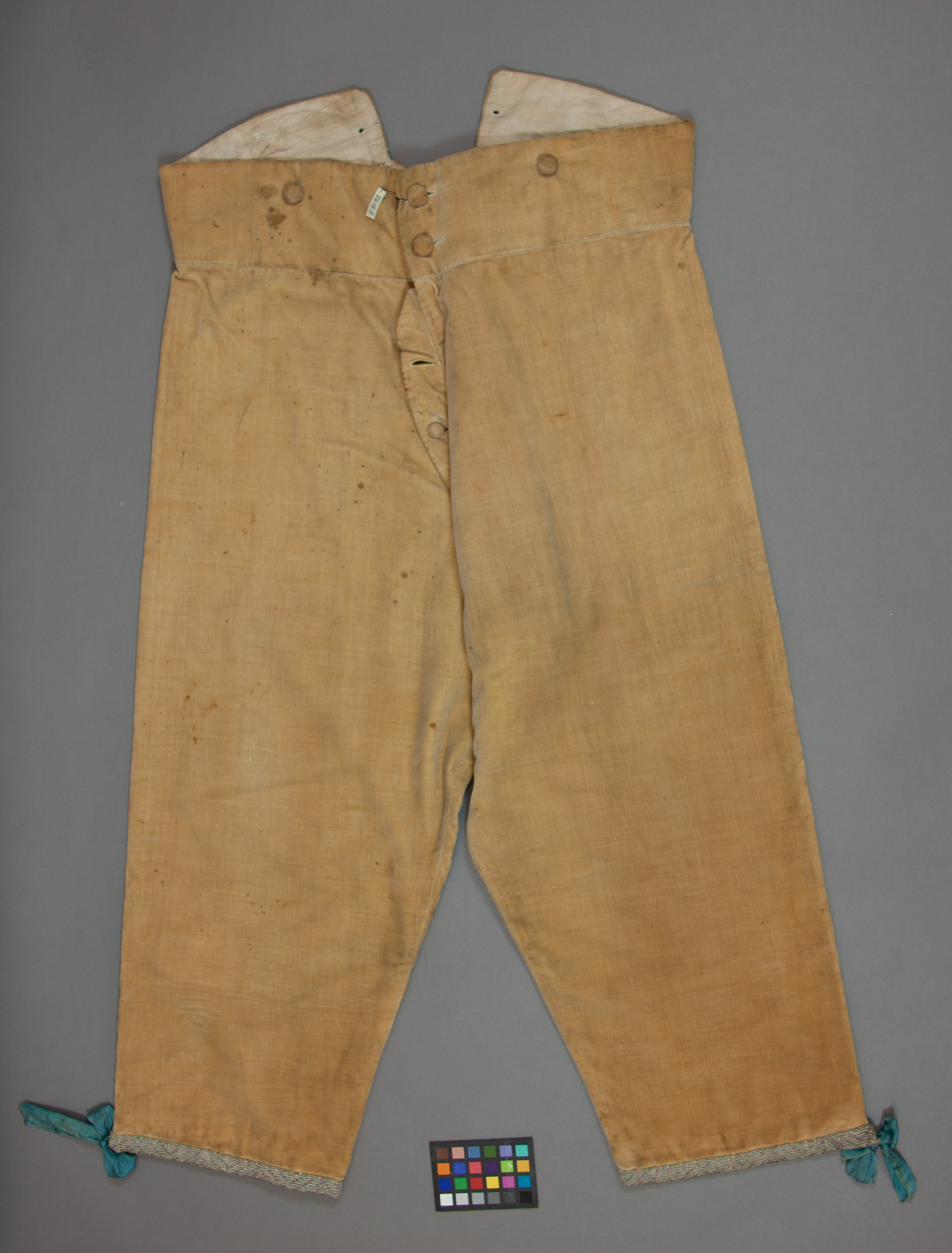 Byxor sydd av gult sammet. Modellen är rak och rymlig. Linningen är 85 mm bred och i omkrets 850 mm. Fyra knappar beklädda med gult sammet fastsydda fram på linningen. Byxan har en gylf som är 190 mm lång som knäpps ihop med en två knappar. Benvidden nedtill är i omkrets 400 mm. Benets nedre kant är dekorerad med silvergalon och ljusblå sidenrosett, 20 mm bred. Fodret är sydd av vitt linnelärft.