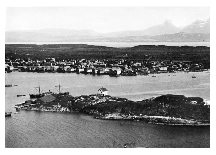 Vy över Bodö, Norge. Fotografierna LXVI:C.01.-33. är inköpta av Wilhelmina von Hallwyl, f. Kempe, i Trondheim, Tromsö och Hammerfest under en resa till Norge tillsammans med maken Walther von Hallwyl, modern Johanna Kempe, döttrarna Ebba, Ellen och Irma, Walthers svägerska Ester von Hallwyl, f. von May, från Schweiz, med sina döttrar Hilda och Irma samt fröknarna Caroline Pflaum och Ida Uhse. Gruppen reste med ångbåten Capella från Trondheim till Nordkap och åter till Trondheim, 1-15 juli 1886. Uppgifterna kommer från Ida Uhses reseanteckningar.