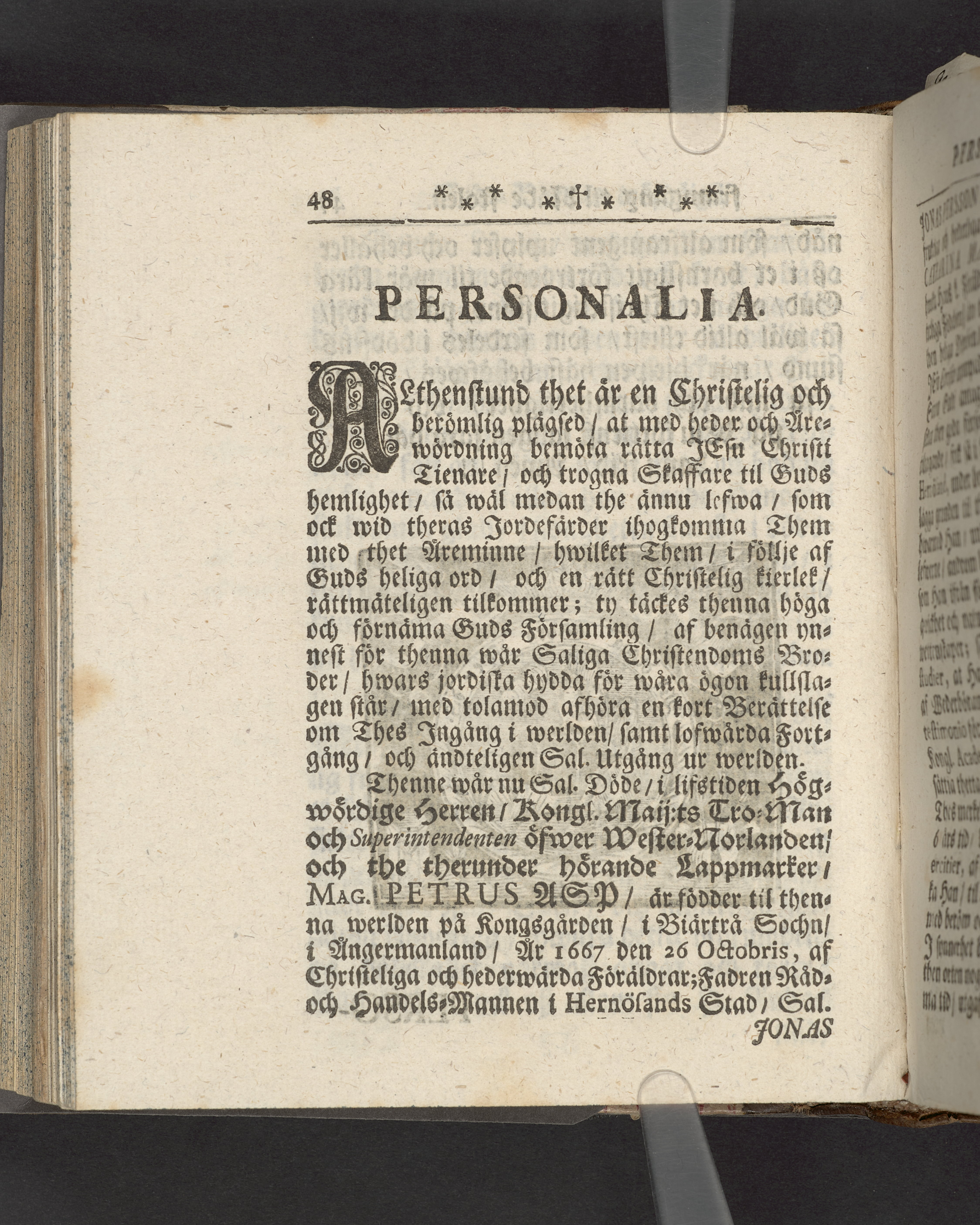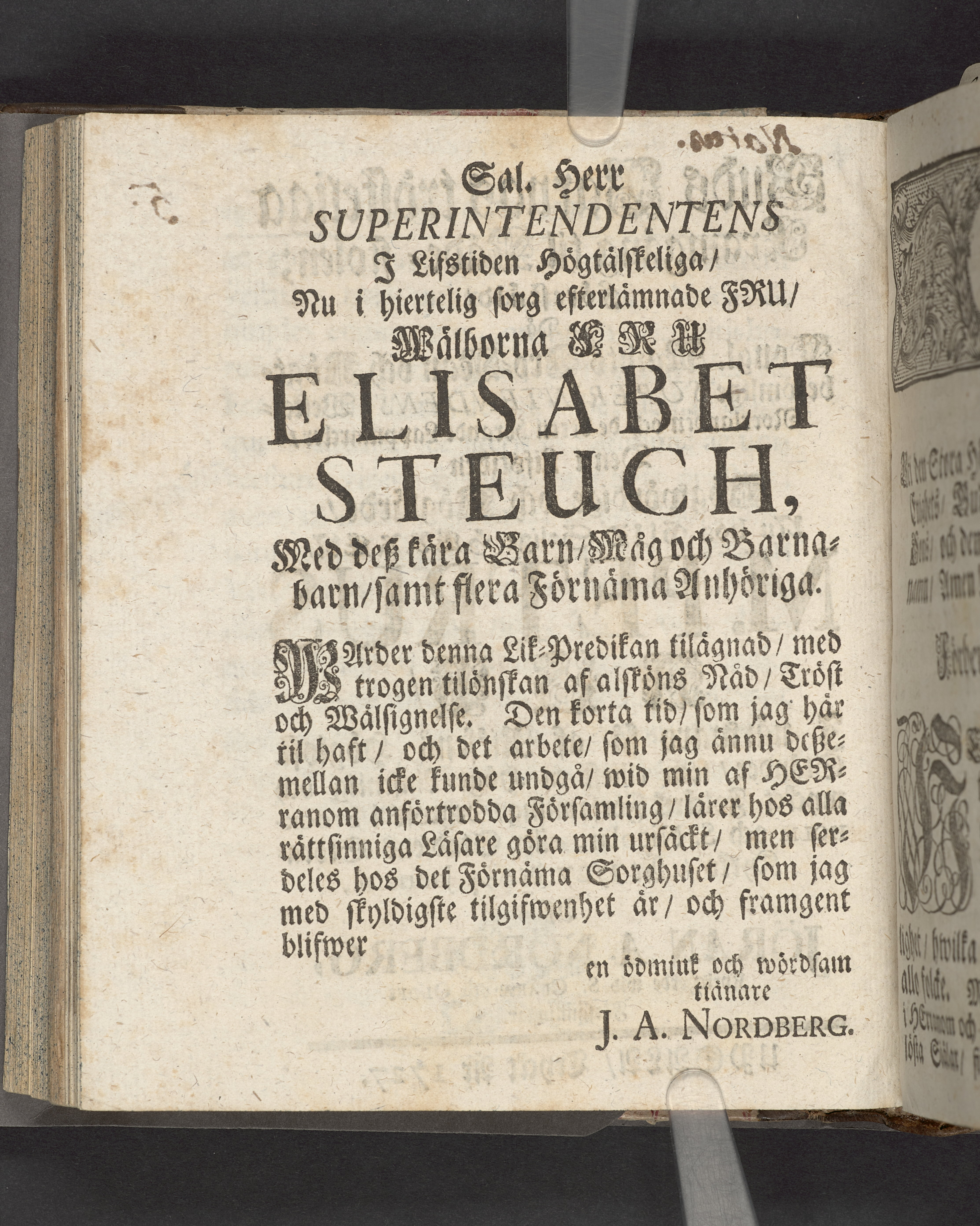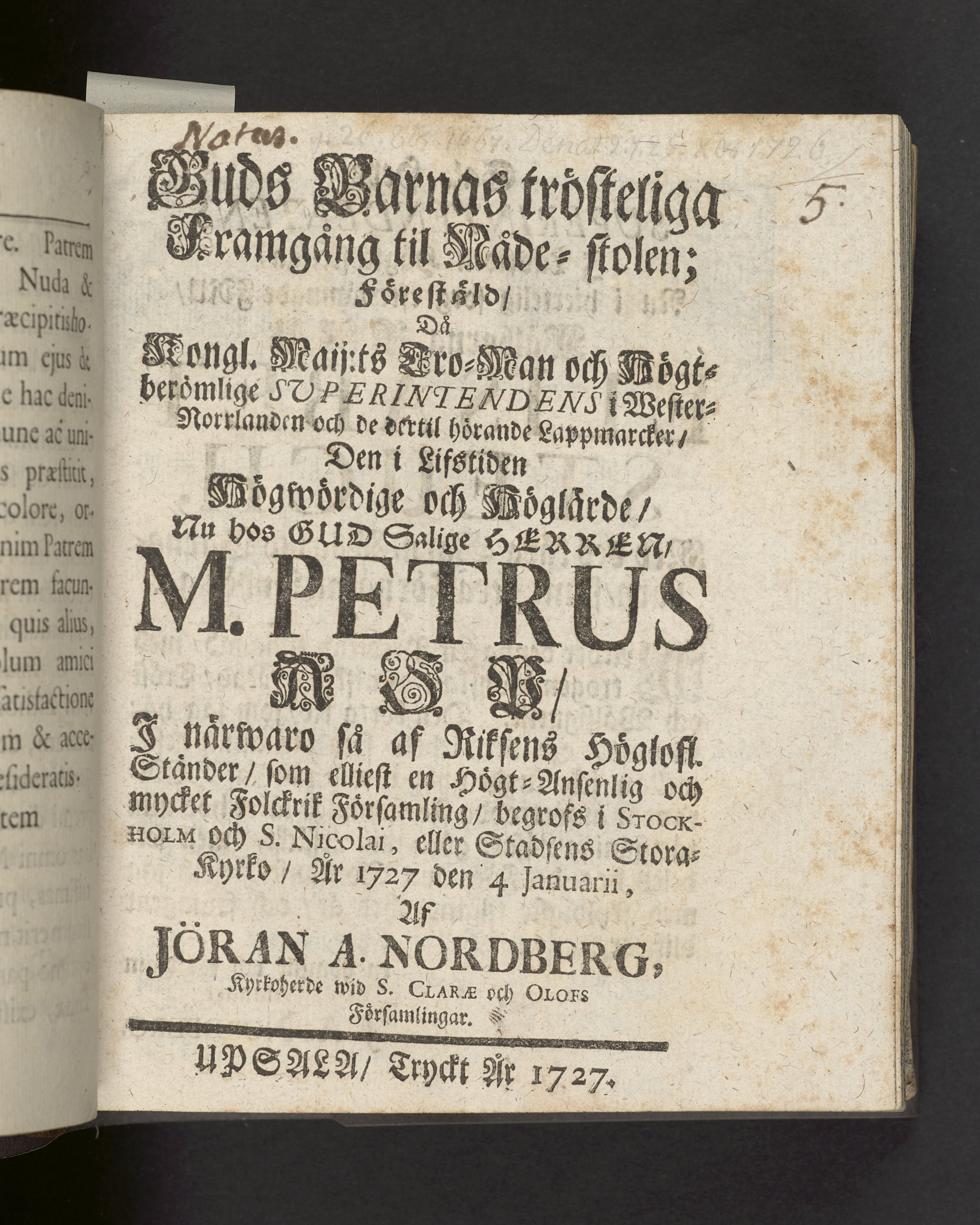 Guds barnas trösteliga framgång til nåde-stolen; förestäld, då kongl. maij:ts tro-man och högtberömlige superintendens i Wester-Norrlanden och de dertil hörande lappmarcker, den i lifstiden högwördige och höglärde, nu hos Gud salige : herren, m. Petrus Asp, i närwaro så af riksens höglofl. ständer, som elliest en högt-ansenlig och mycket folckrik församling, begrofs i Stockholm och S. Nicolai, eller stadsens Stora-kyrko, år 1727 den 4 januarii, af Jöran A. Nordberg kyrkoherde wid S. Clarae och S. Olofs församblingar. Upsala, tryckt år 1727.