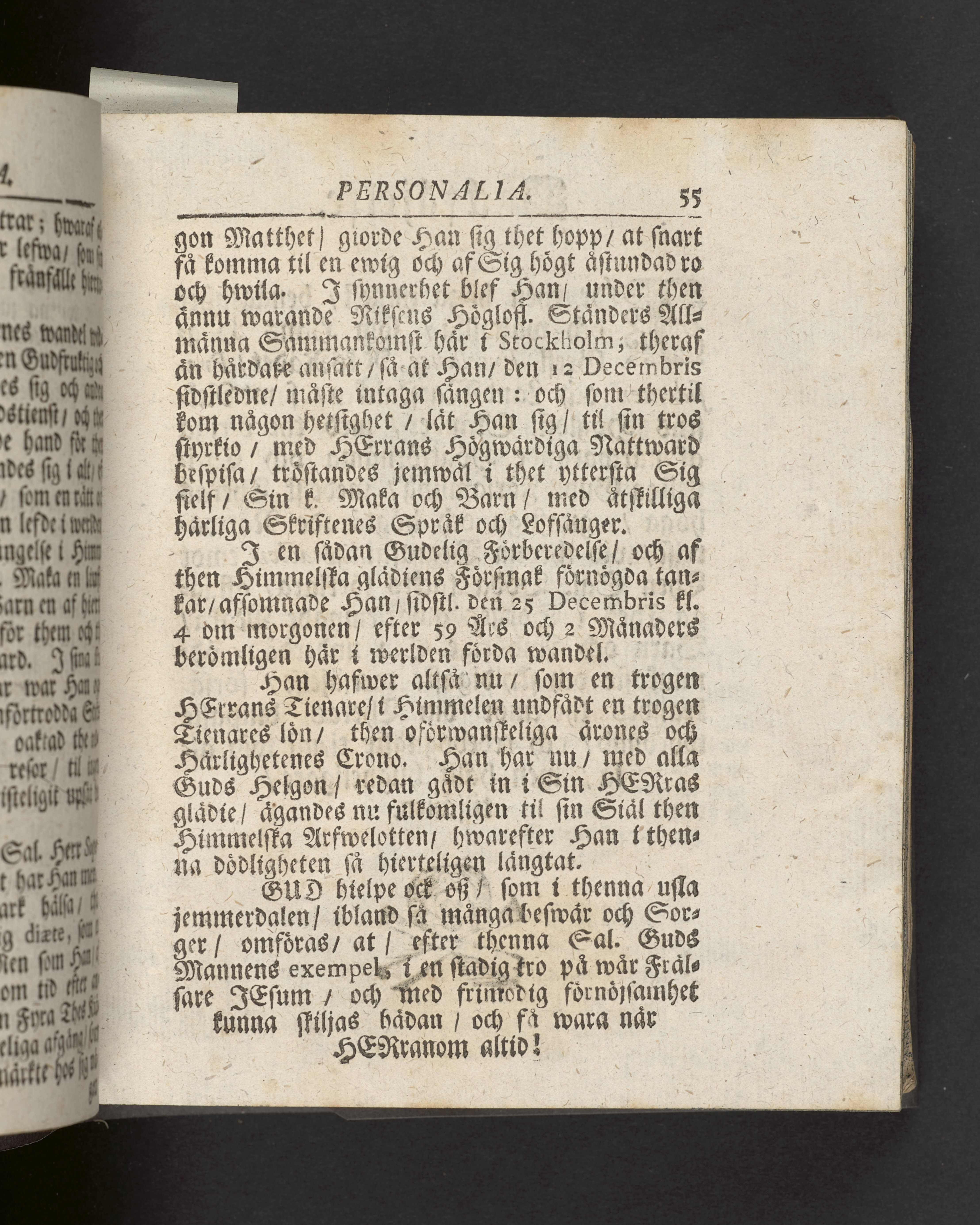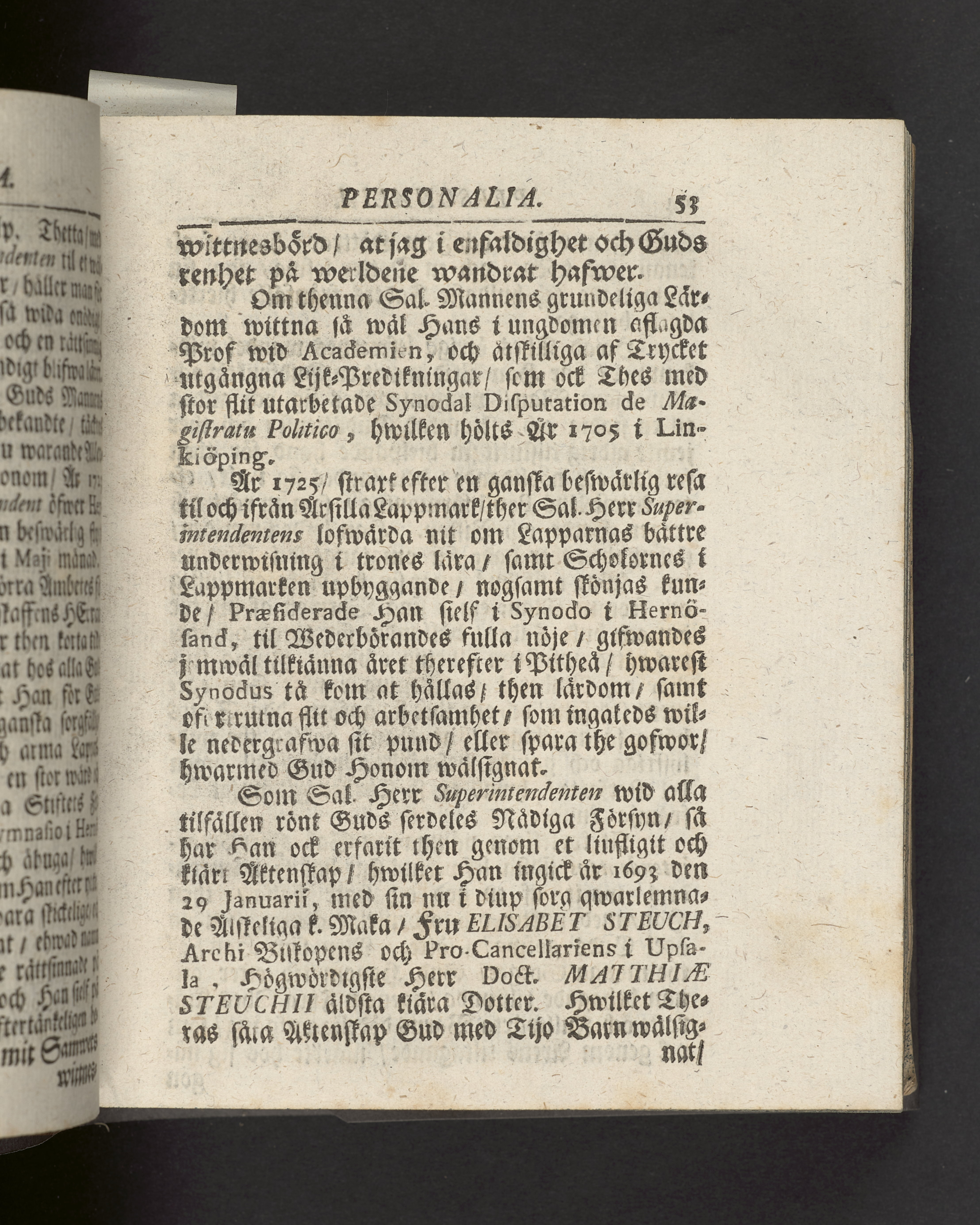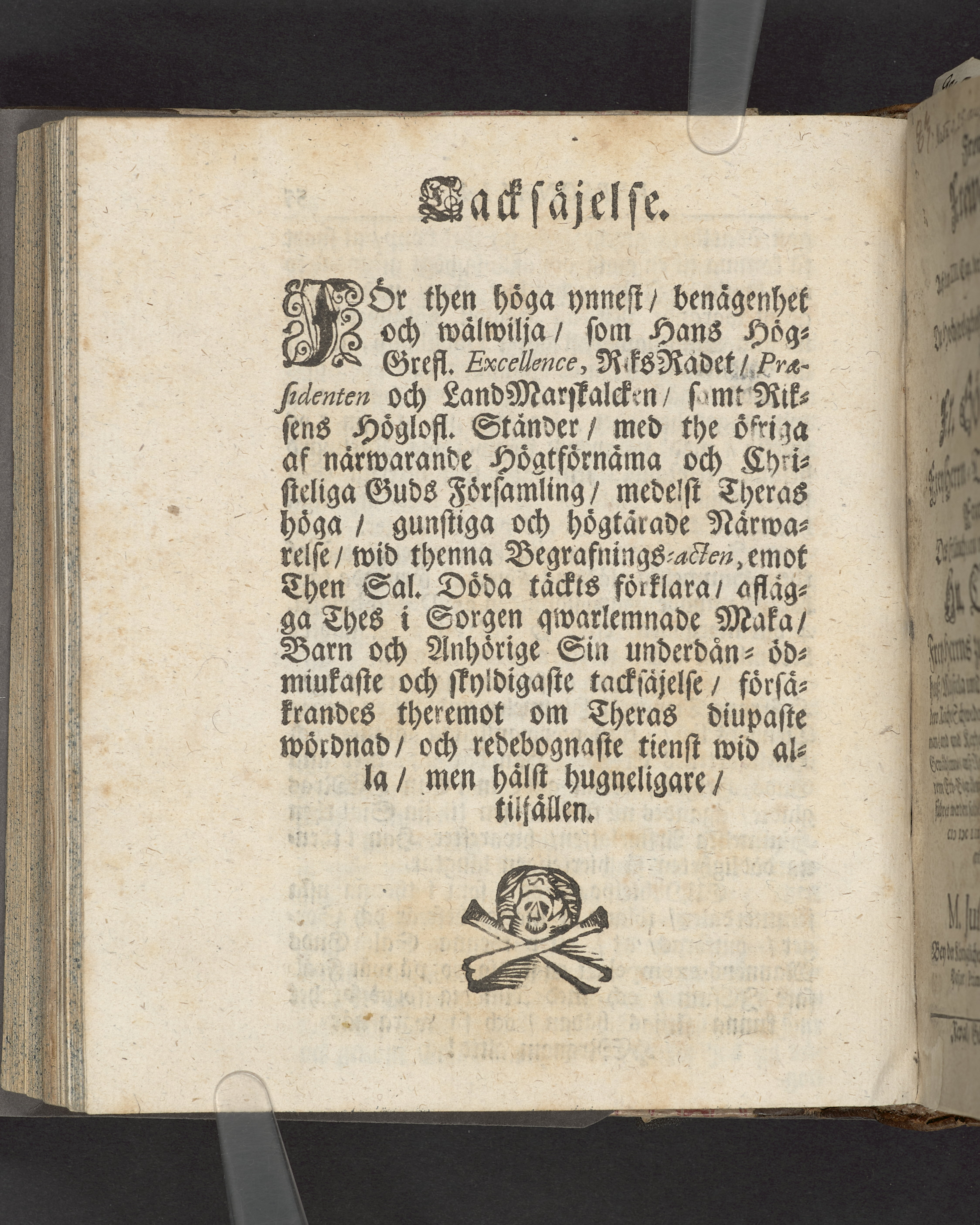 I sammelband med 26 tryck. Högst upp på titelsidan anteckning med uppgifter om födelse- och dödsdatum för den avlidna. Snitten stänkta i blått.