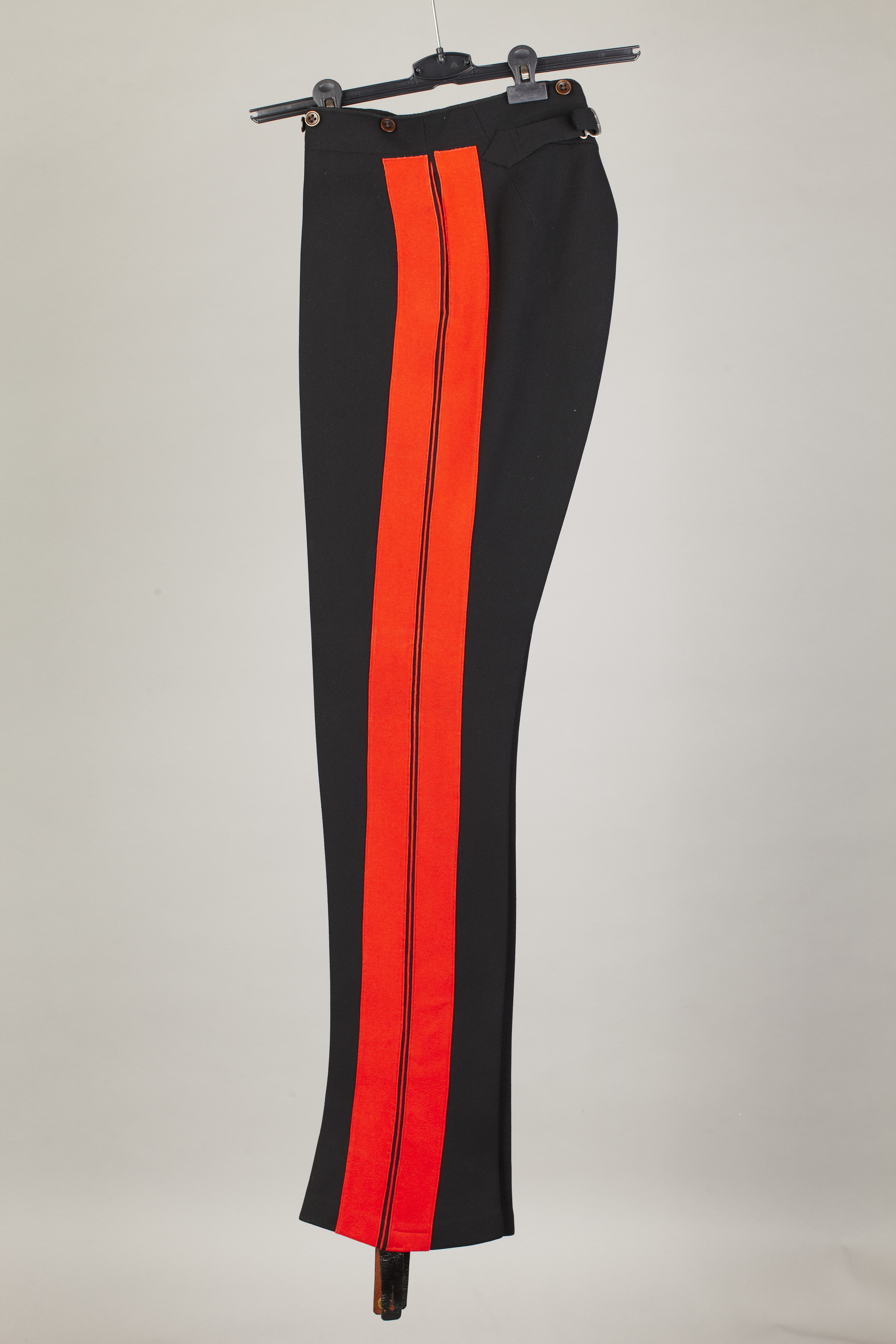 Långbyxor av svart yllediagonal med två revärer av rött kläde med röd klädespaspoal emellan. Gylf med dold knäppning med fyra mörkbruna plastknappar, d: 14 mm och en som föregående, d: 15 mm. Utefter linningskanten sex knappar, som föreg. Baktill spänntampar med sölja. Två sidsömsfickor. Nedtill på byxbenen hällor av svart lackskinn, med knapphål och dubbelknapp av mässing. Linningsfoder av vitt siden med smala svarta ränder. Fickfoder av bomullssatäng.