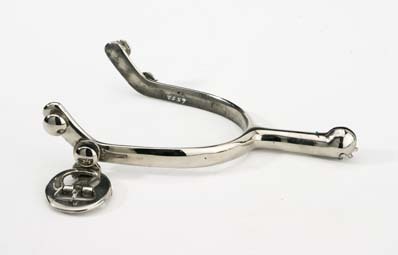 Sporre av förnicklat stål. U-formade skänklar med nedåtböjda ytterändar med vardera två knappar på hals. På den ena finns rund sölja av förnicklat stål. Rak hals, 46 mm lång, med rundad ytterände med stjärnformig klinga med 8 taggar.